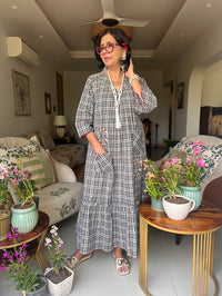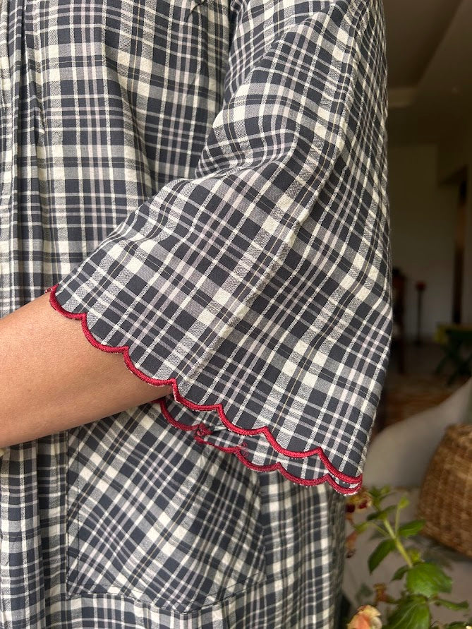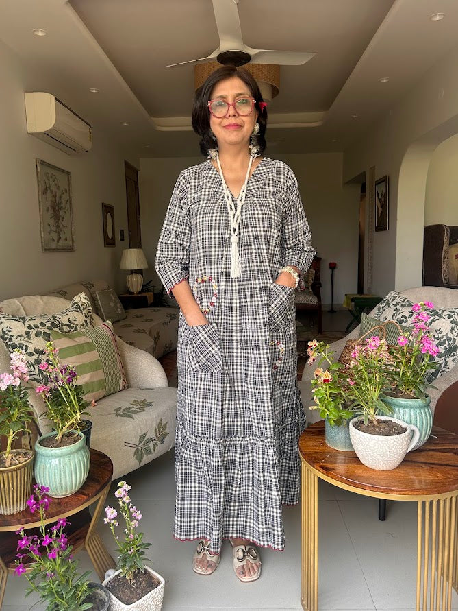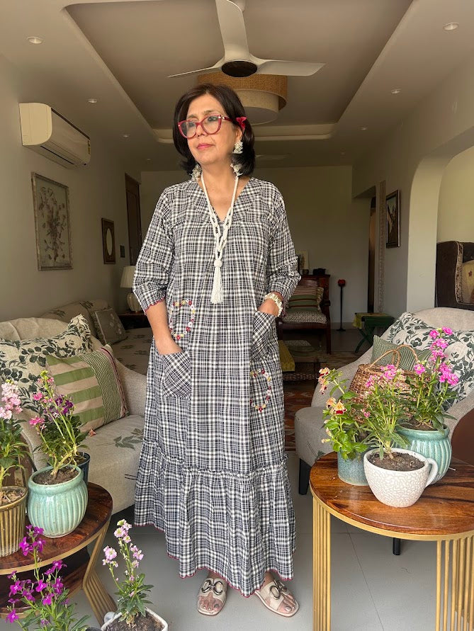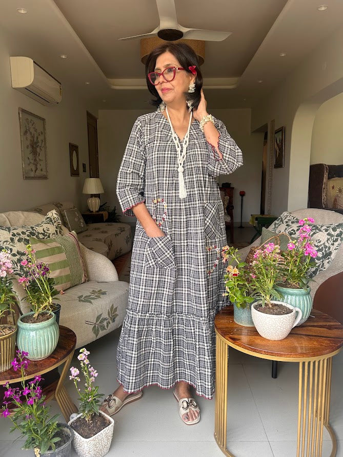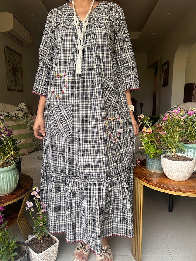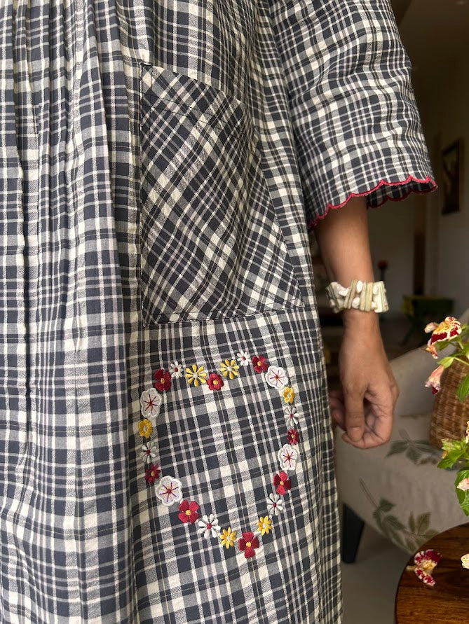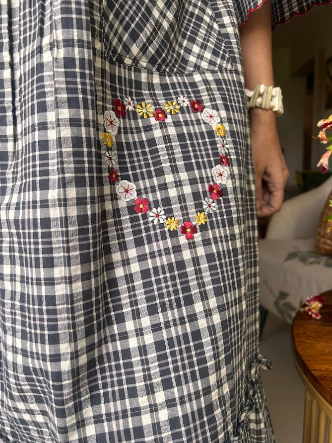 A very comfortable cotton checks dress with intricate floral hearts embroidery and pockets.