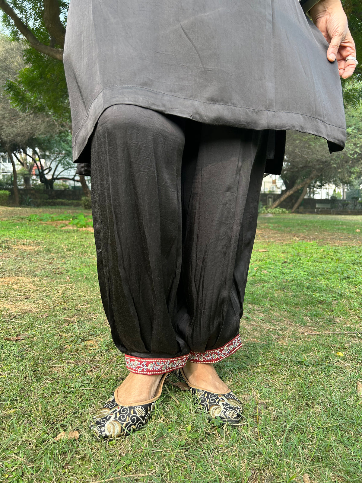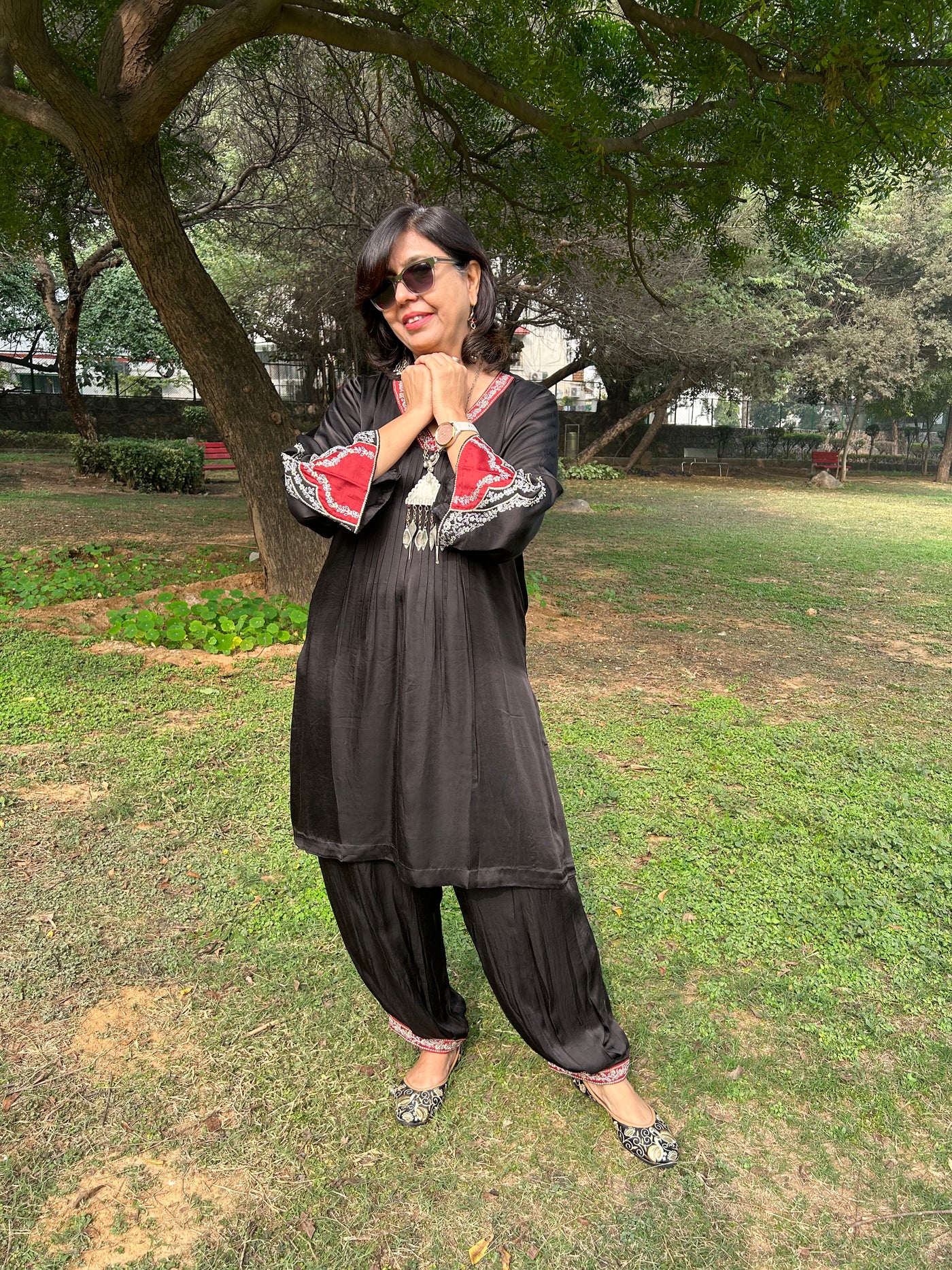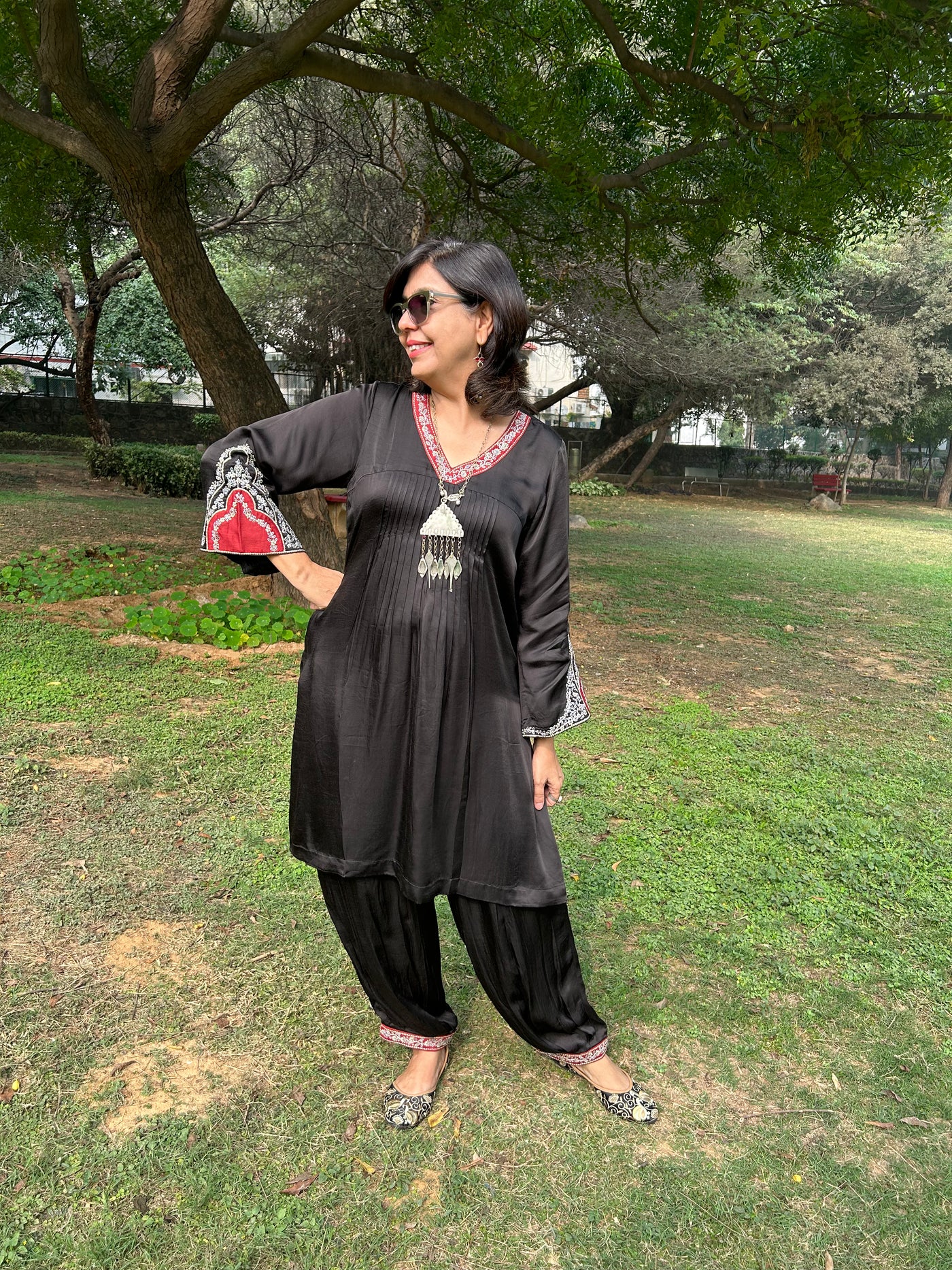 A modal satin Co ord set with intricate Tilla and thread embroidery on the neck, sleeves, back and bottom with pleating detailing is paired with a pleated pant salwar with pocket.