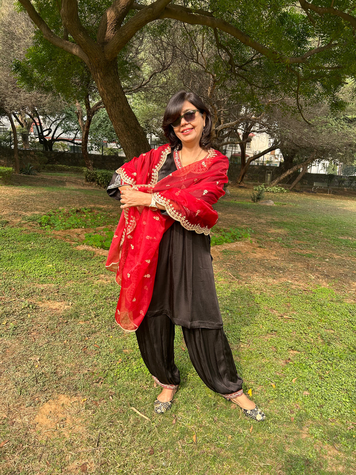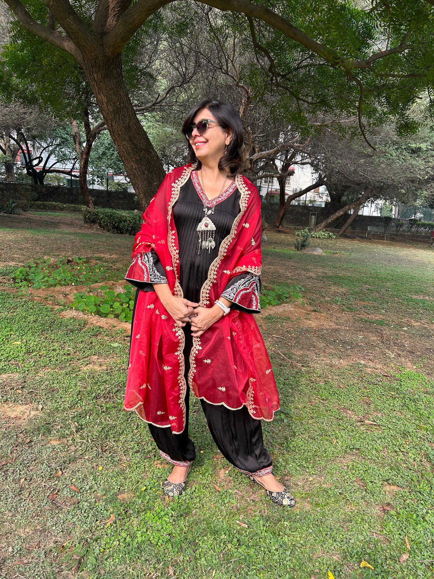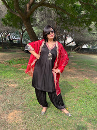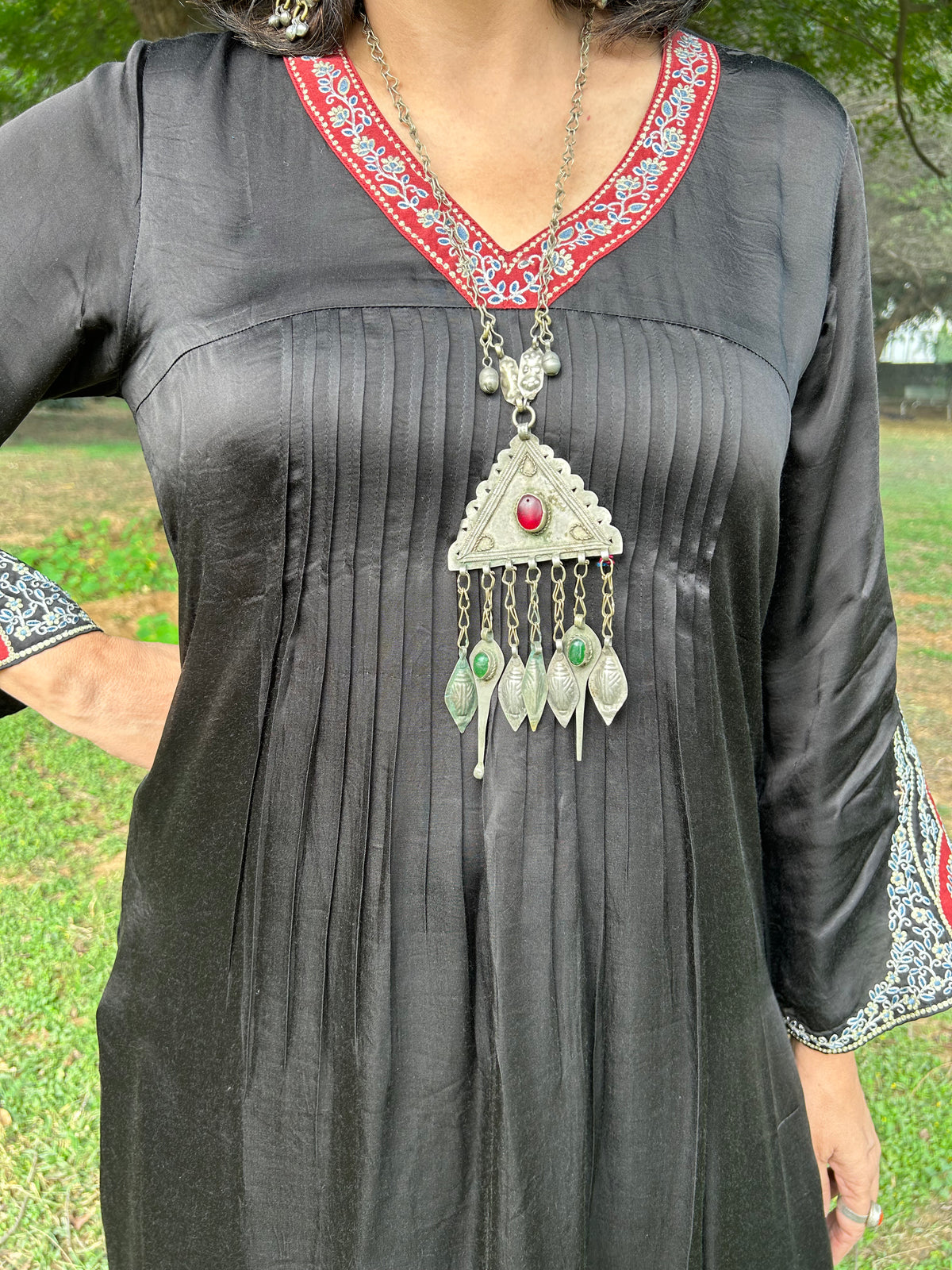 A modal satin Co ord set with intricate Tilla and thread embroidery on the neck, sleeves, back and bottom with pleating detailing is paired with a pleated pant salwar with pocket.