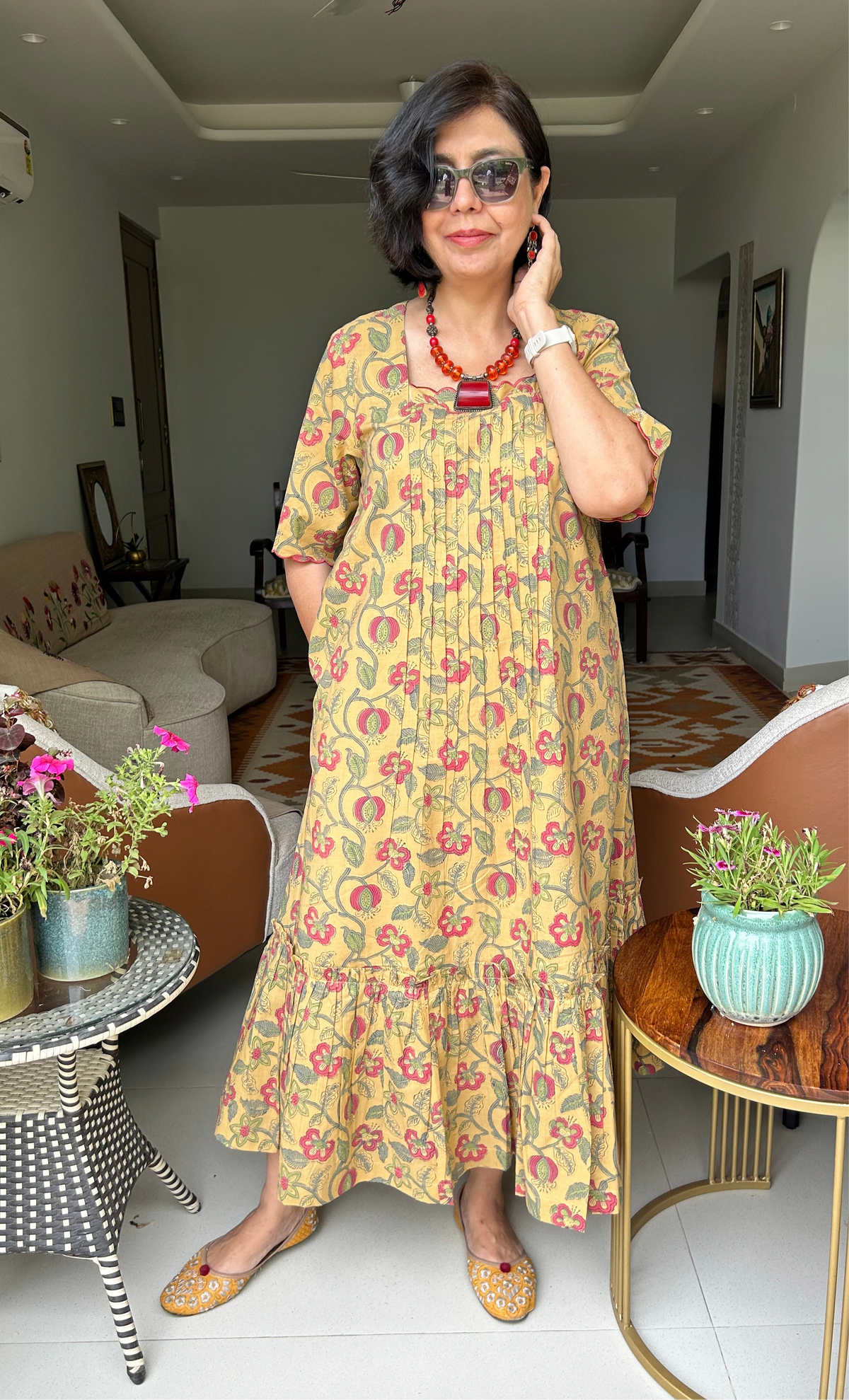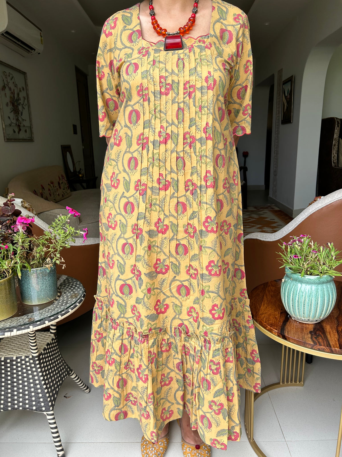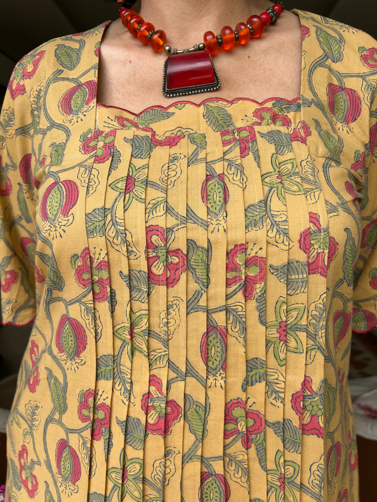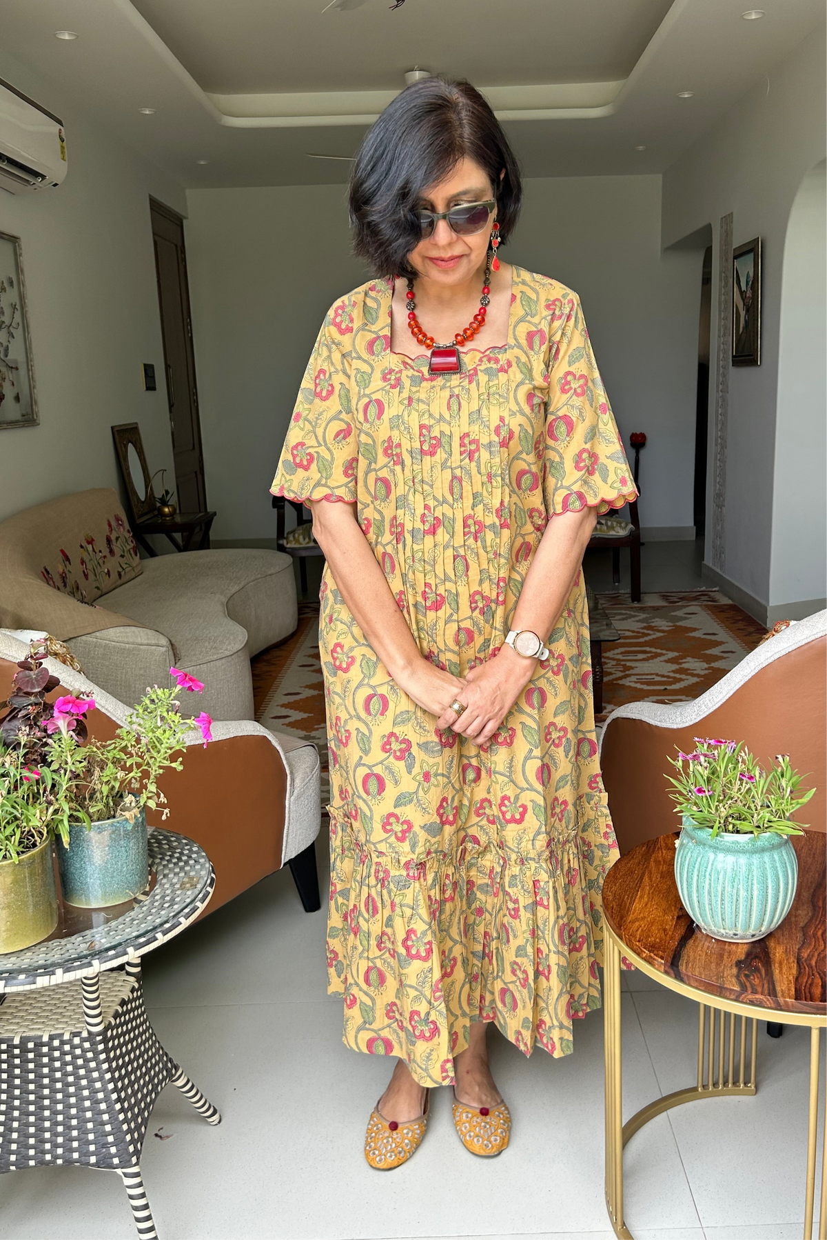 A pure soft Handblockprinted cotton dress with pocket, scalloping and embroidery detailing.