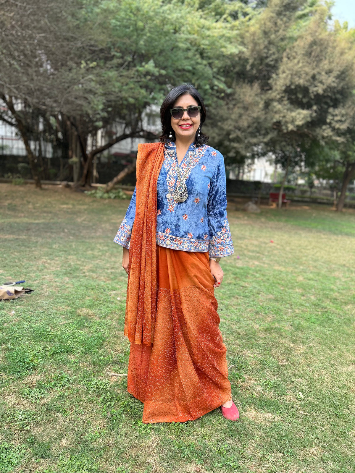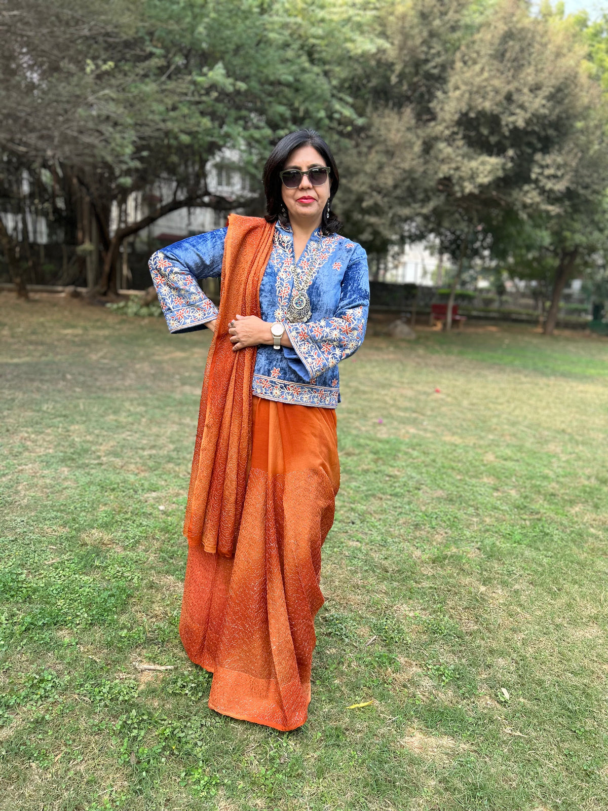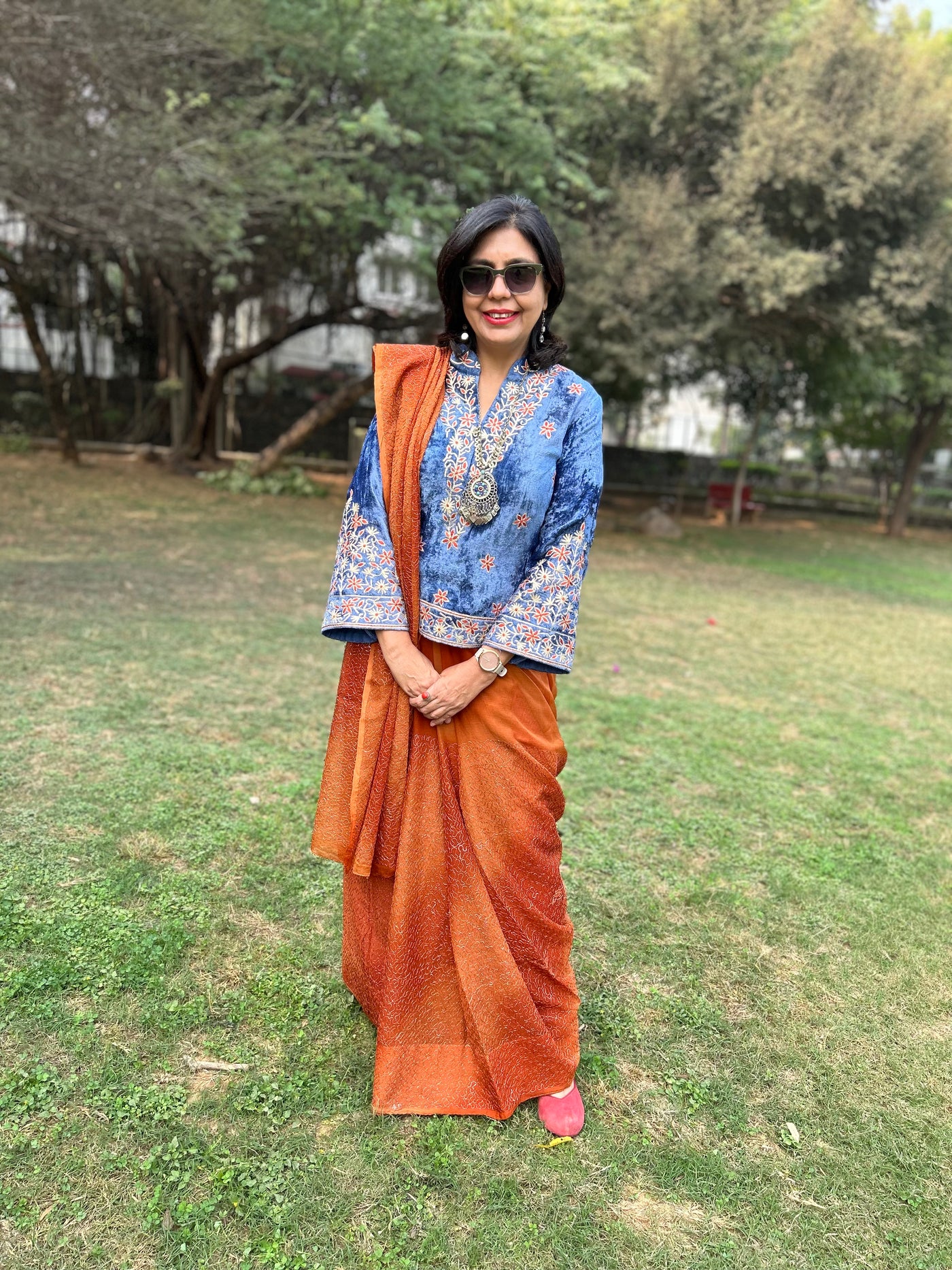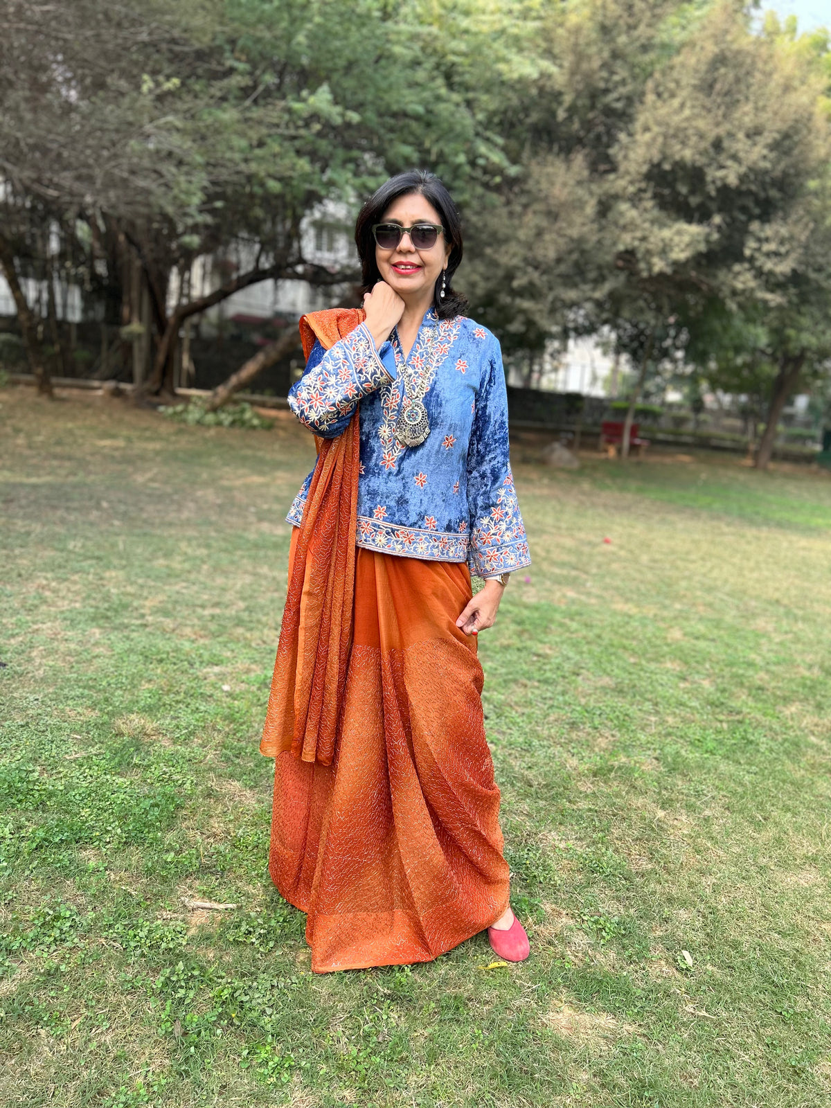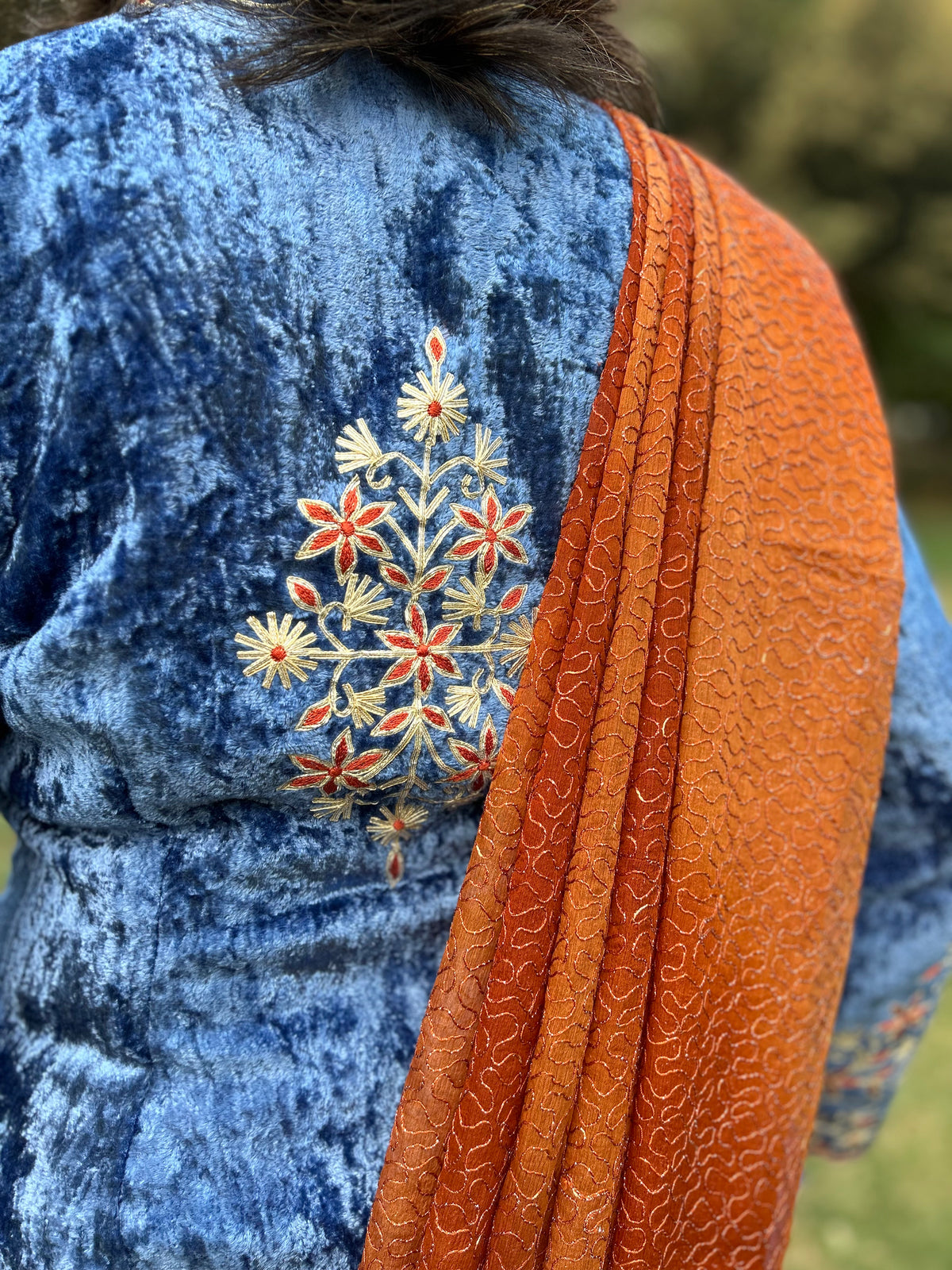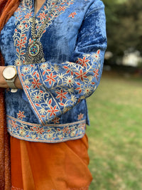 A velvet blouse with intricate Gota, thread embroidery on the front, sleeves, back and collar with zip zip opening.
