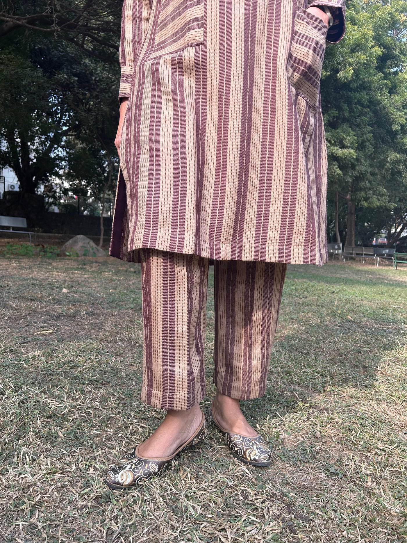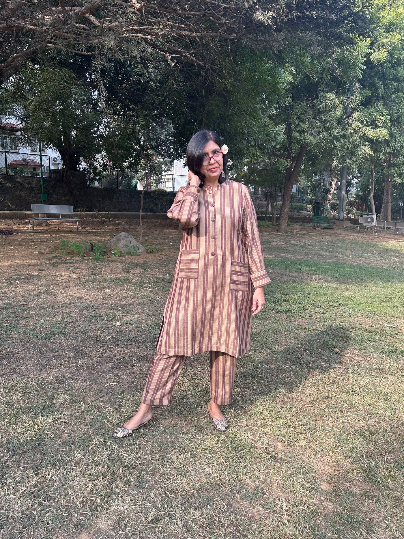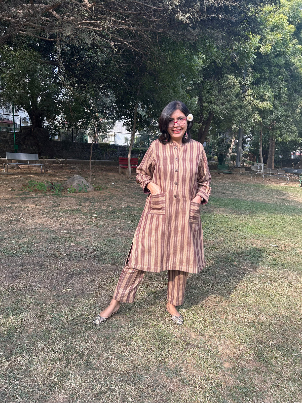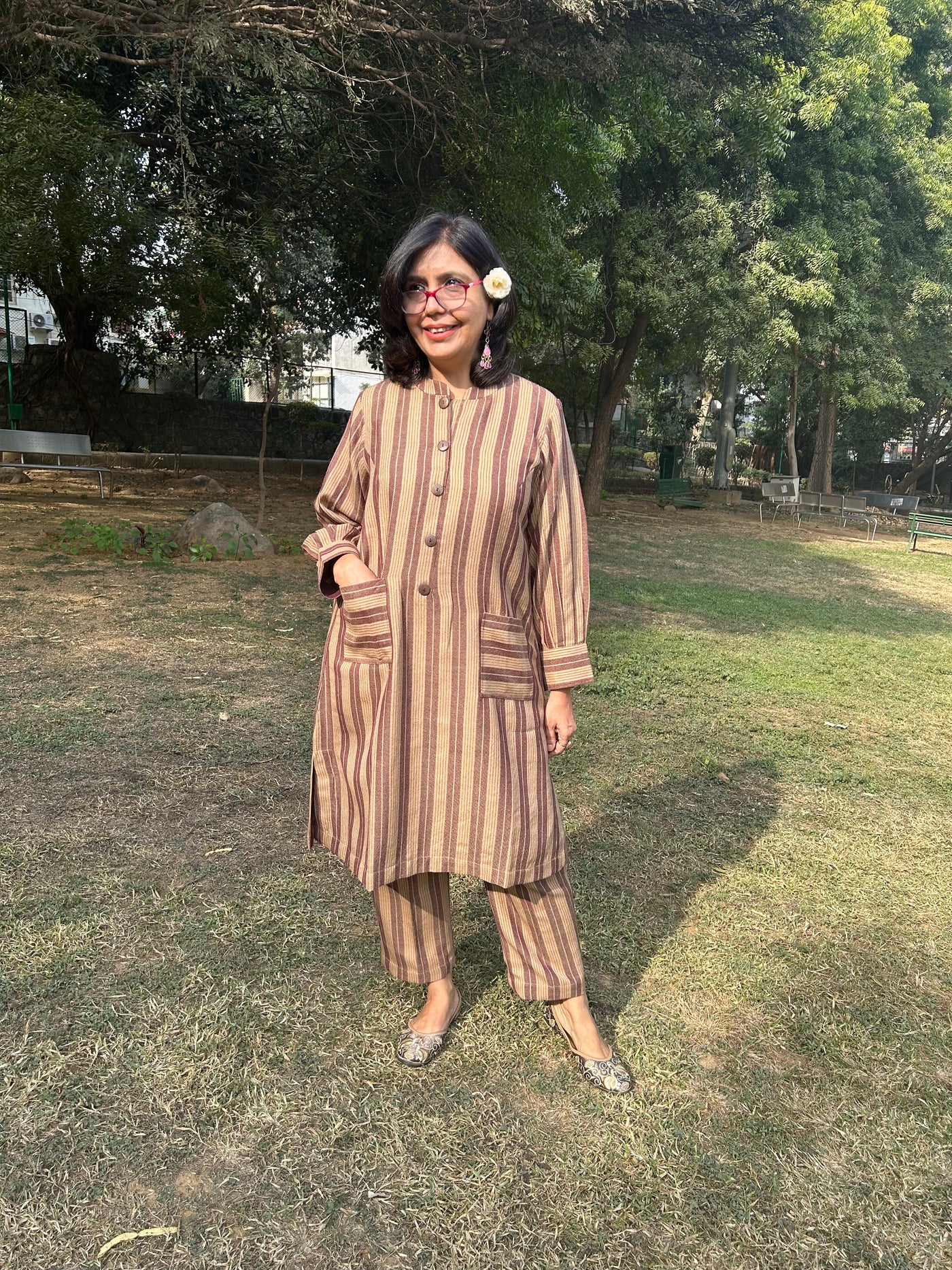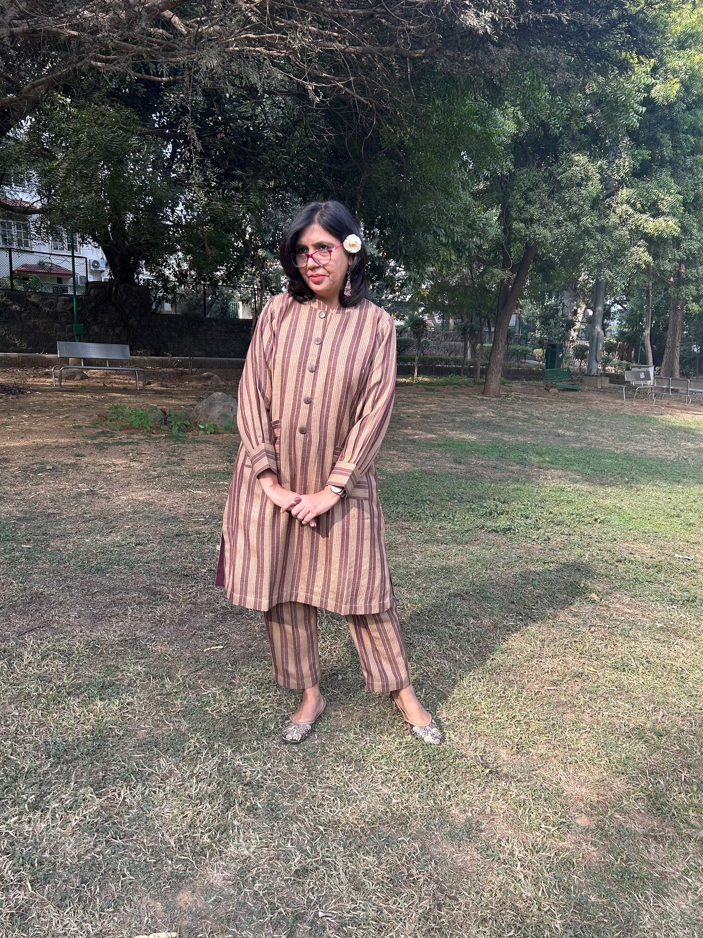 A pure merino wool Co ord set handwoven on the loom by skilled women artisans from the beautiful Kullu valley with buttons , cuffs , pockets and contrasting facing detailing is paired with pants with pocket to make you warm and cosy in winter.