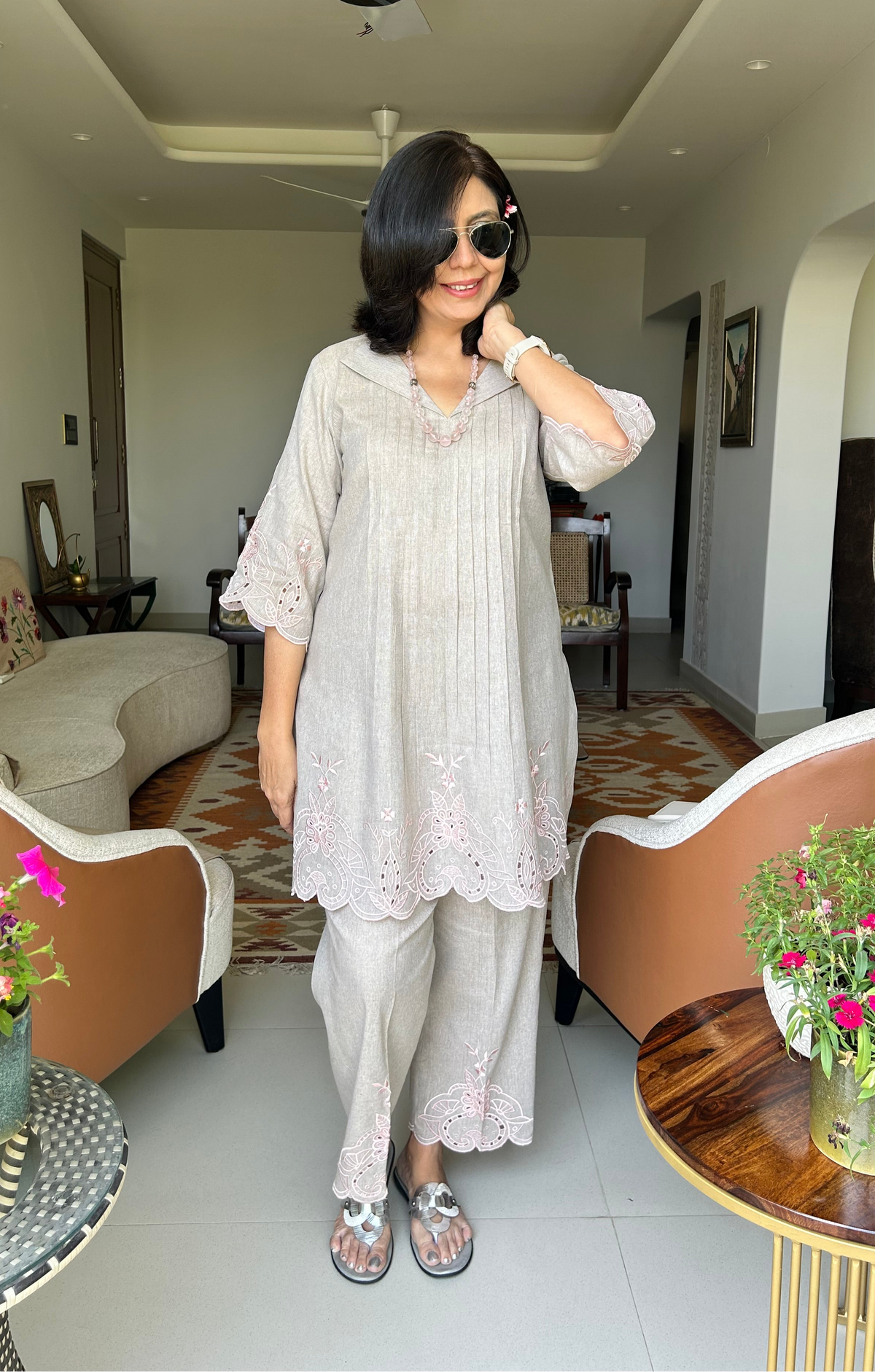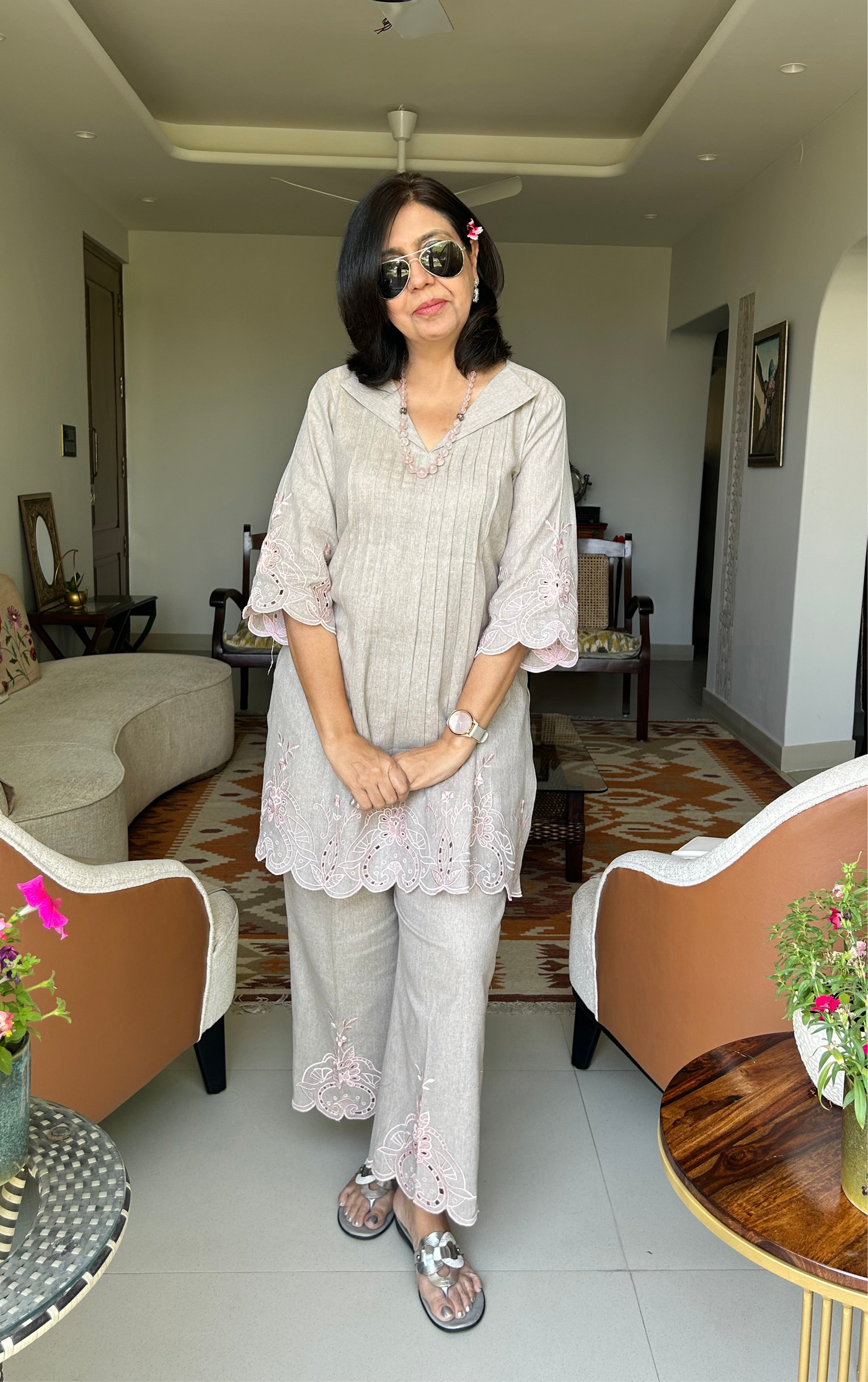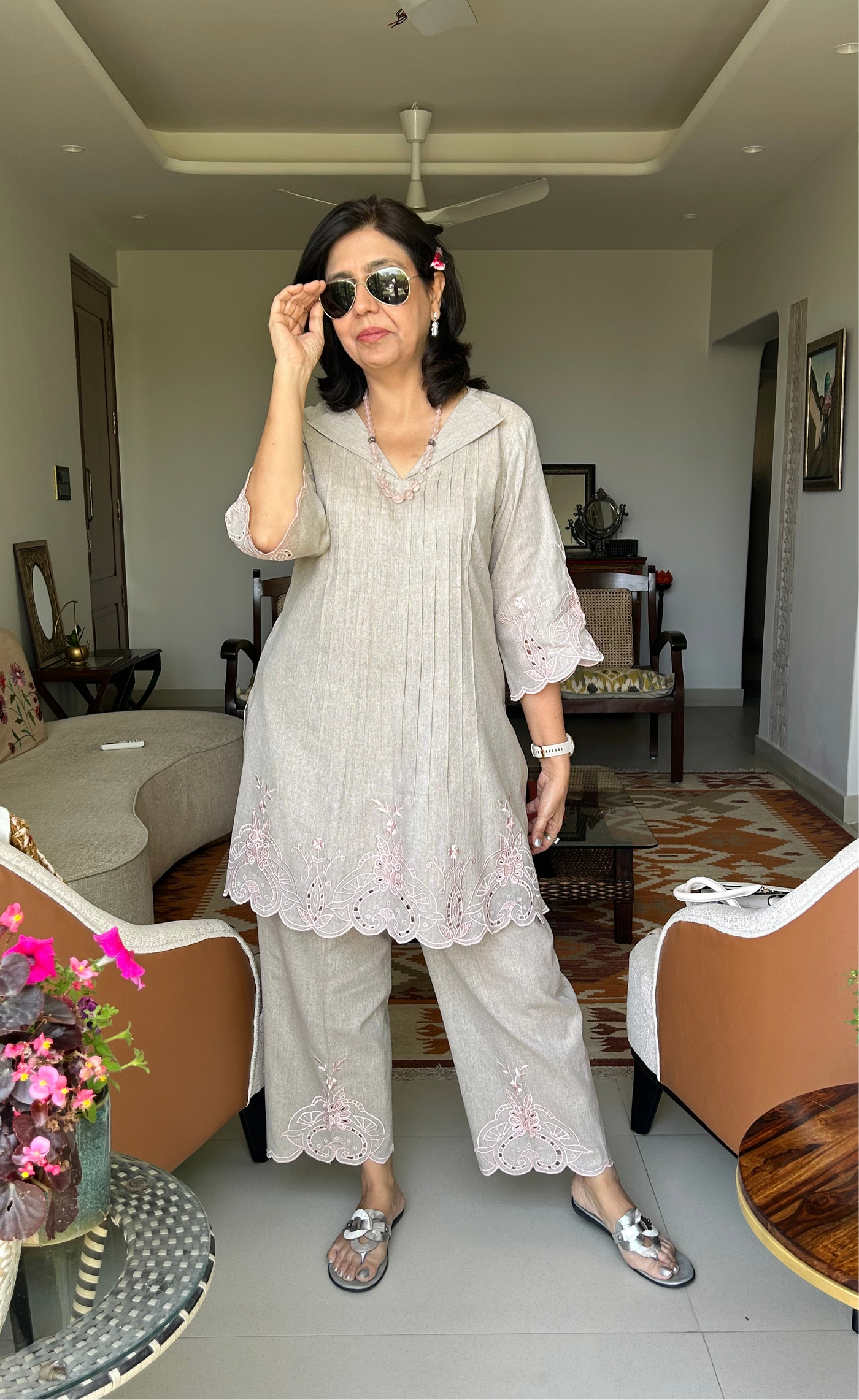 A pure cotton chambray co ord set with beautiful pale pink thread embroidery and Cutwork embroidery on the ghera, pants and sleeves with pocket and pleating detailing.