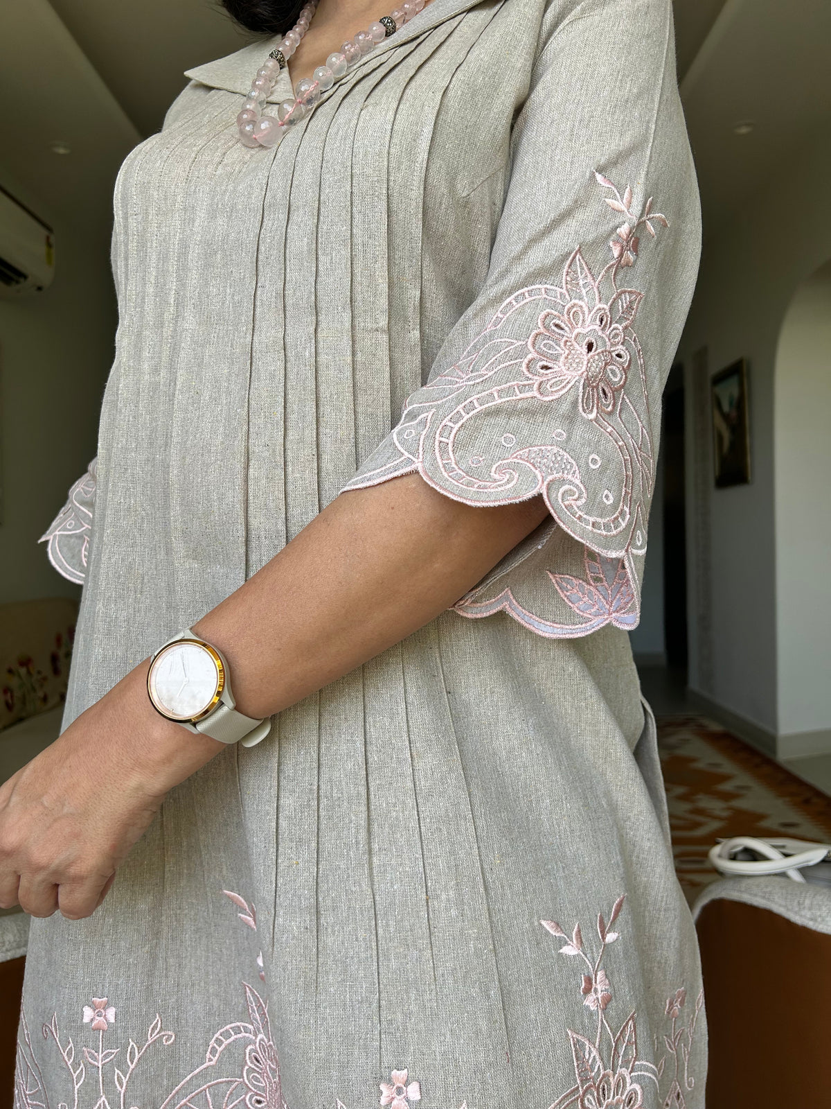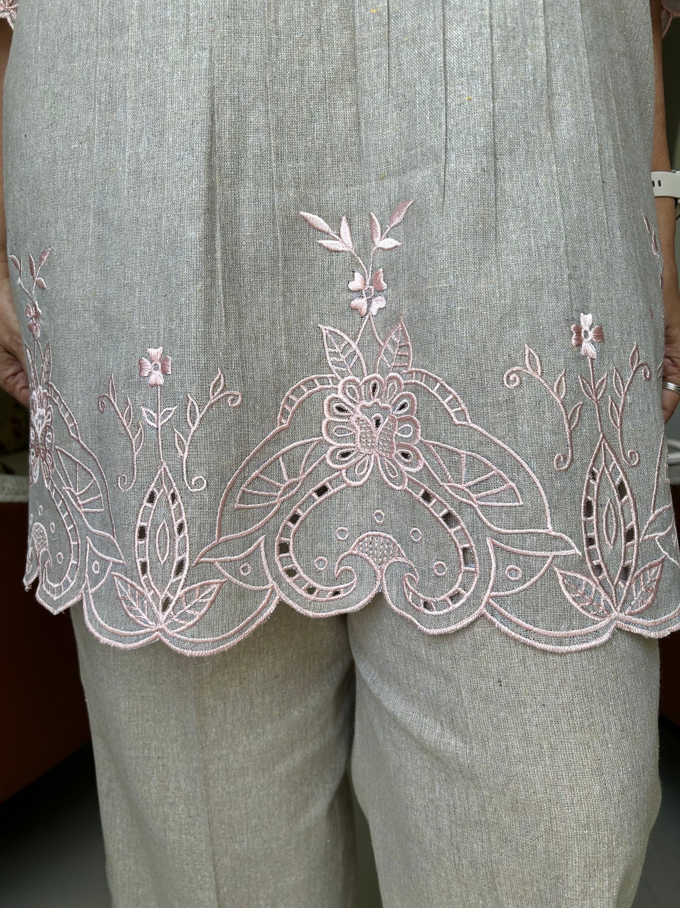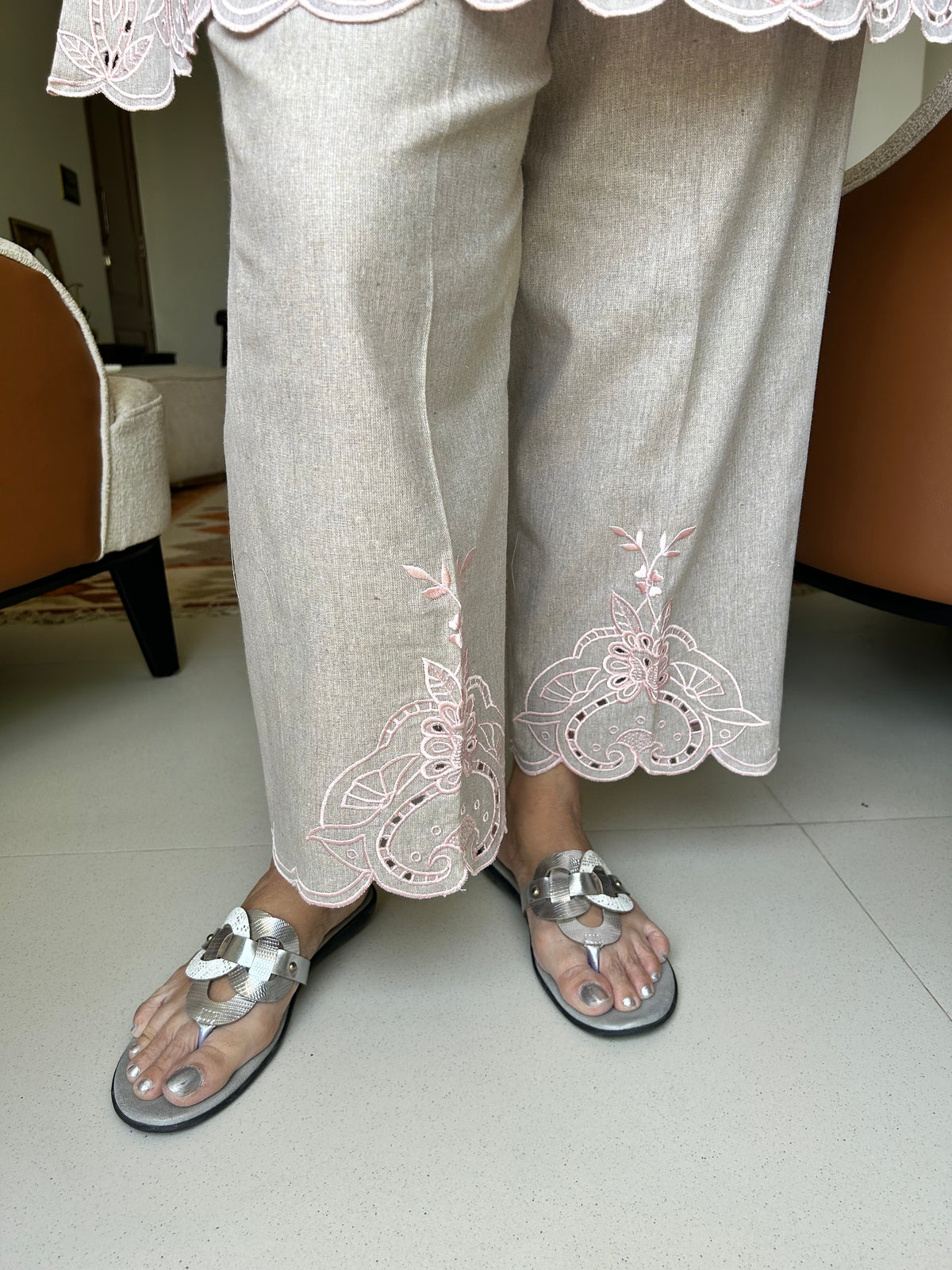 A pure cotton chambray co ord set with beautiful pale pink thread embroidery and Cutwork embroidery on the ghera, pants and sleeves with pocket and pleating detailing.