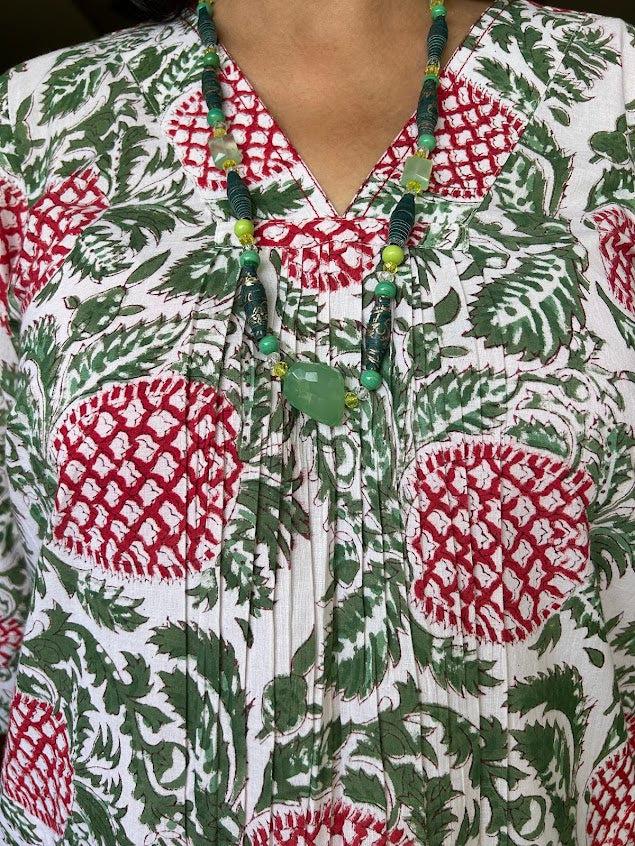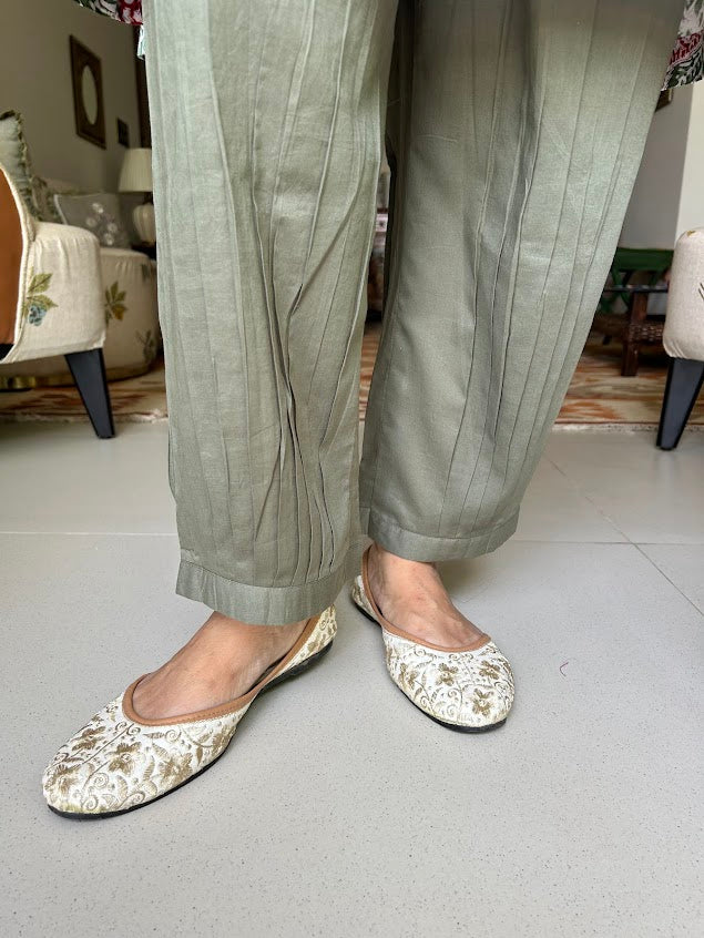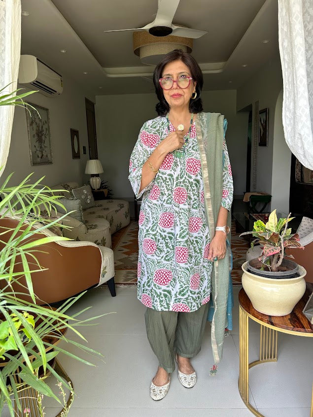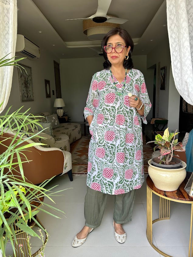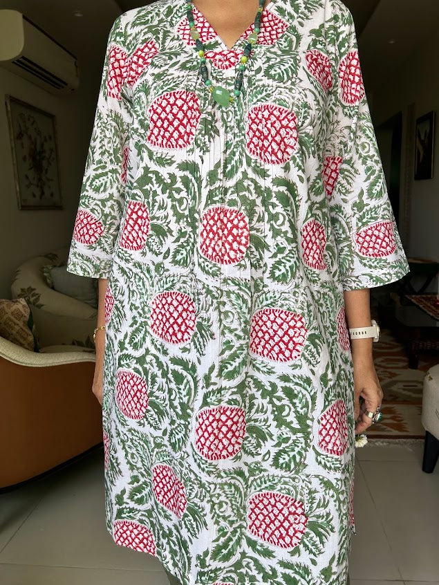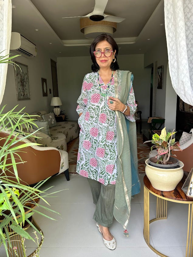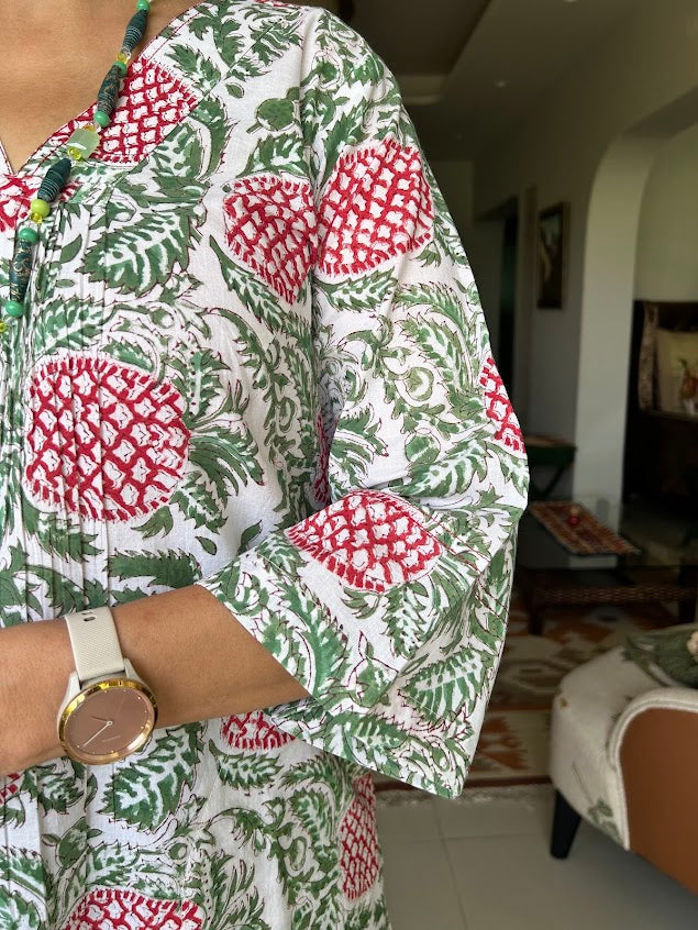 A pure cotton Hand block printed Co ord set with pleating detailing is paired with pleated pants with pocket.