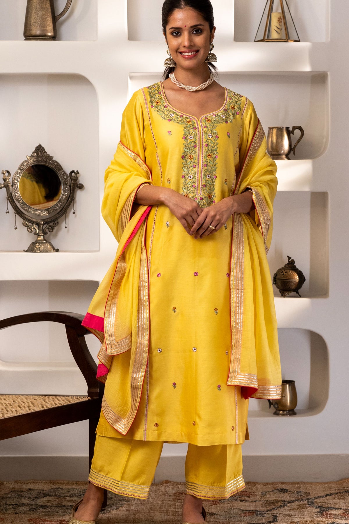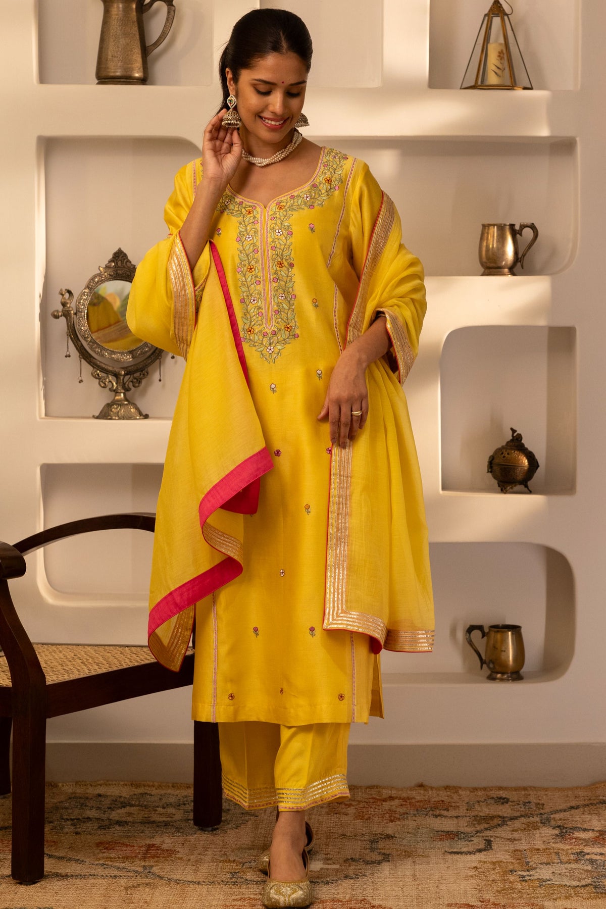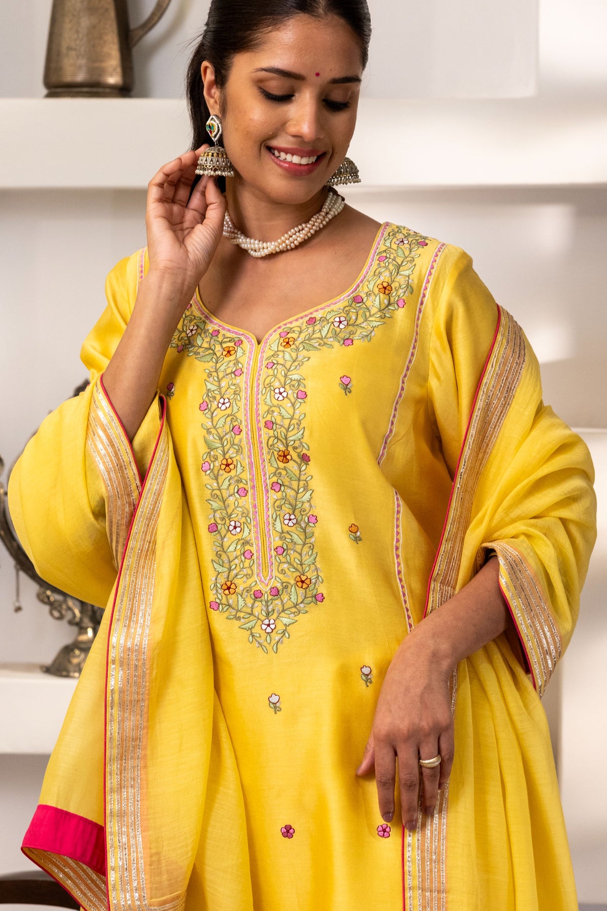 A pure Chanderi silk kurta with a burst of intricate embroidered flowers, paired with pants detailed with embroidery and Gota work. The ensemble is completed with a full-sized pure muslin dupatta adorned with Gota work, contrasting piping, and facing for an elegant festive finish.