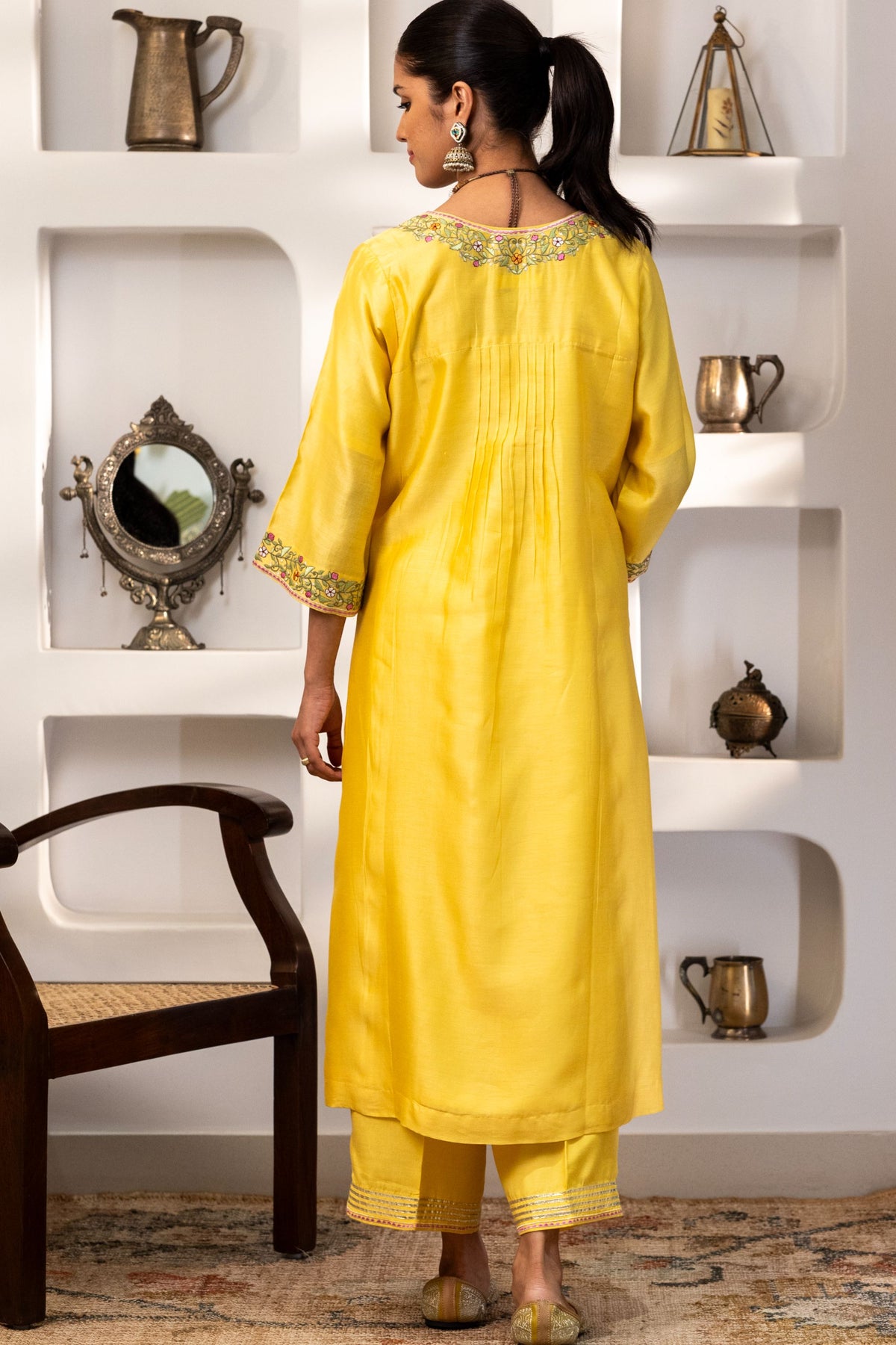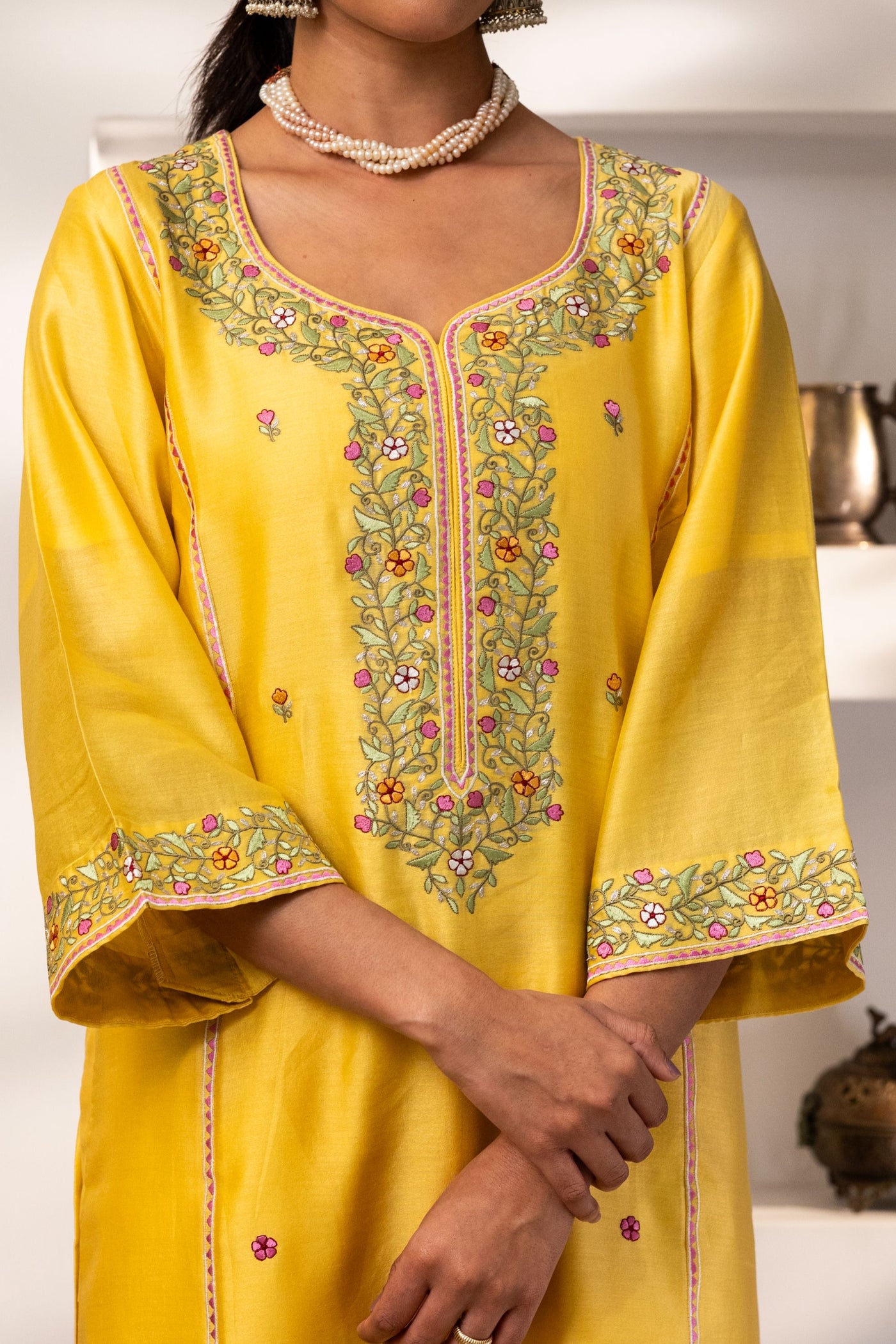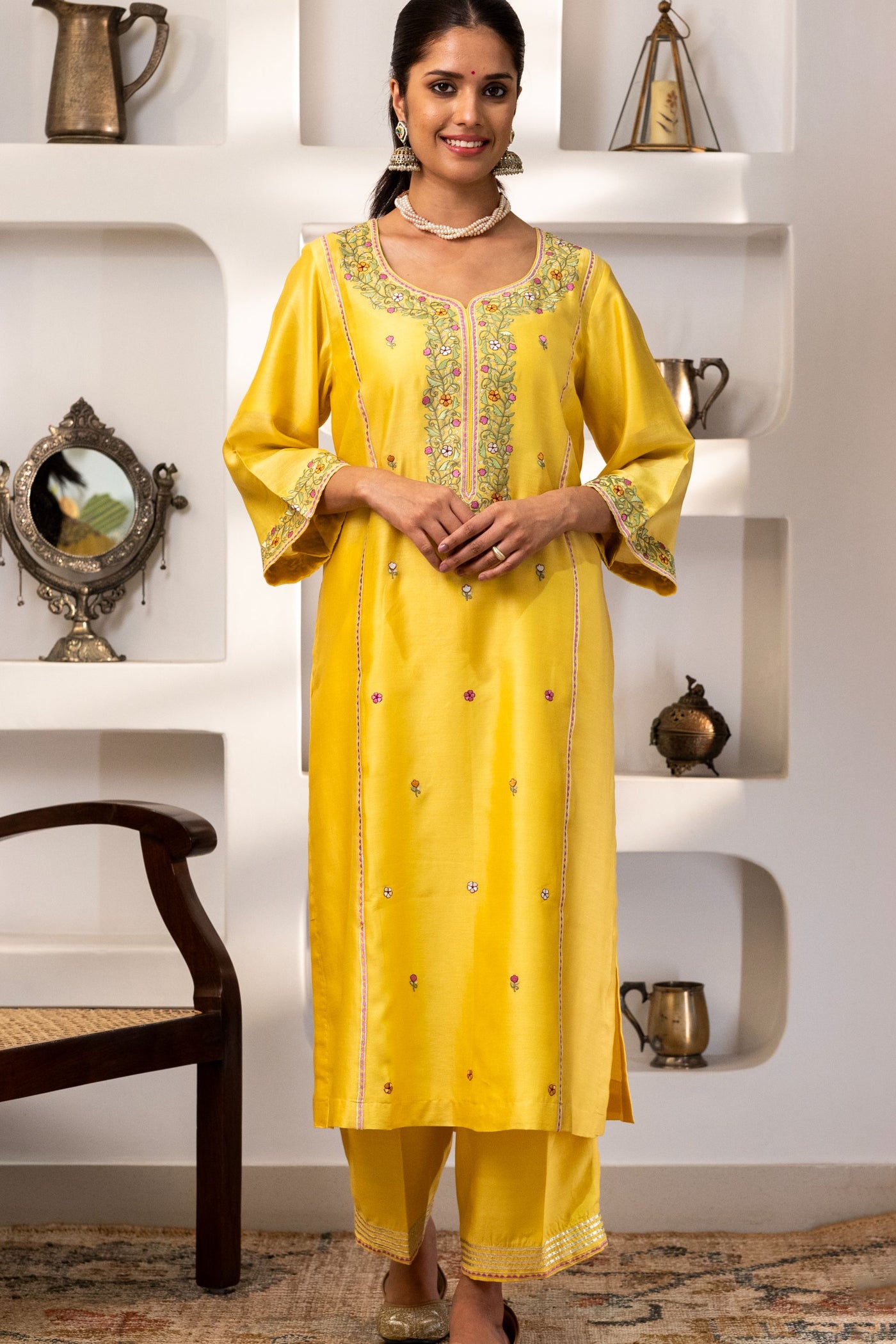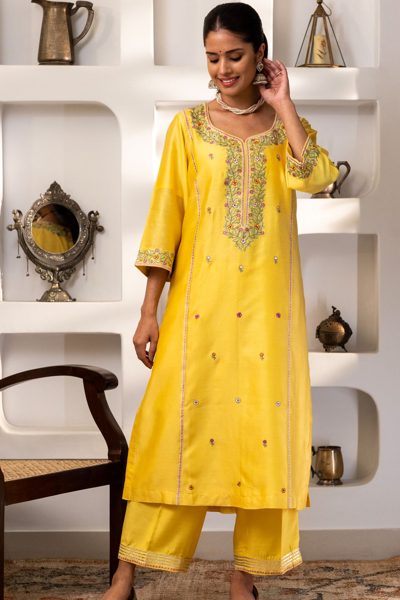 A pure Chanderi silk kurta with a burst of intricate embroidered flowers, paired with pants detailed with embroidery and Gota work. The ensemble is completed with a full-sized pure muslin dupatta adorned with Gota work, contrasting piping, and facing for an elegant festive finish.