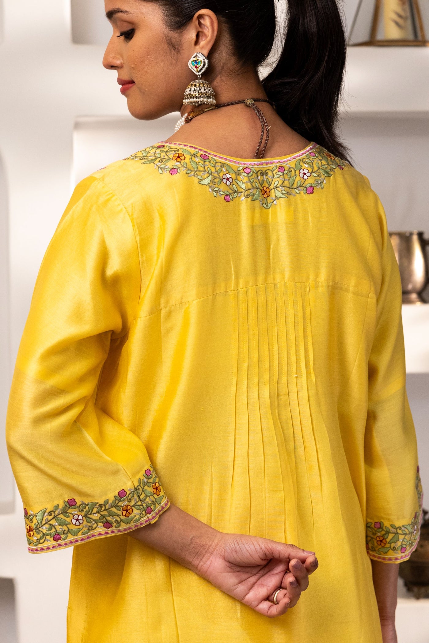Kurta fabric: Pure Chanderi silk with floral embroidery.