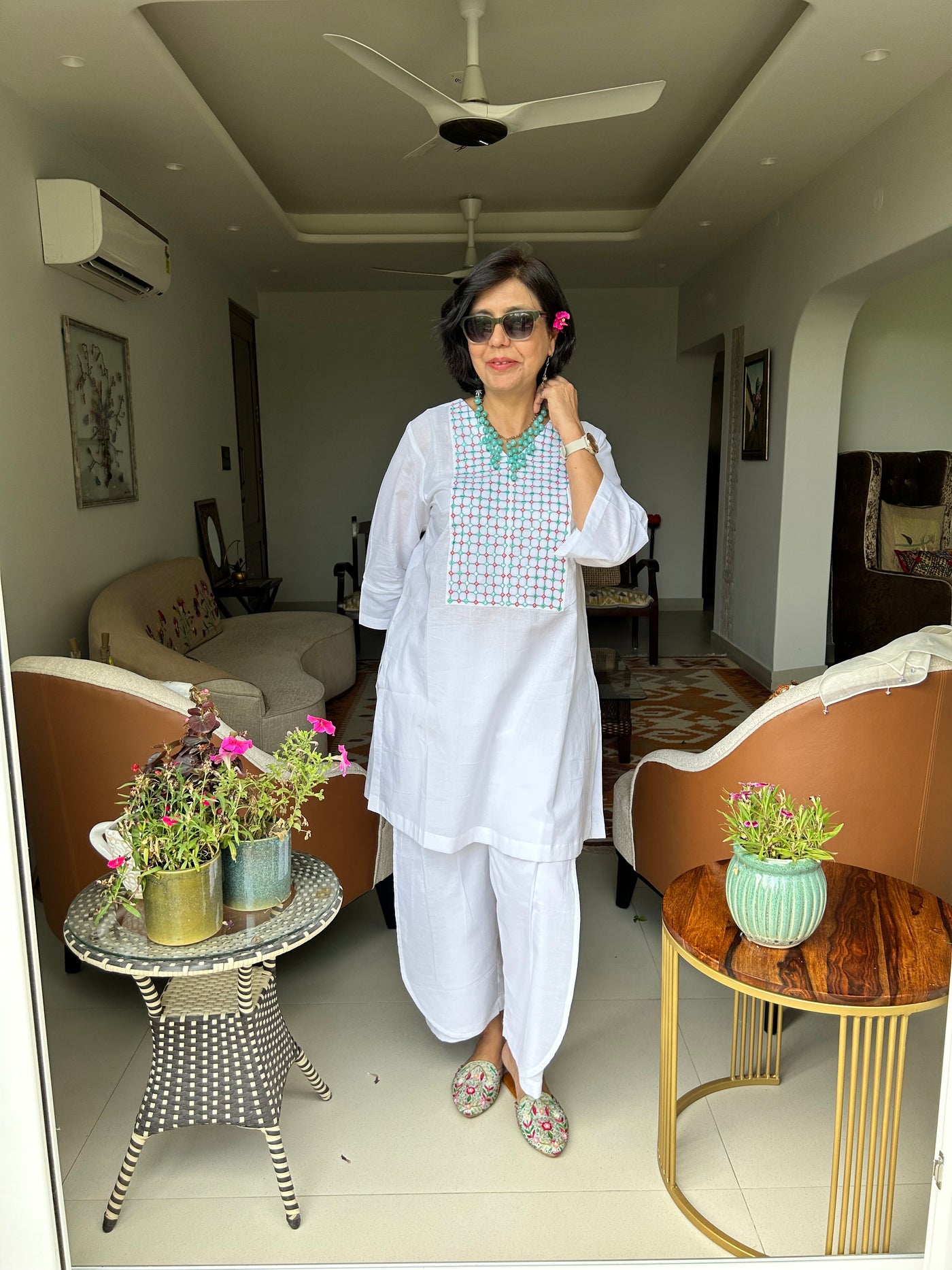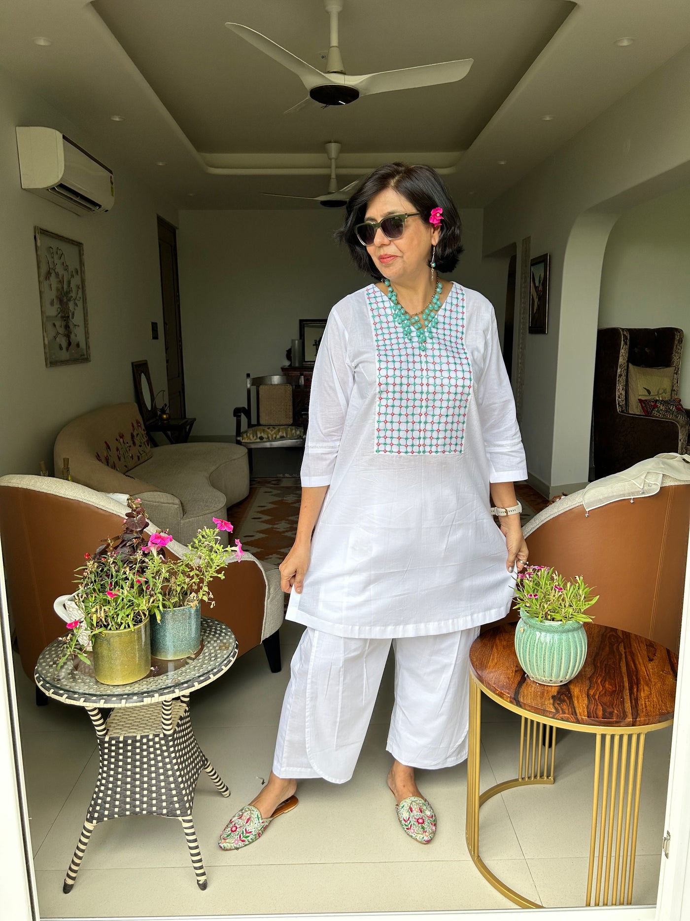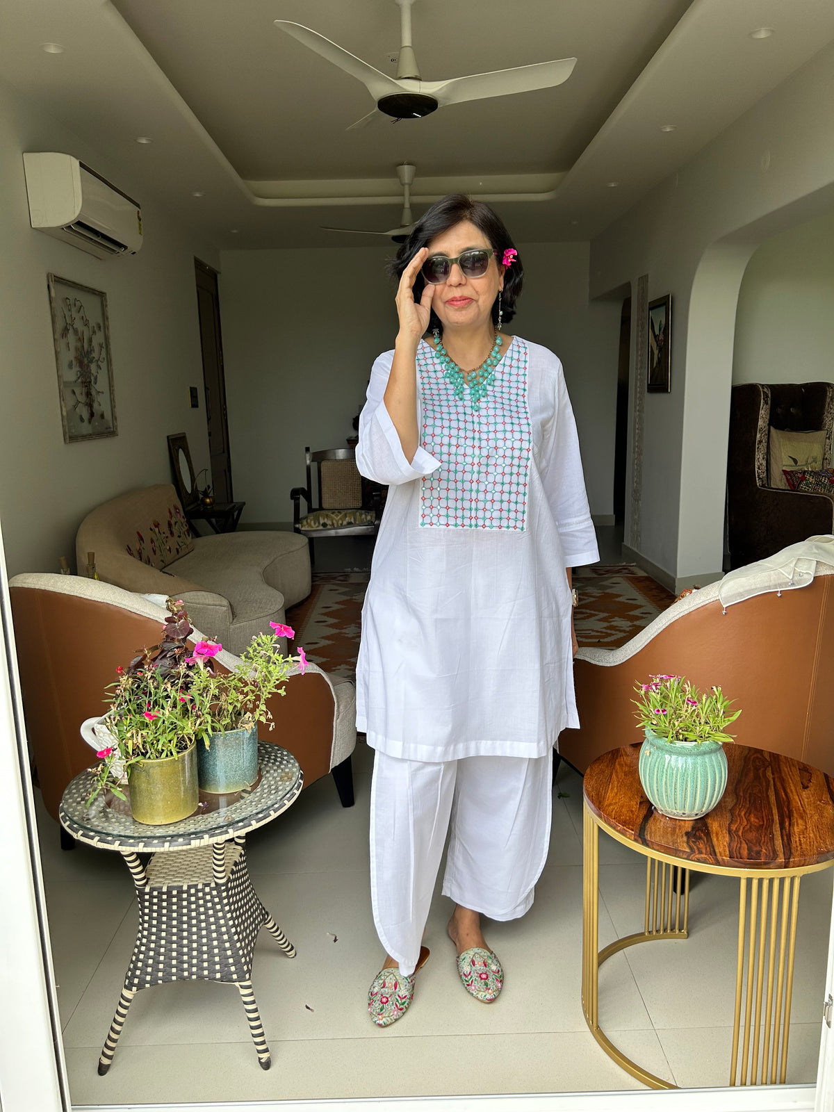 A pure cotton cotton co ord set with intricate thread embroidery on yoke is paired with tulip pants with pocket.