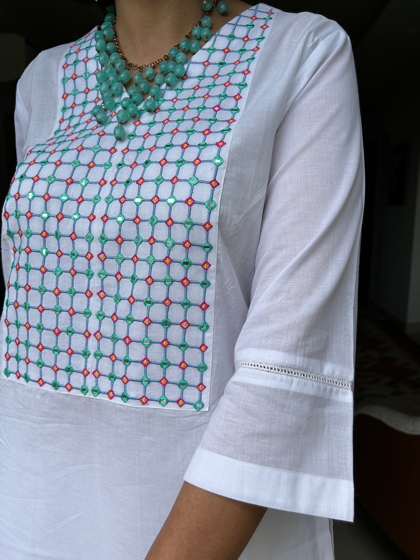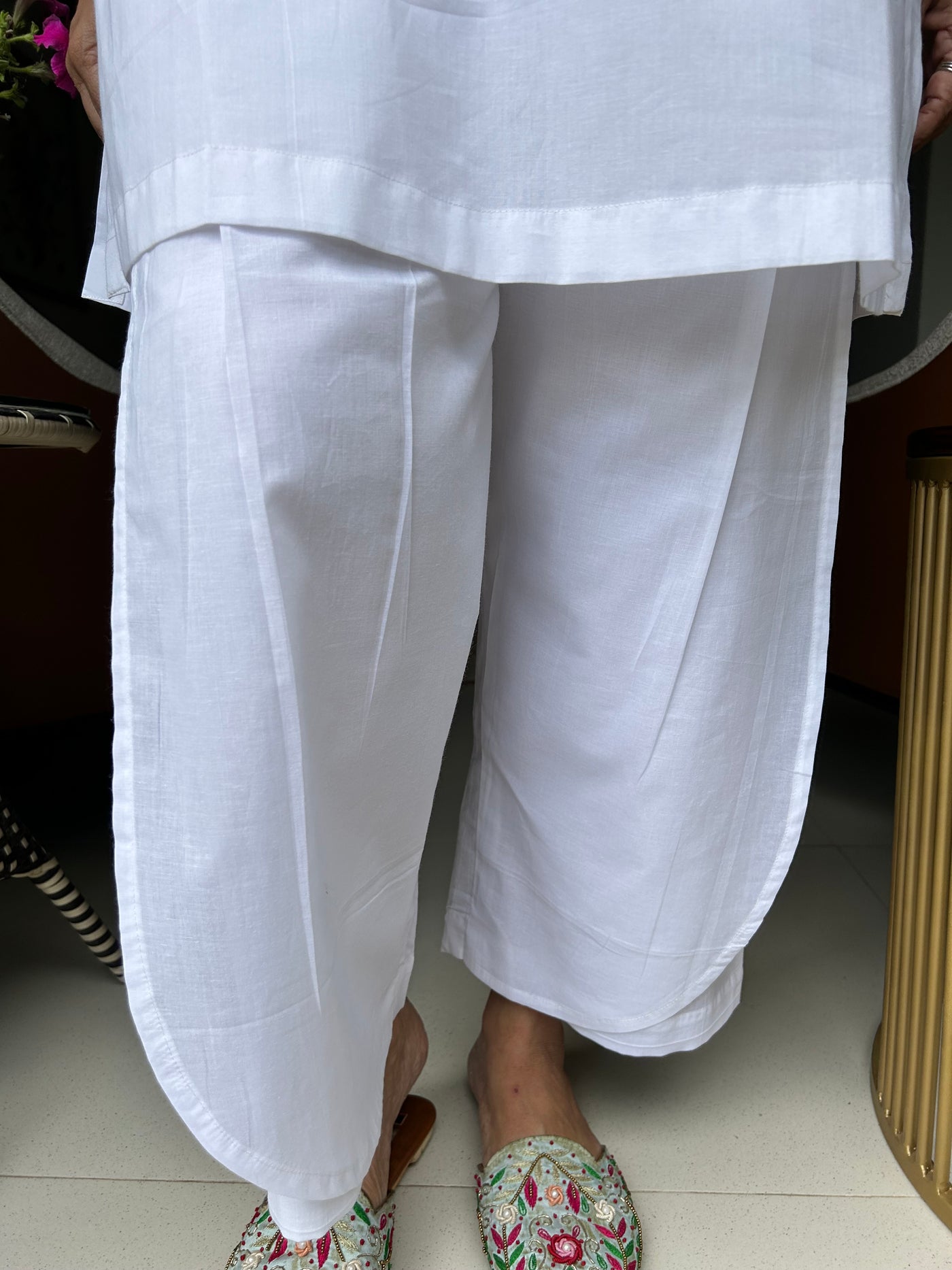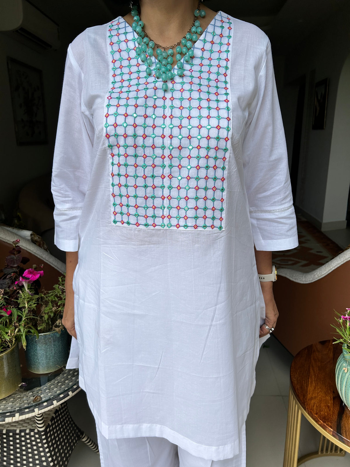 A pure cotton cotton co ord set with intricate thread embroidery on yoke is paired with tulip pants with pocket.