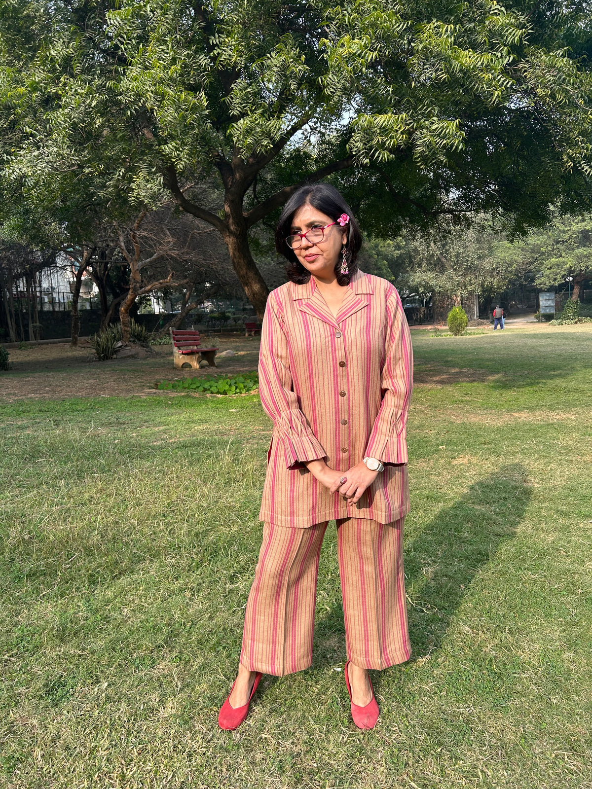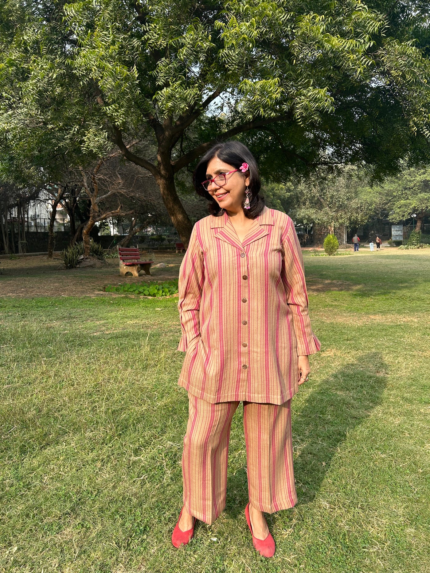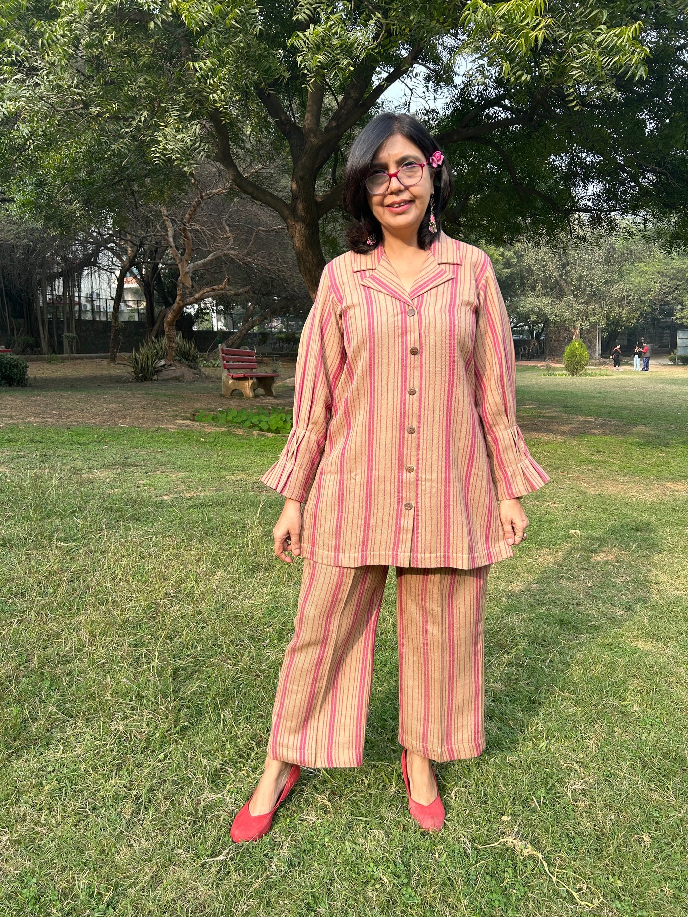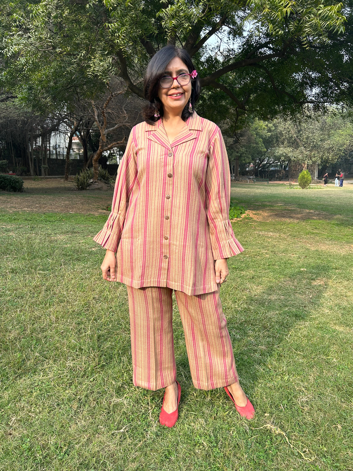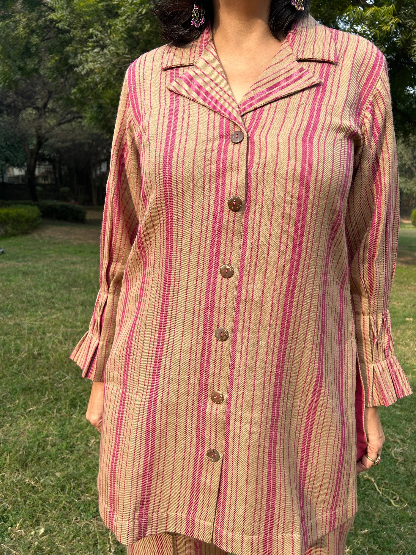 Handwoven on the loom by the skilled women weavers from the Kullu valley in very fine pure merino wool is a warm and cozy co ord set for winters with a striped weave. The top has a collar and reverse pleated sleeves is paired with pants with pocket. Elegant and stylish, this winter co ord set instantly elevates you to class apart!