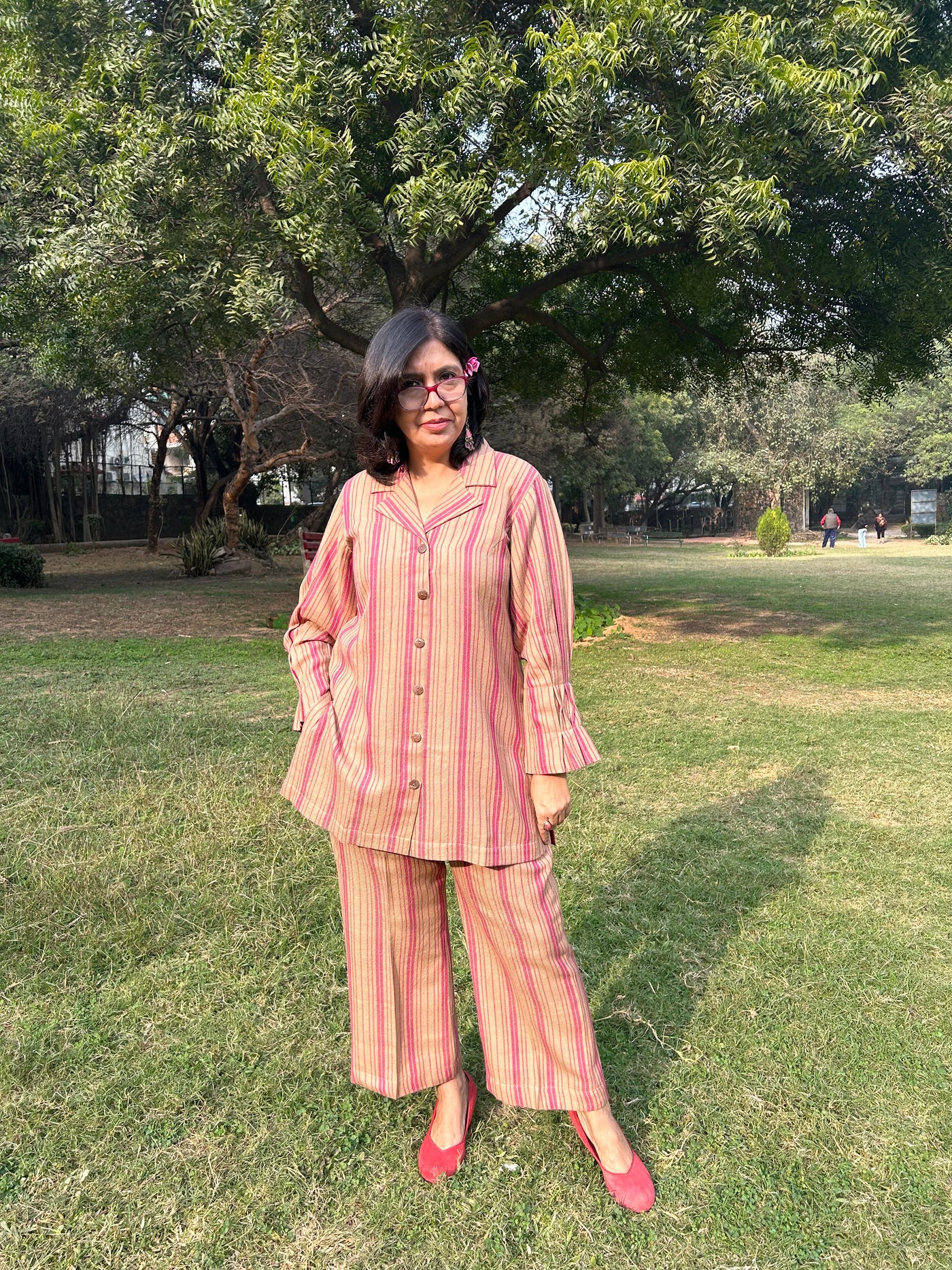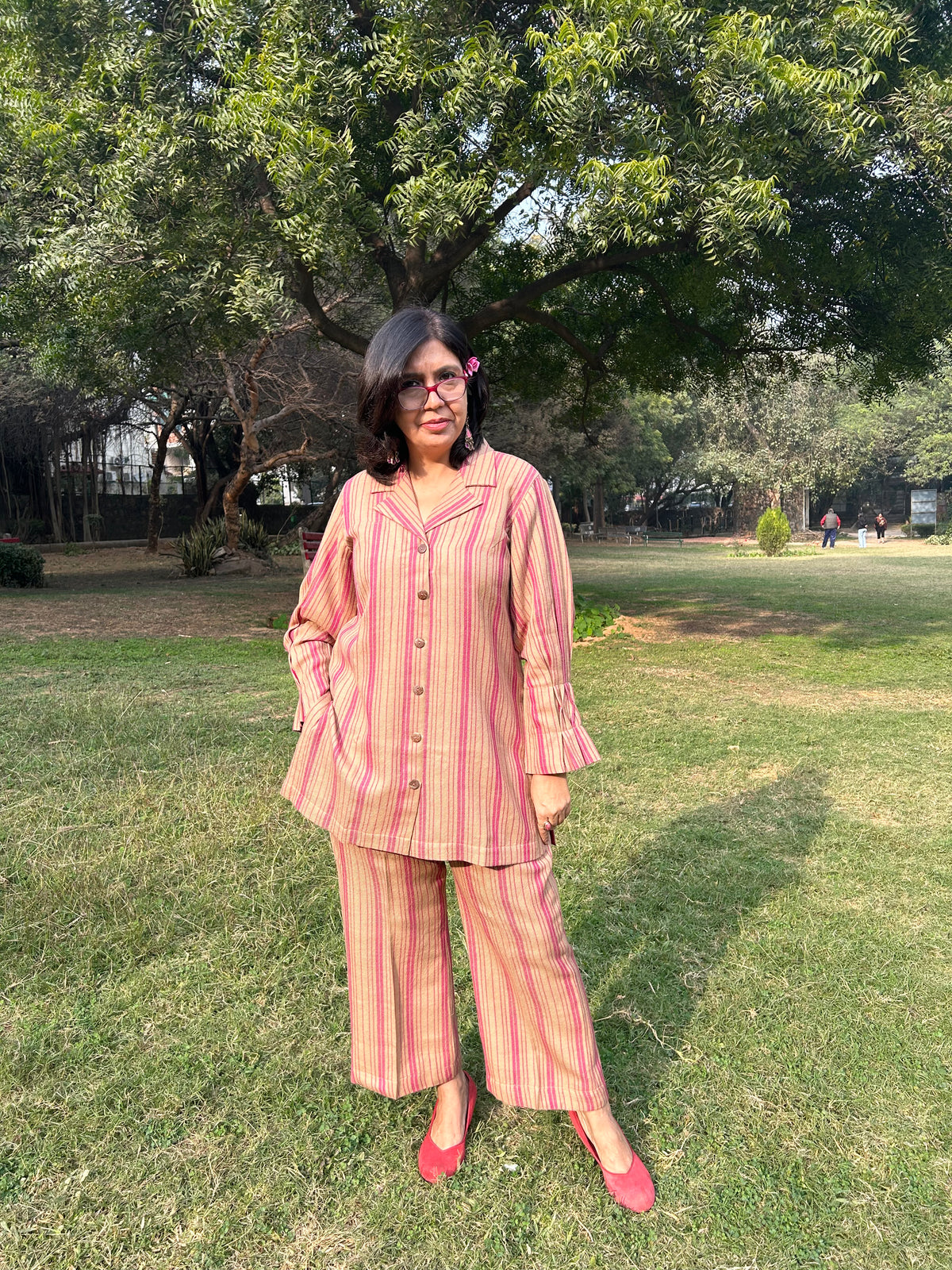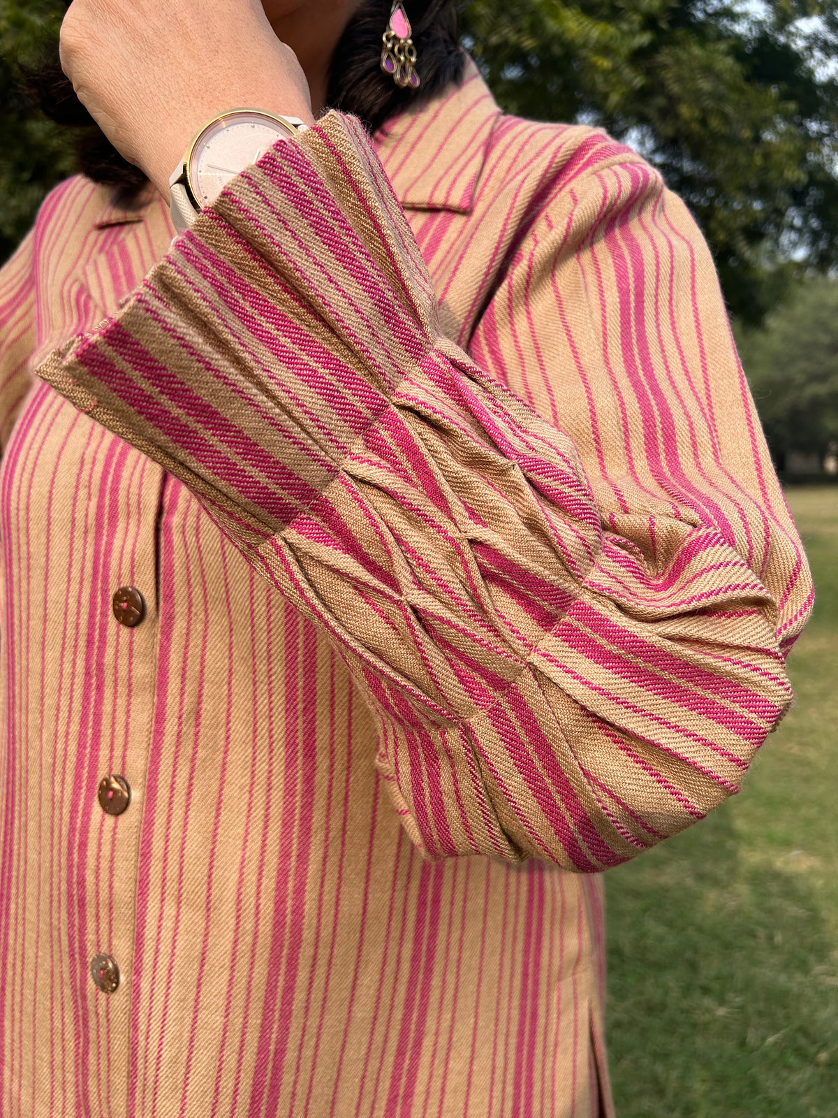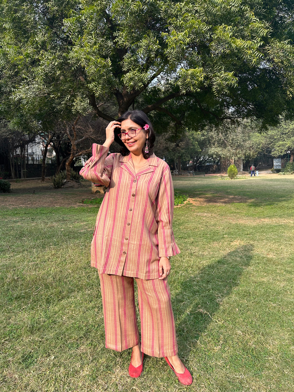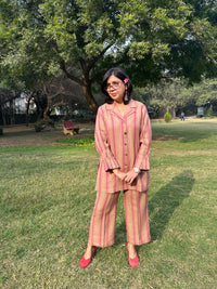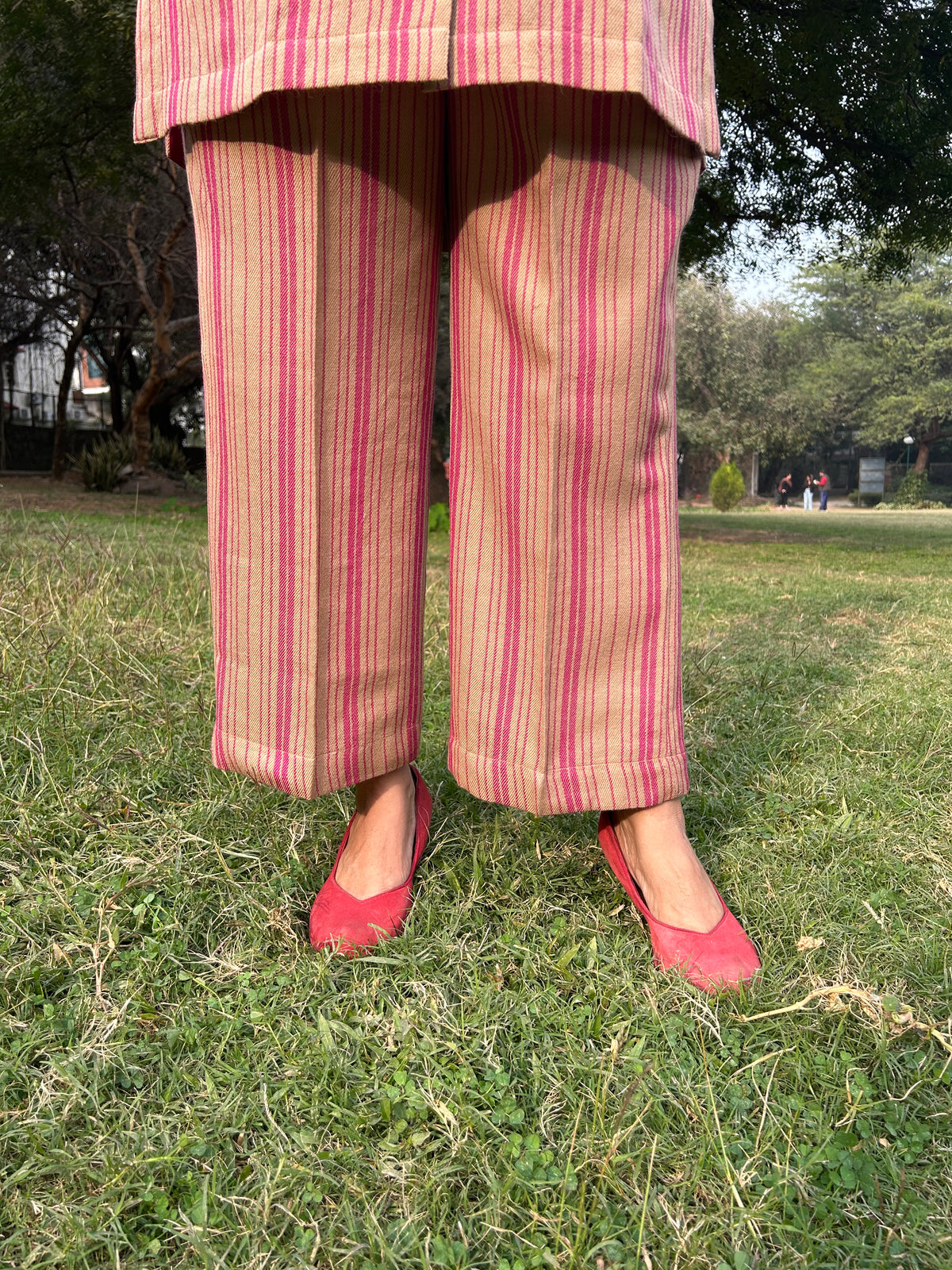 Handwoven on the loom by the skilled women weavers from the Kullu valley in very fine pure merino wool is a warm and cozy co ord set for winters with a striped weave. The top has a collar and reverse pleated sleeves is paired with pants with pocket. Elegant and stylish, this winter co ord set instantly elevates you to class apart!