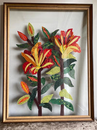 This is a framed Artwork from our Zero waste collection which has been created from our leftover Katrans or scraps which have been joined together piece by piece .