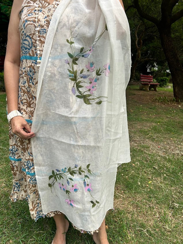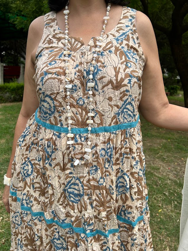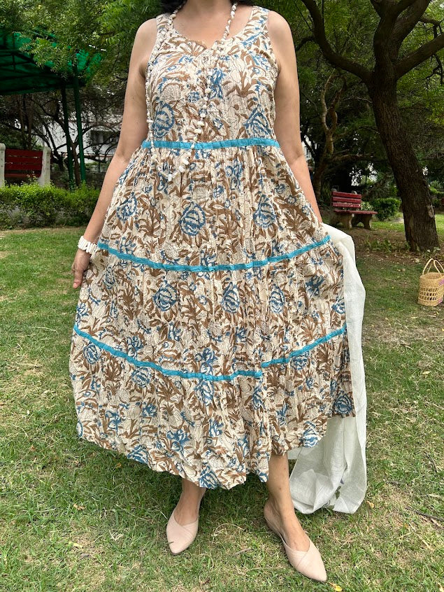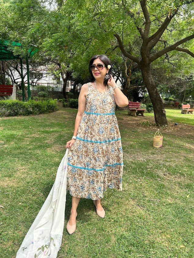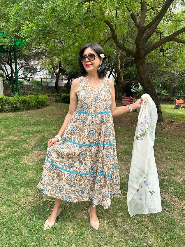 A very comfortable cotton dresses for your vacation with these easy flowy pure cotton Beige Floral Handblock Printed dress.