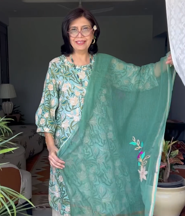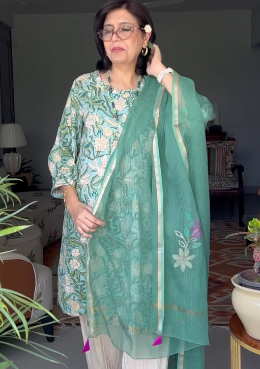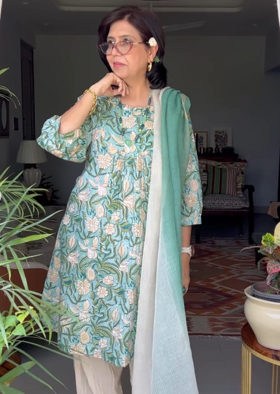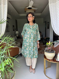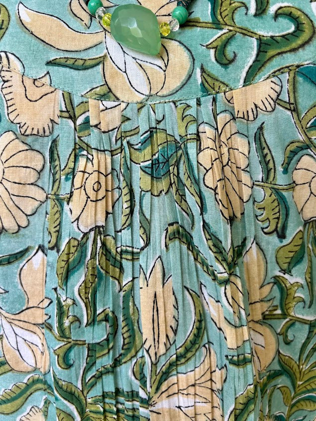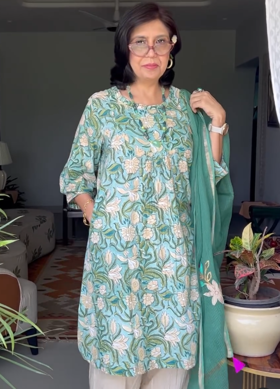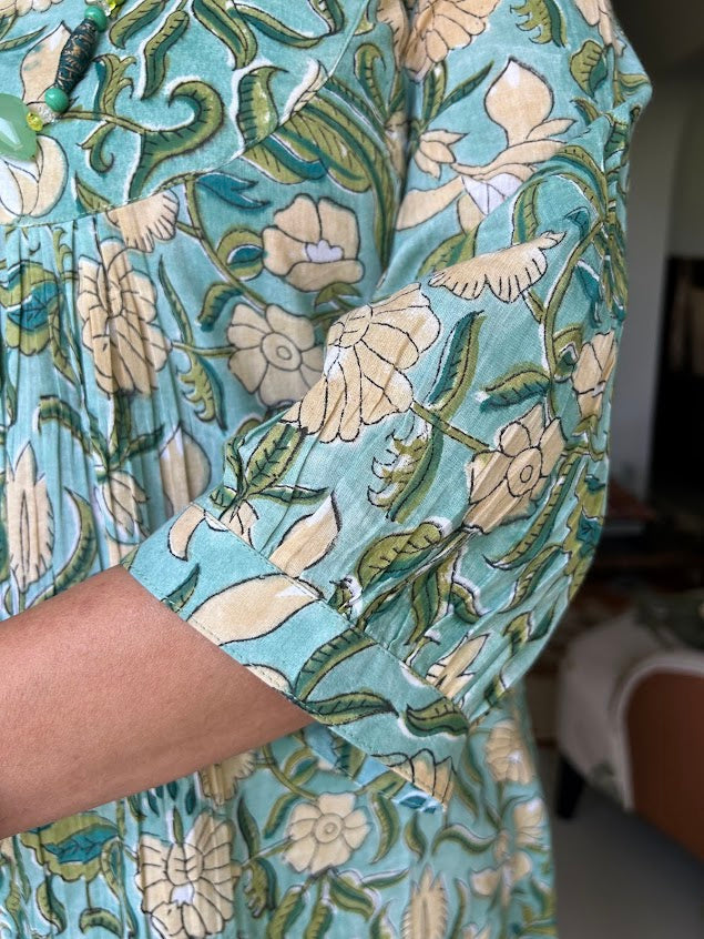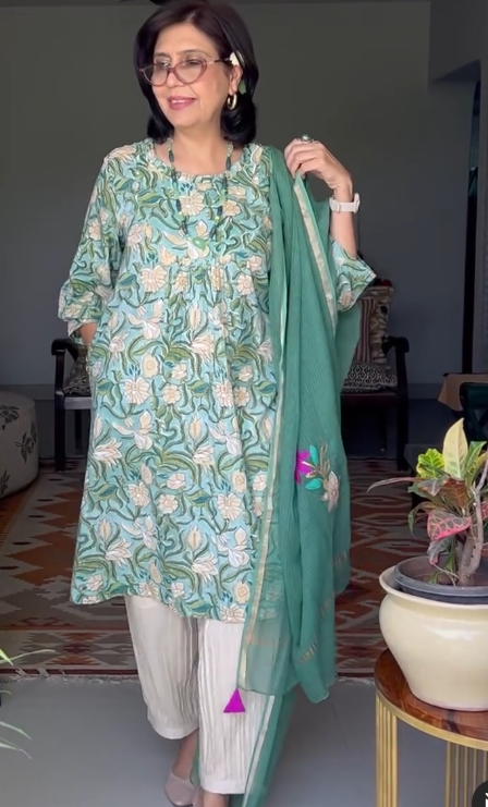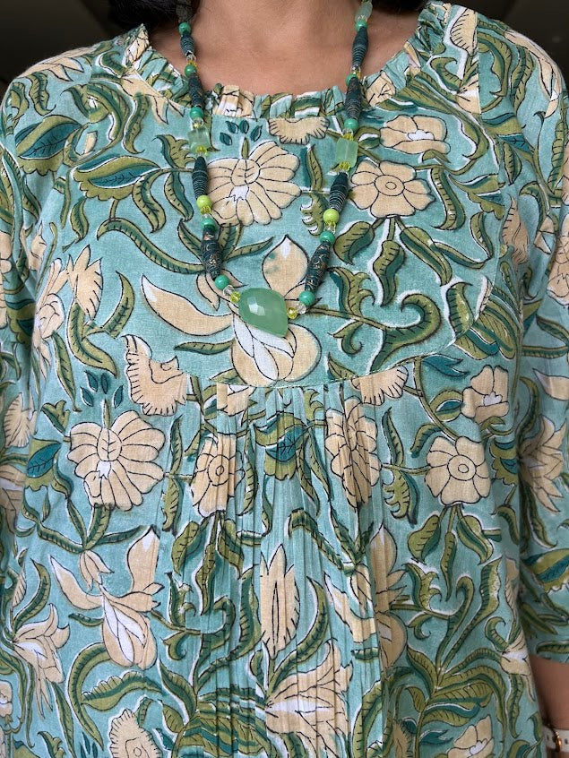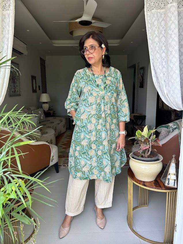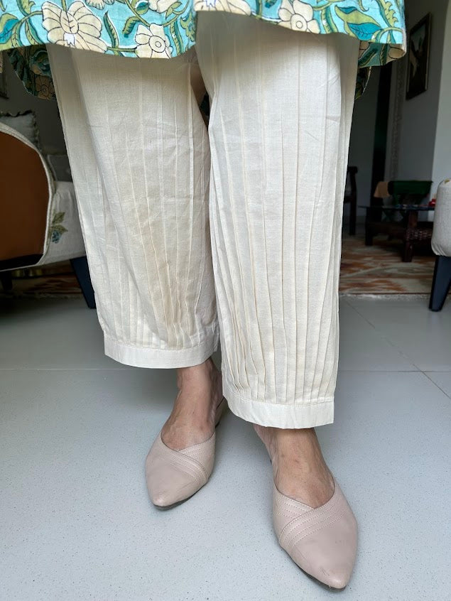 A pure cotton Hand block printed Co ord set with pleating and frill is paired with pleated pants with pocket.