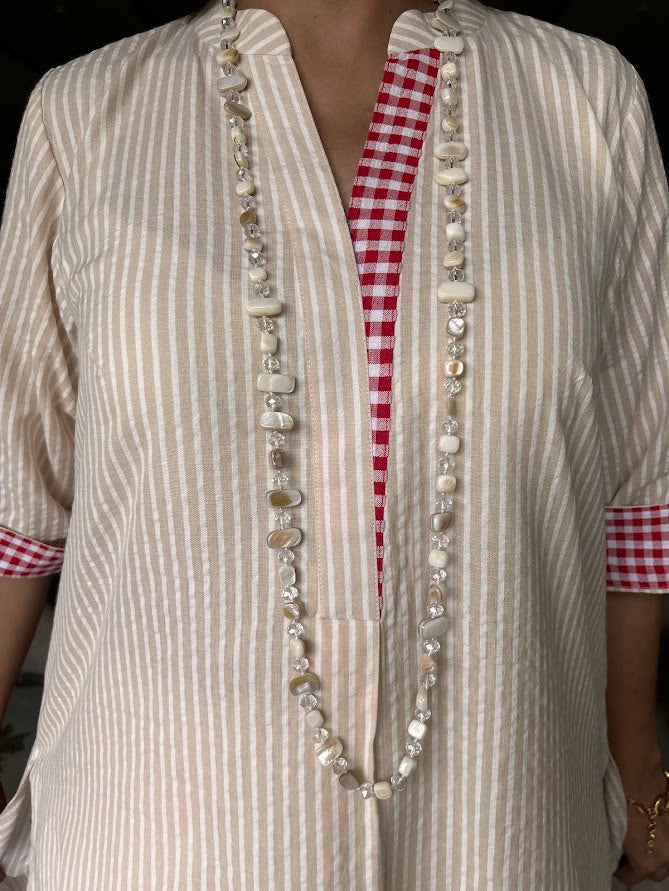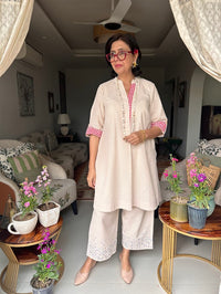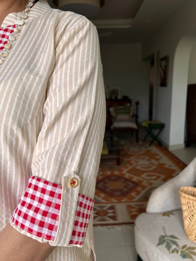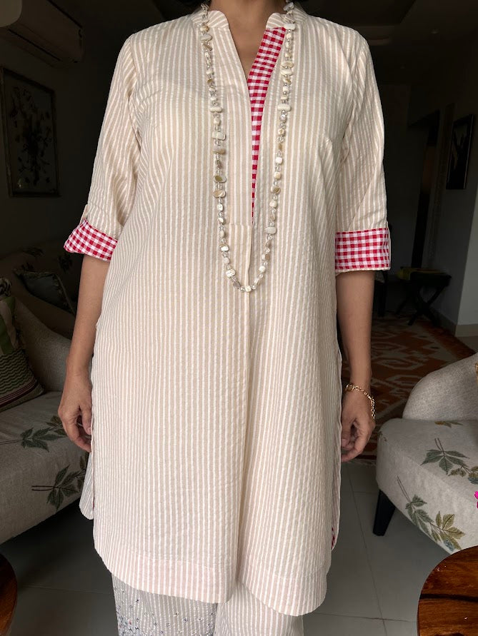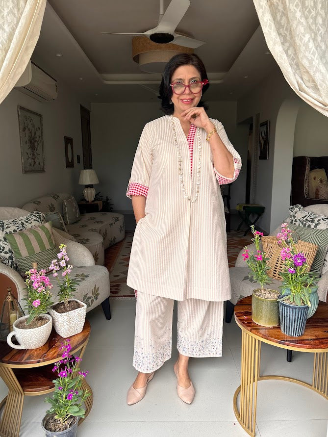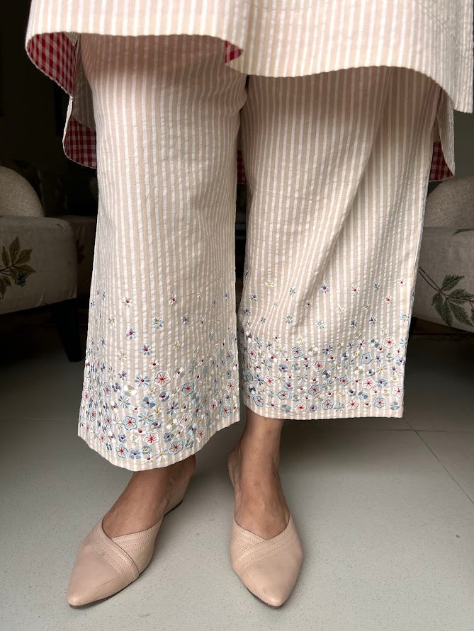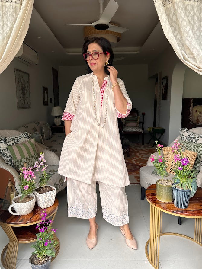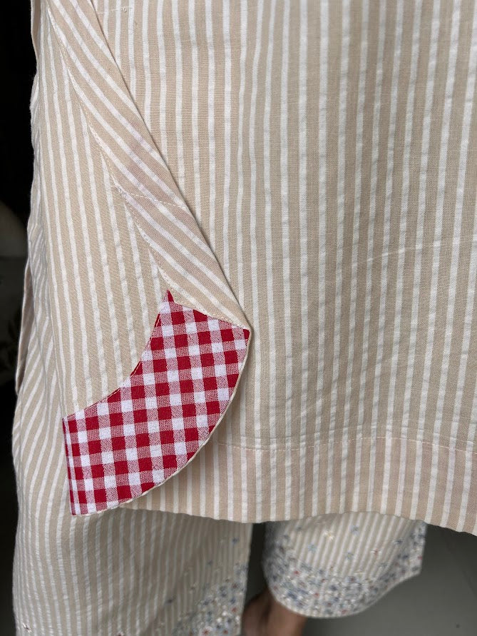 A pure soft striped self cotton kurta/dress with applique and thread embroidered flowers on the bottom with pocket detailing and contrasting facing