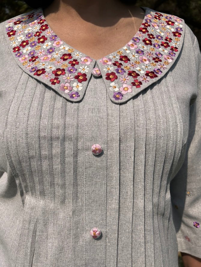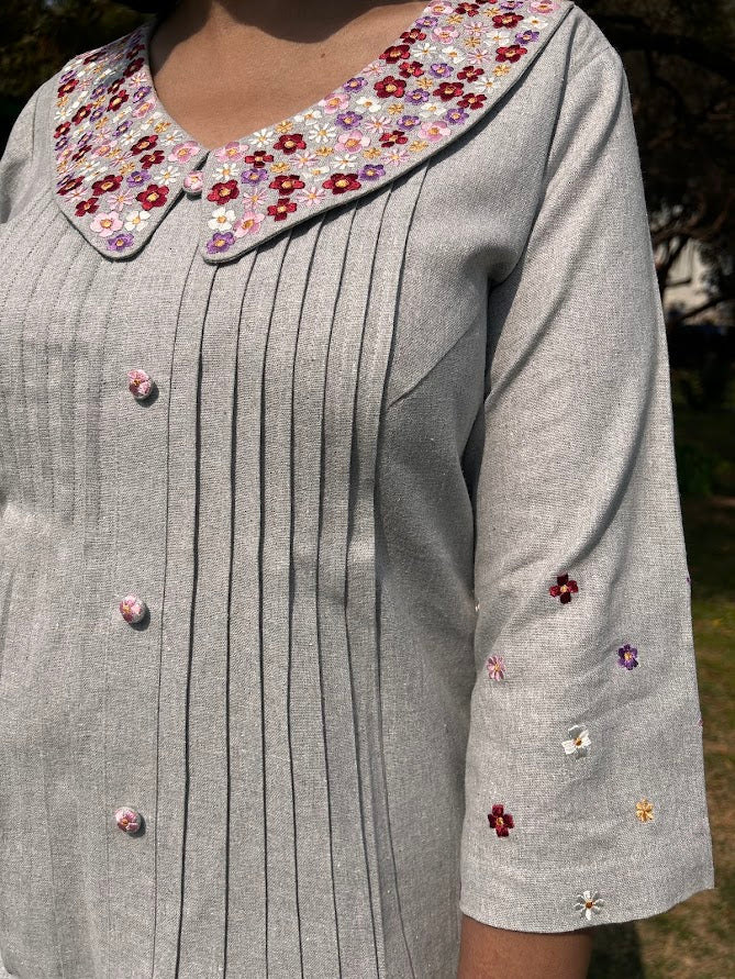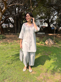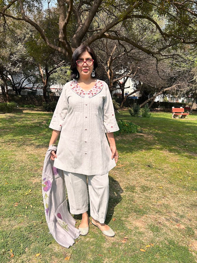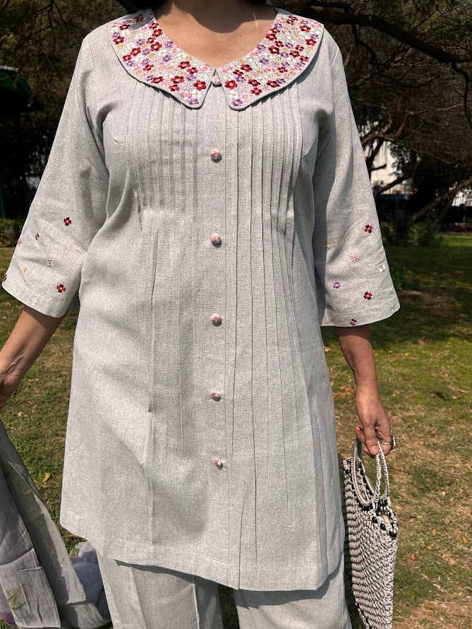 A cotton co ord set with a burst of flowers and spindle pants with pocket .