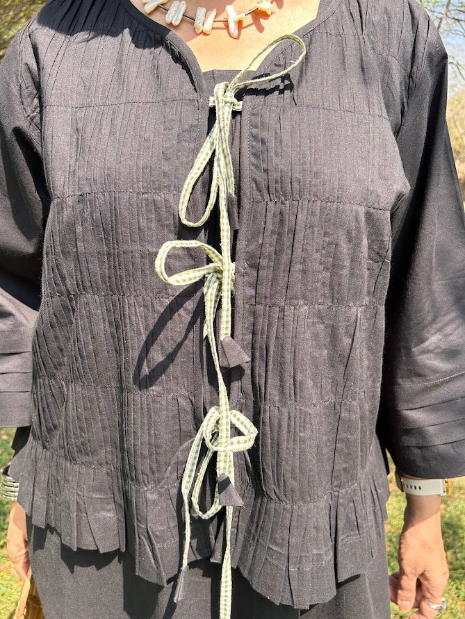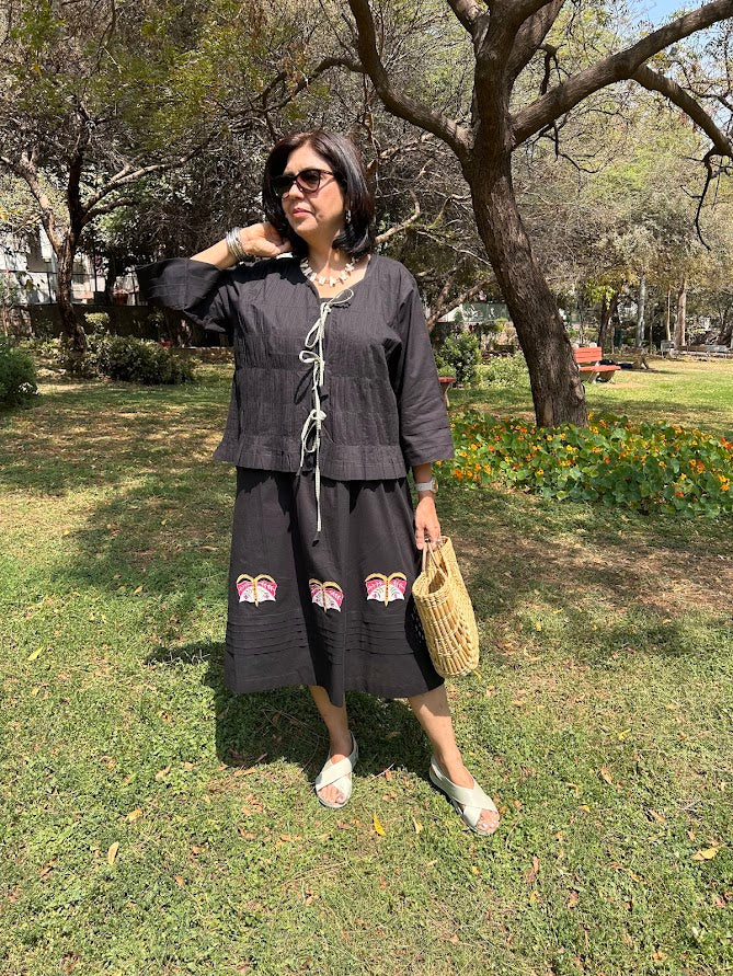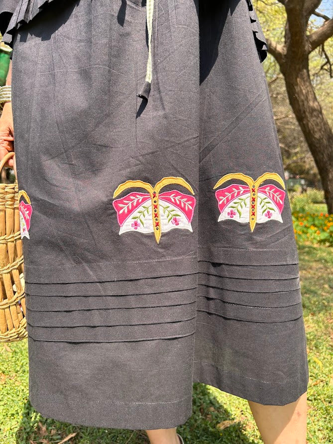 A flowy pure cotton dress with unique butterfly motifs is paired with an overlay with tie ups.