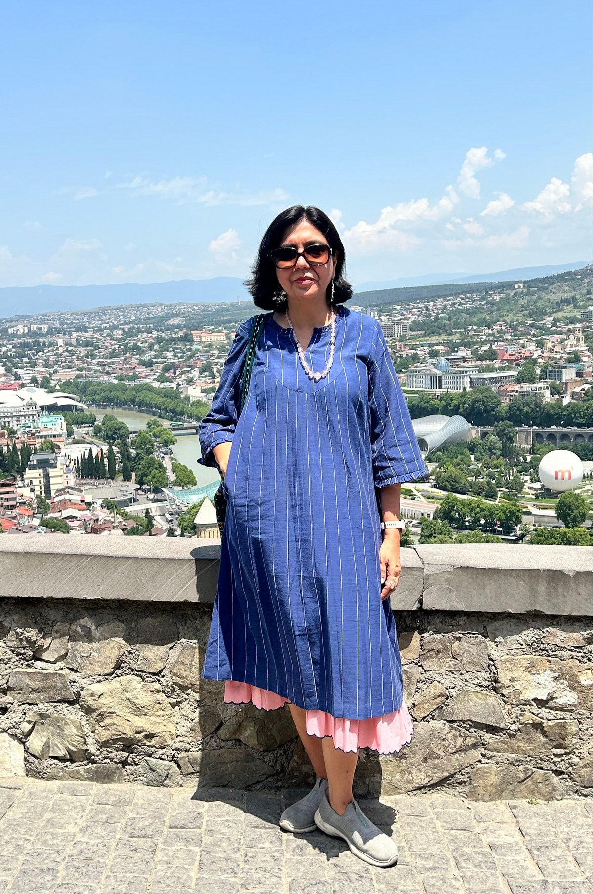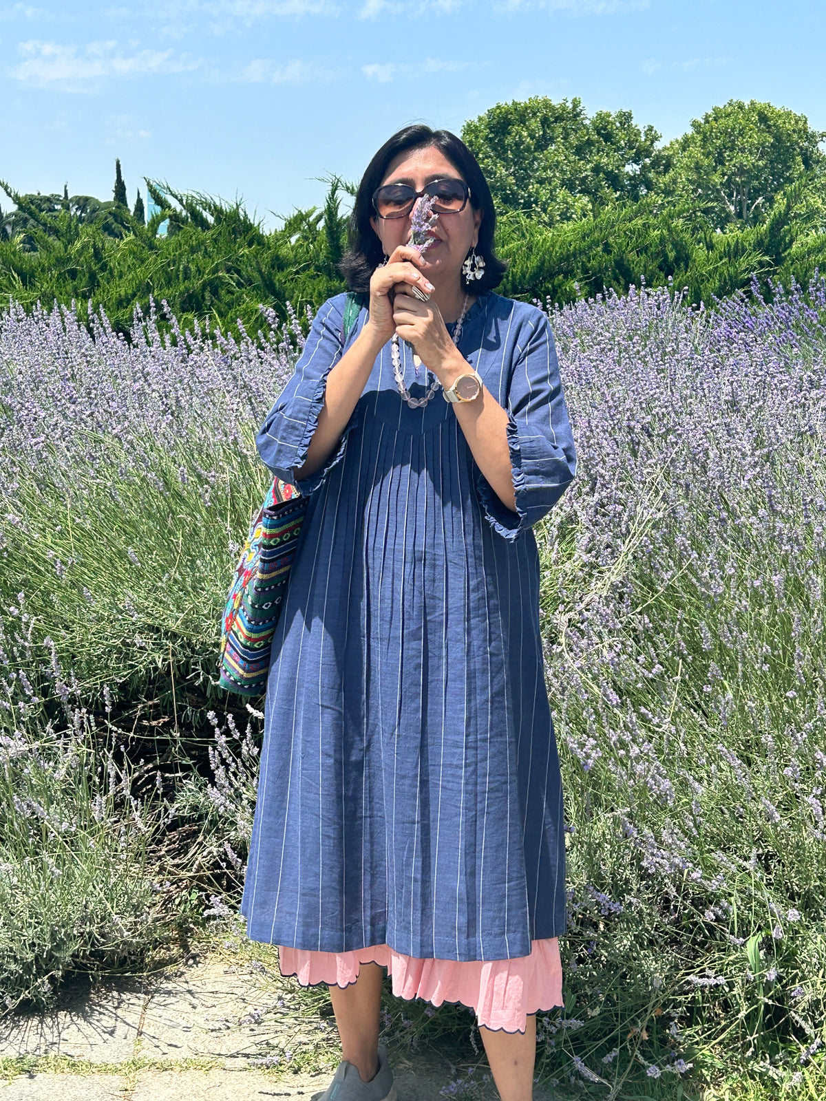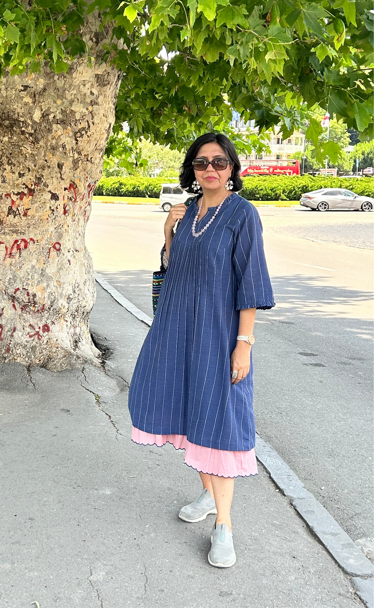 A pure soft cotton dress with frill and yoke detailing with slip with extended pink edgings with scalloping .