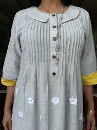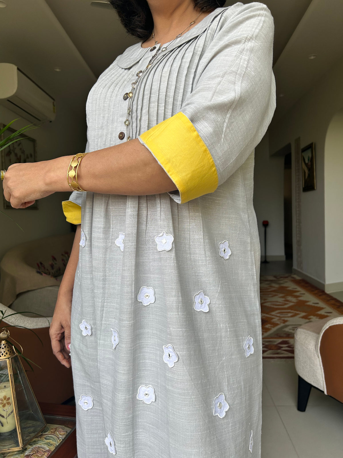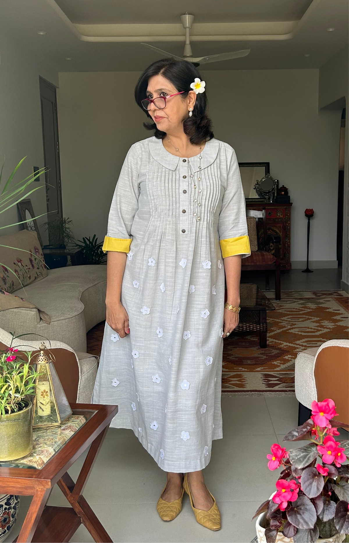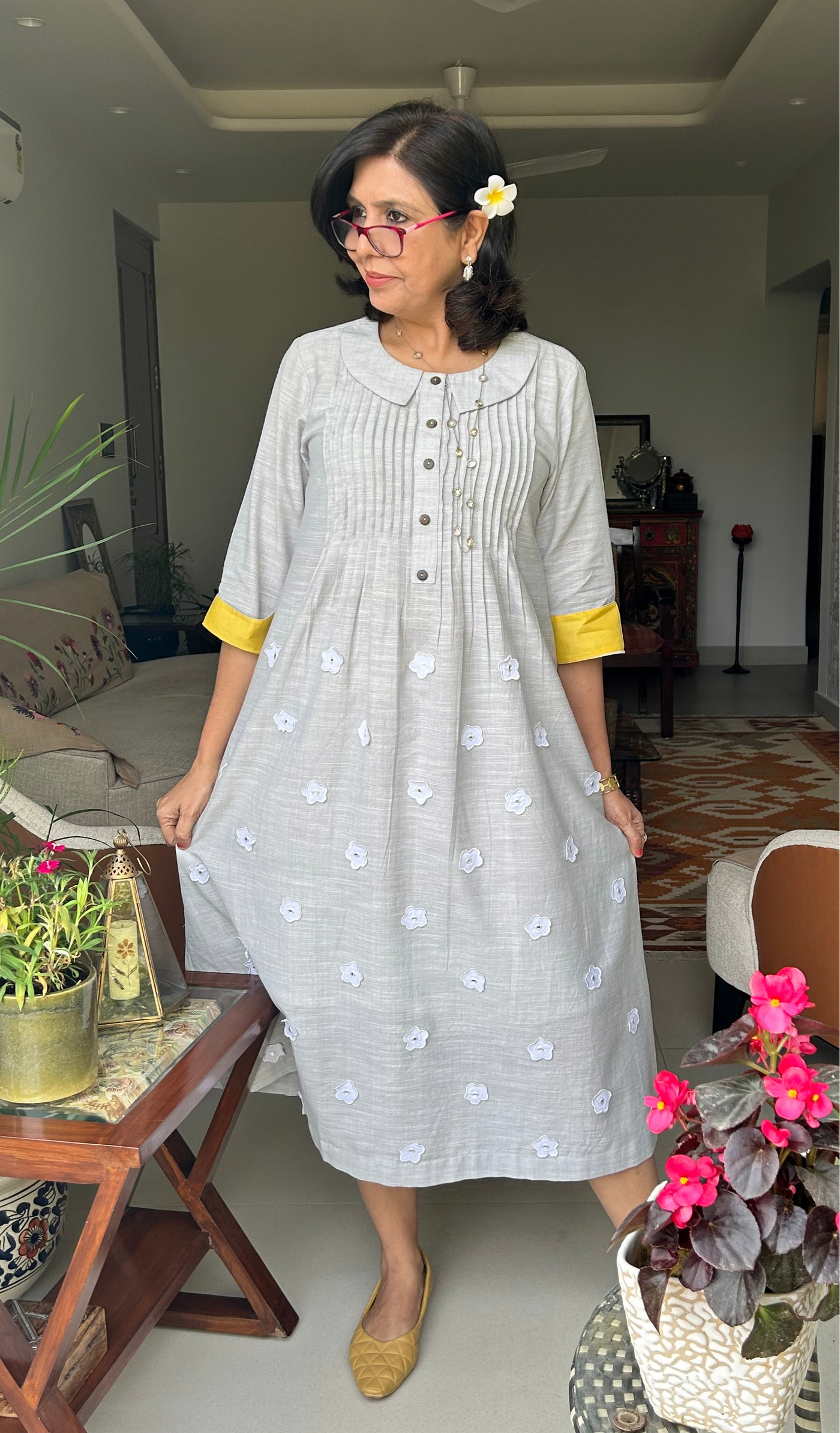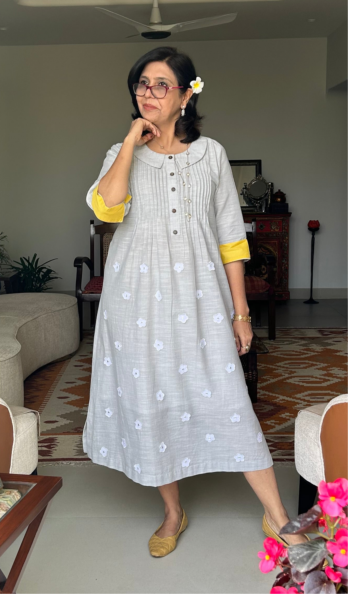 A pure handwoven cotton dress with pleating, appliqué embroidered flowers and contrasting sleeve edgings and a pocket.
