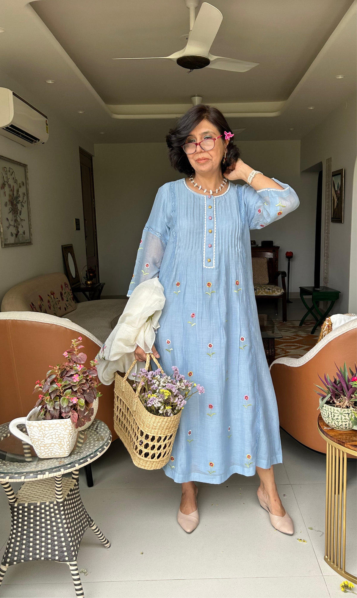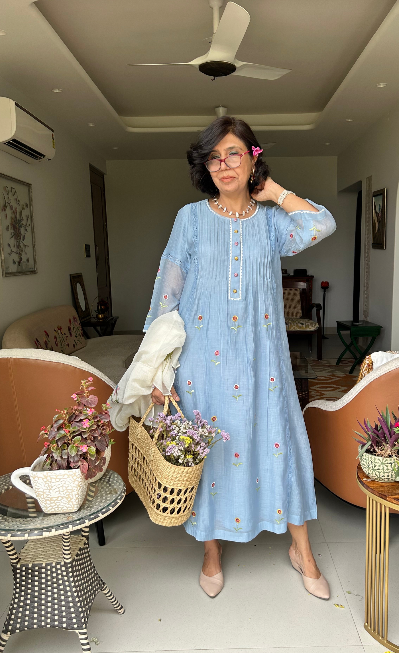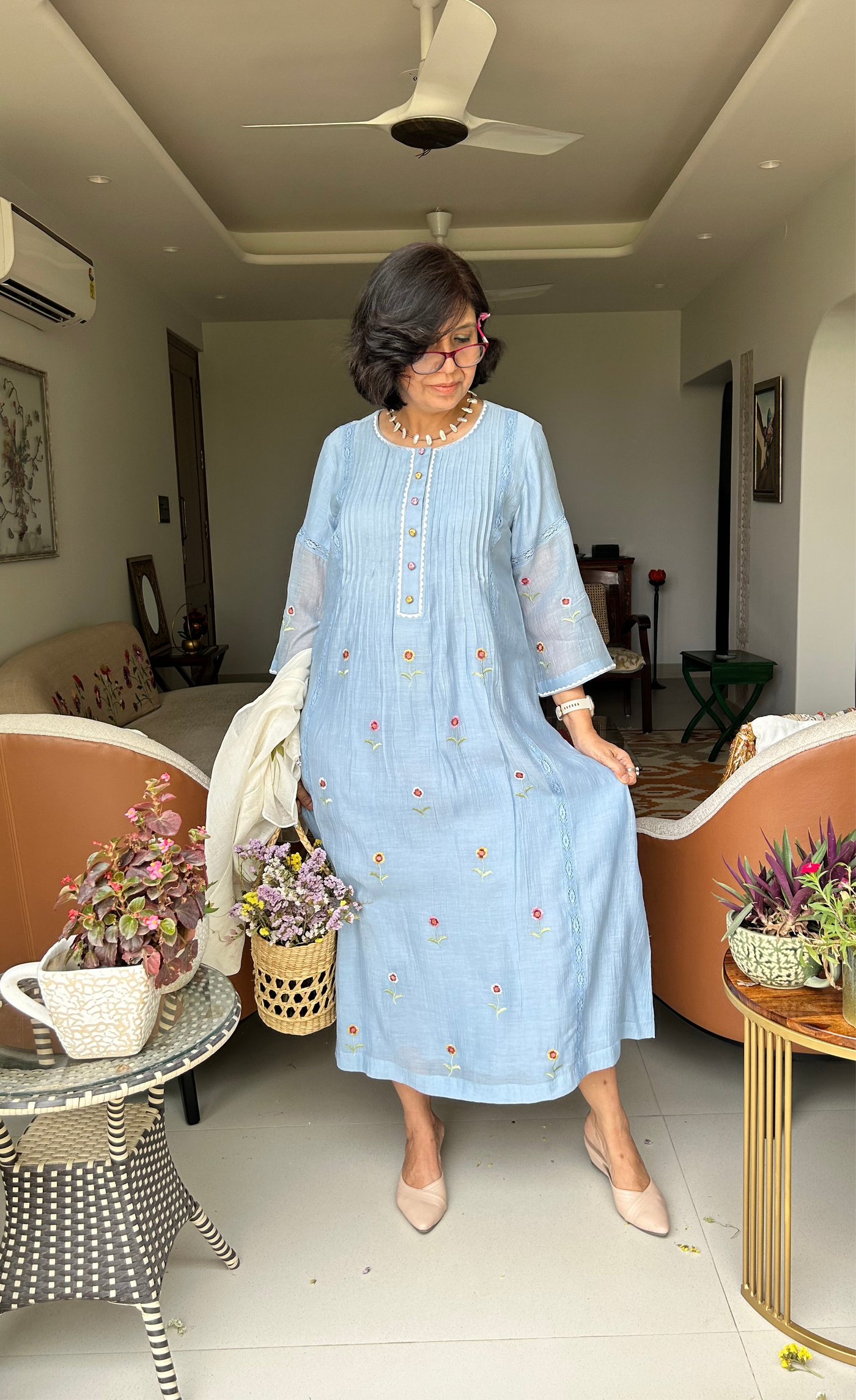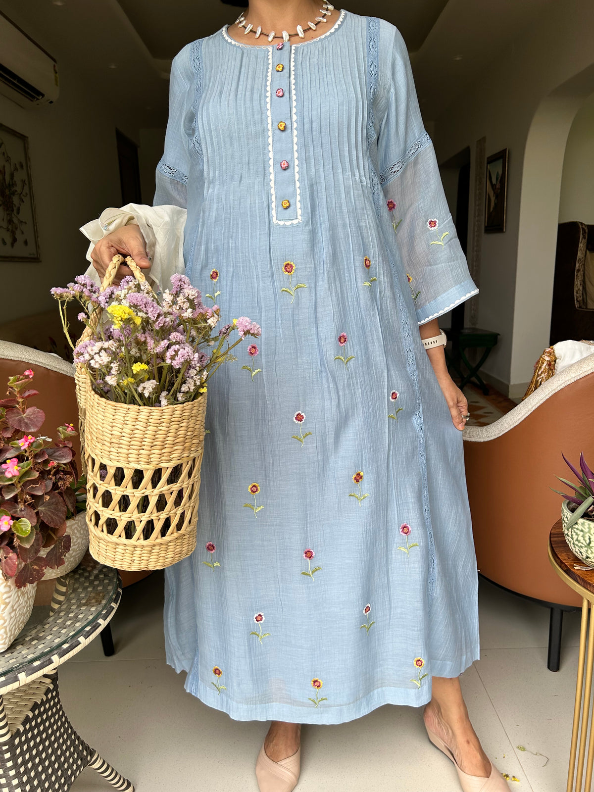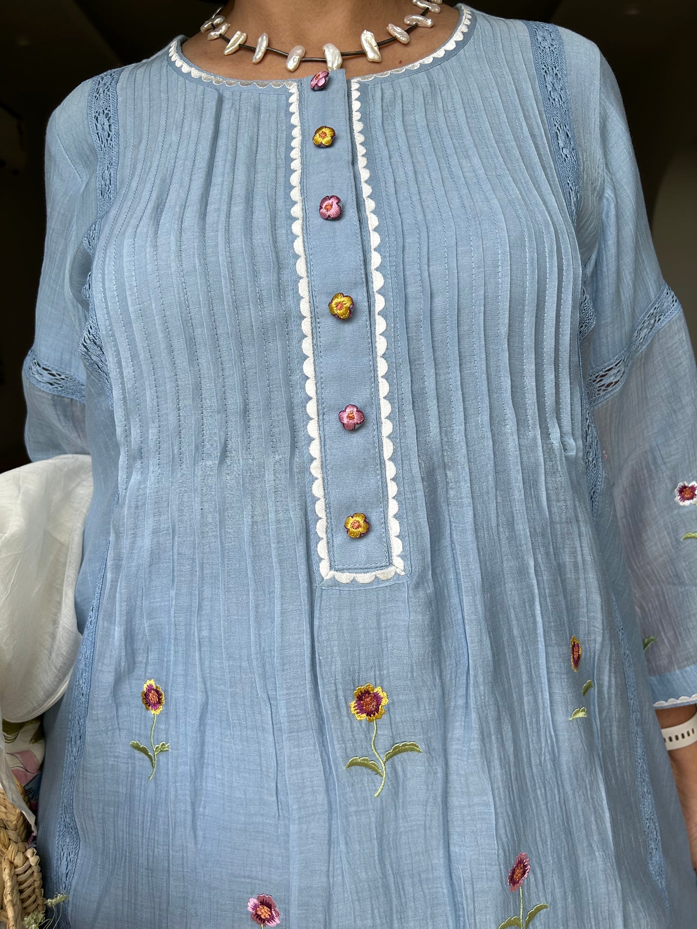 A pure soft muslin dress with multicoloured floral thread embroidery, pleating , embroidered buttons with pocket and lining.