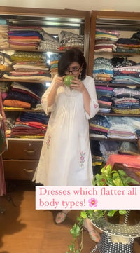 A pure cotton dress with pleating, scallop , lace, pockets and embroidery detailing. It comes with a semi attached slip.