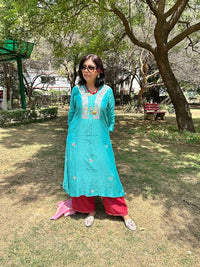 A pure chanderi muslin dress/kurta with multicoloured roses appliqué, pleating and pocket detailing. The dress/kurta is a great wear for summer festivity.