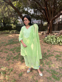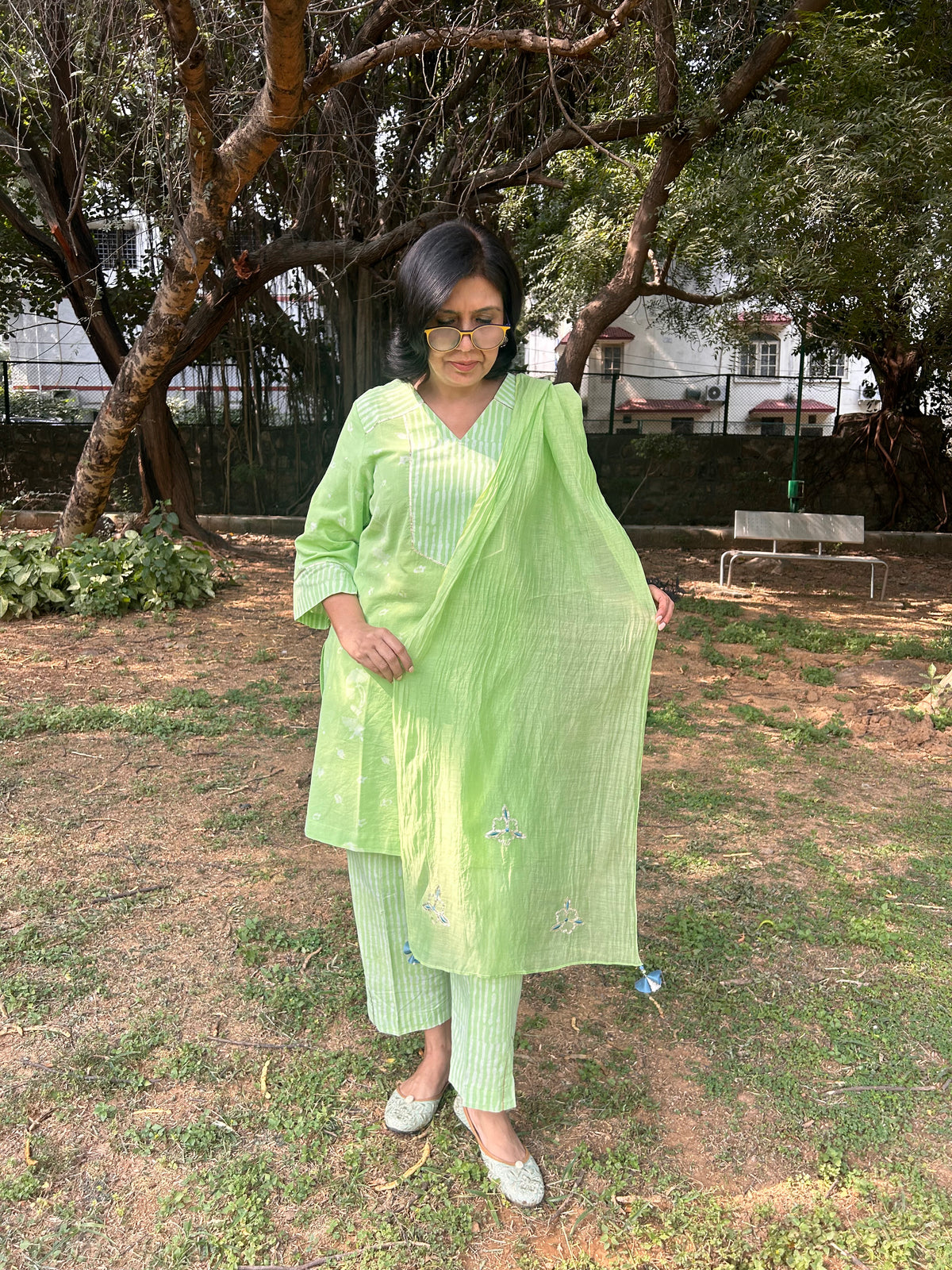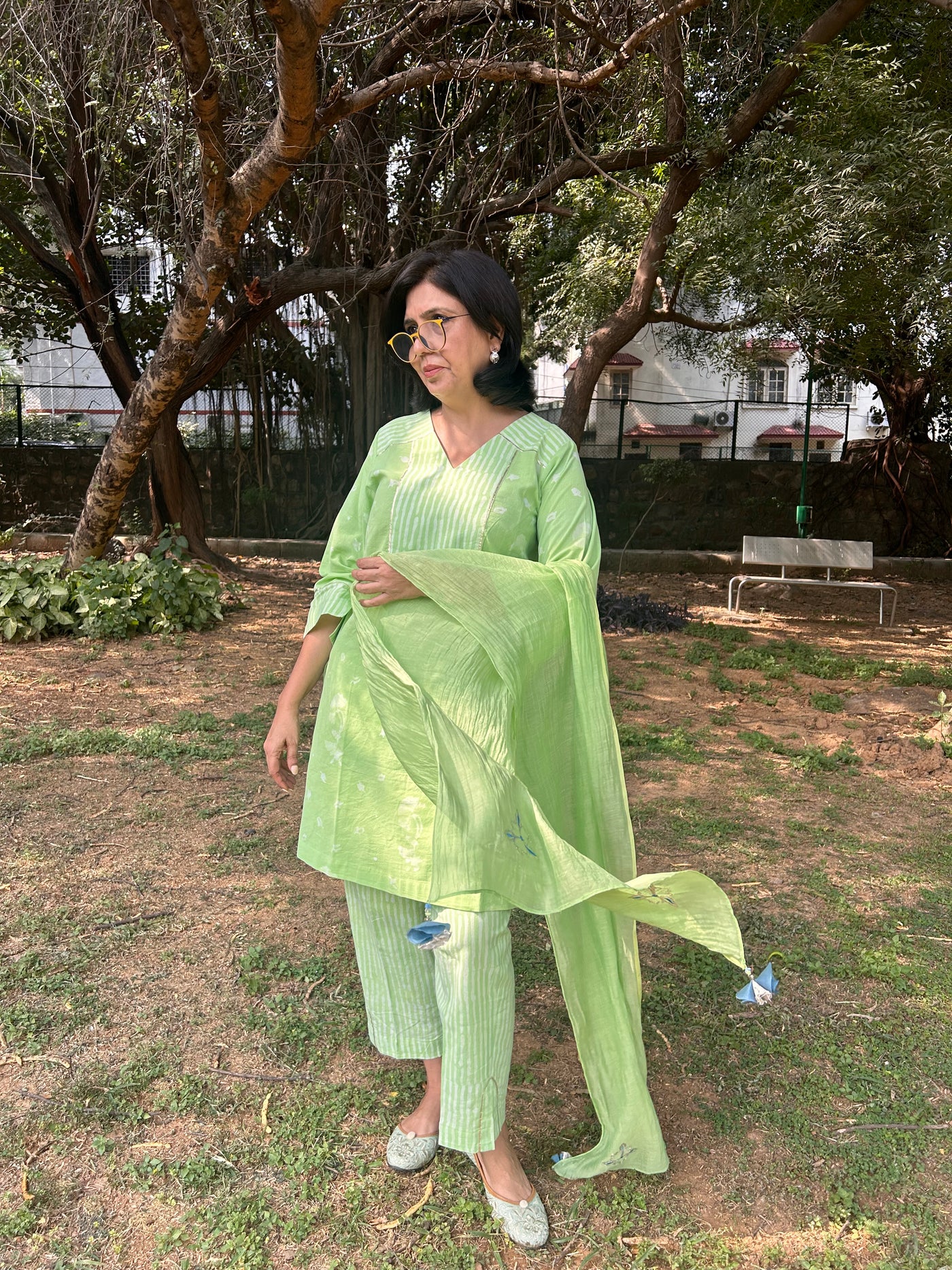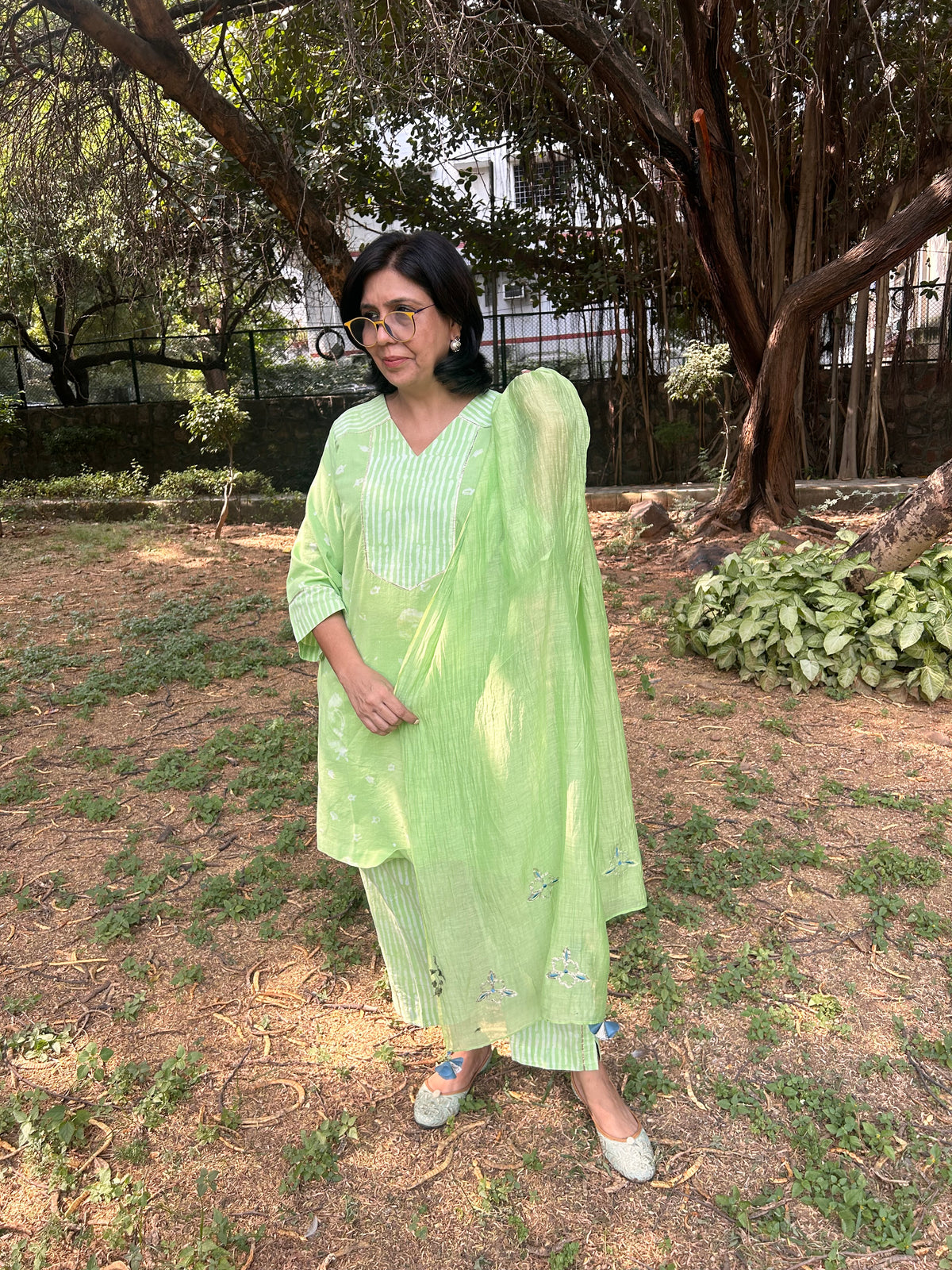 A pure chanderi muslin stole with Gota and thread flower motifs on the 2 ends with contrast handmade tassles.