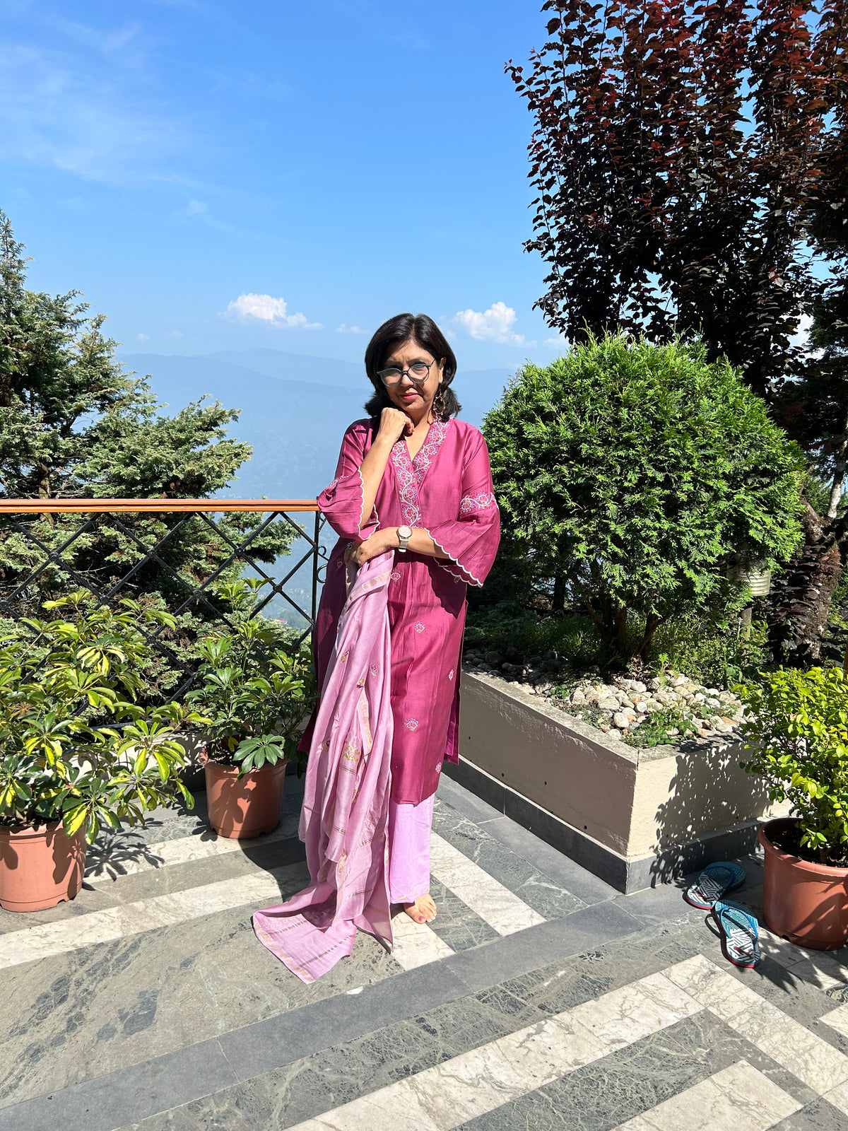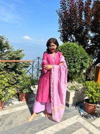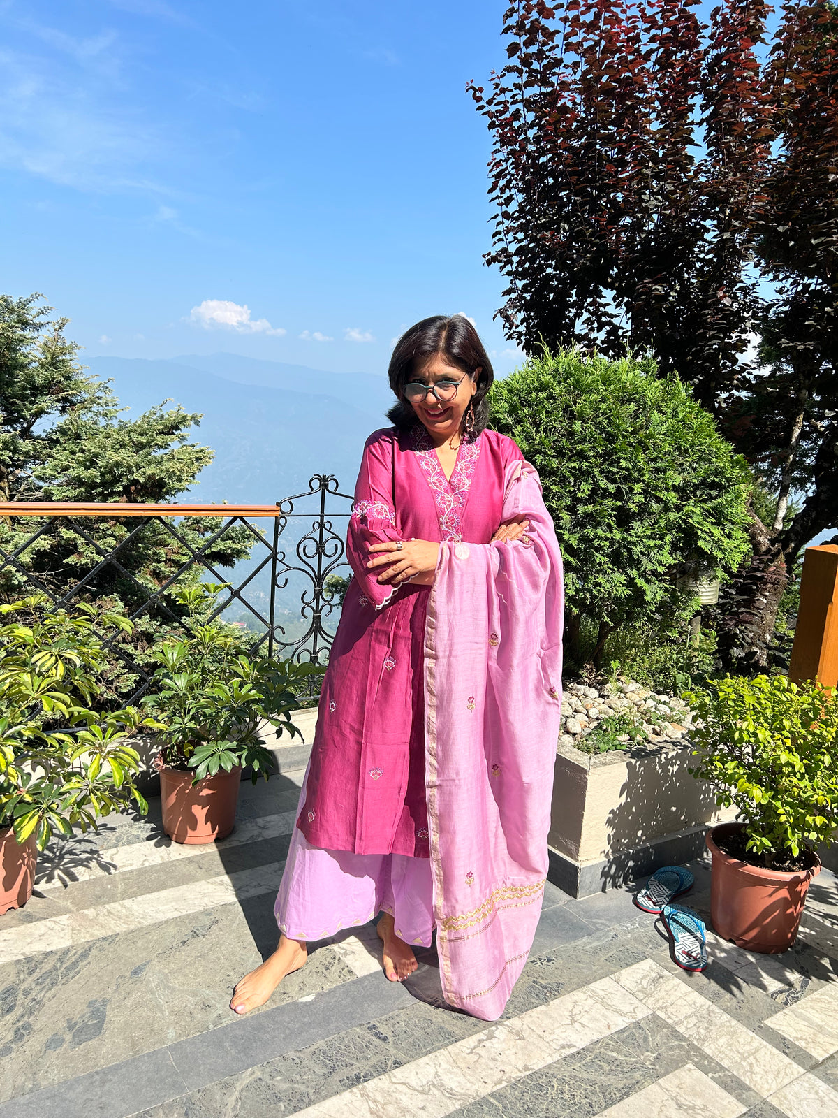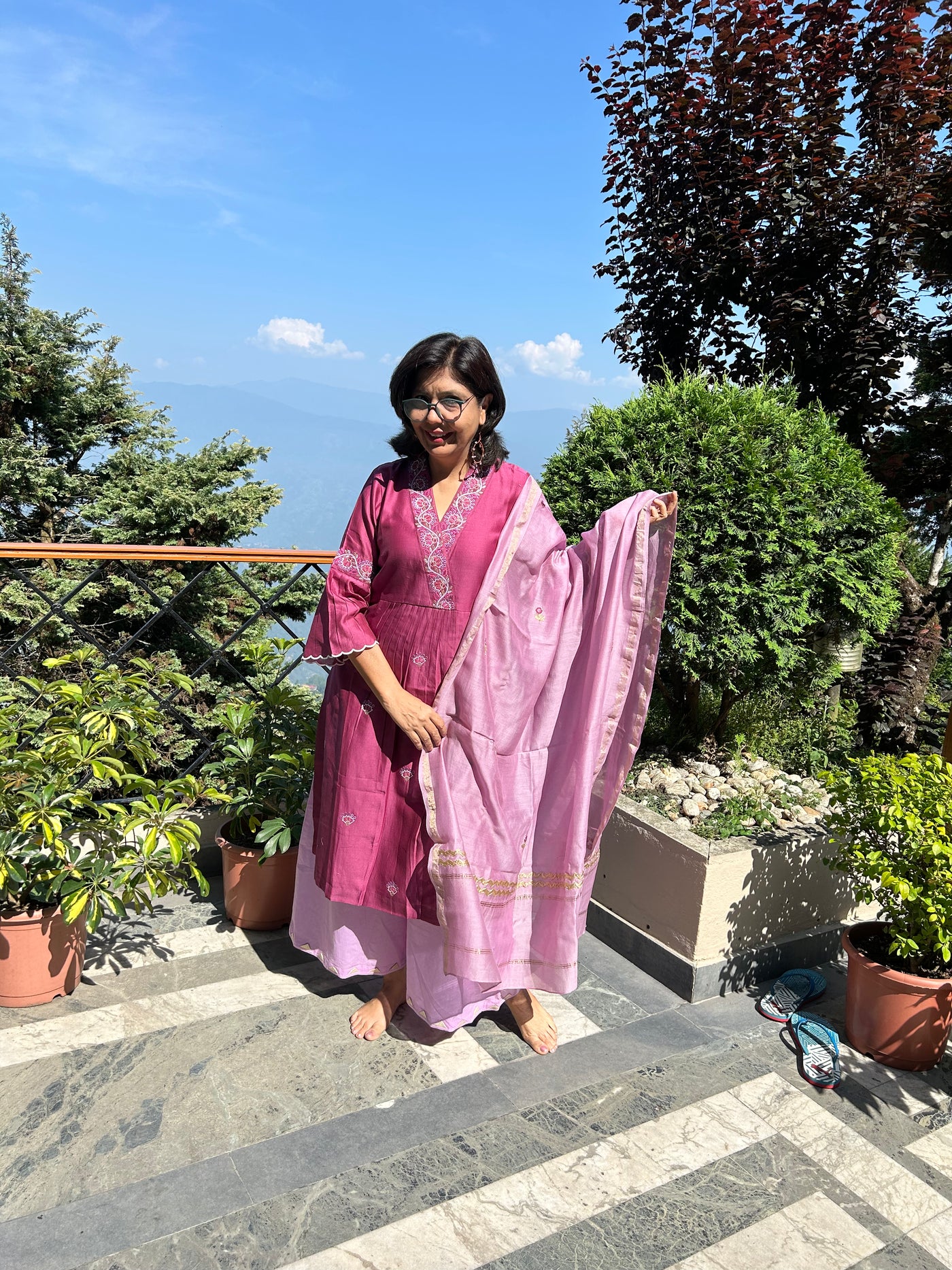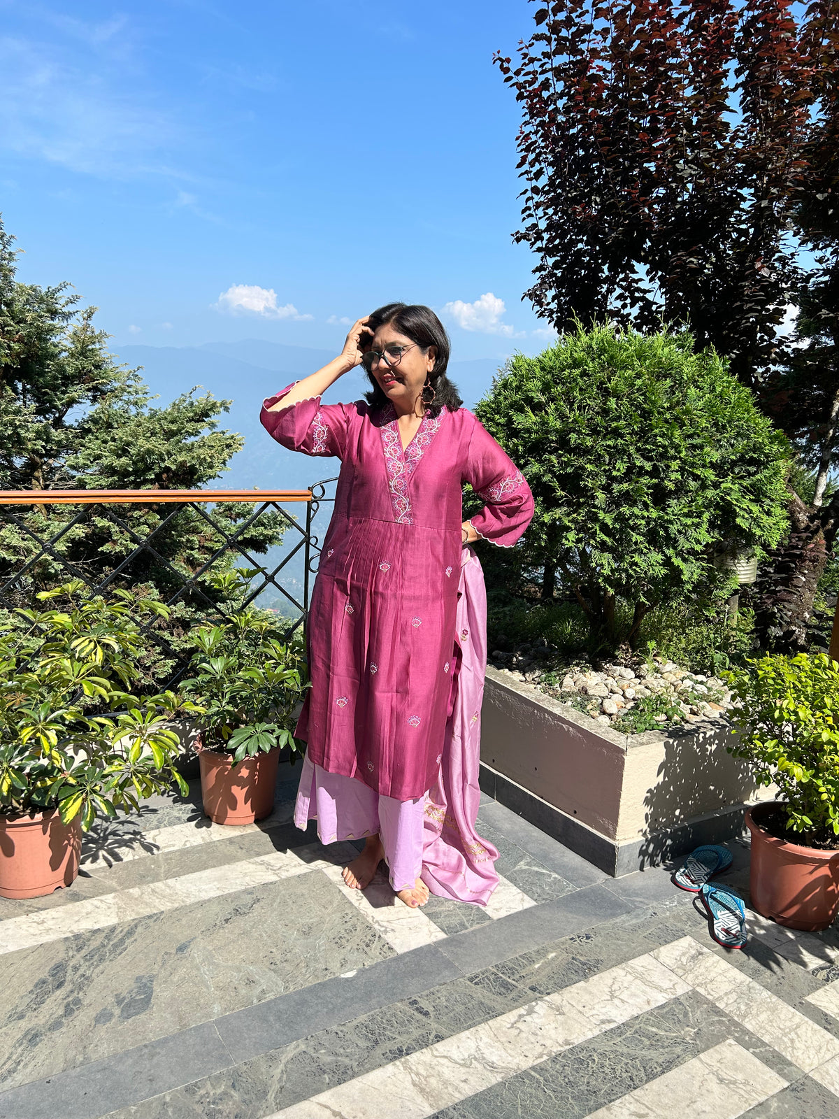 A pure Chanderi silk kurta with intricate thread floral embroidery with pleating detailing.