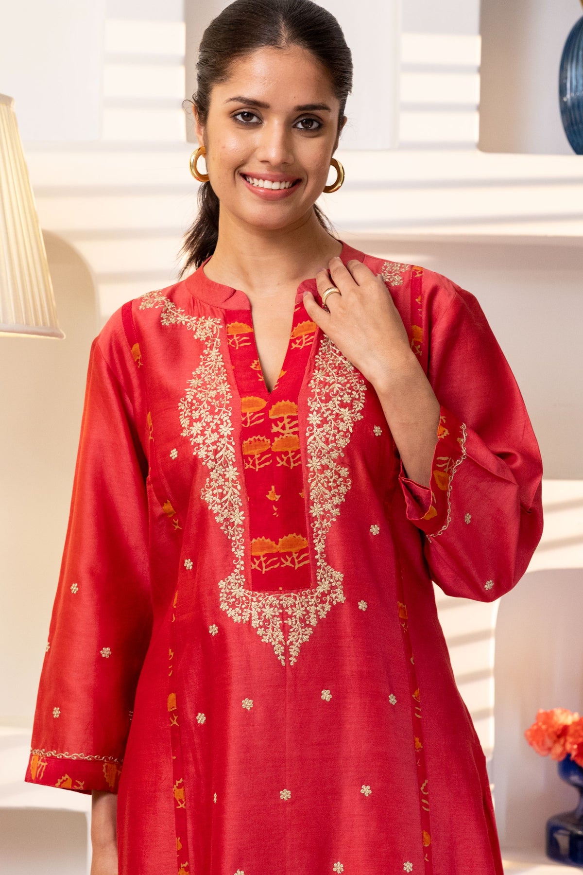 Elevate your festive look with this regal kurta set crafted in pure Chanderi silk and paired with cotton-silk pants for timeless elegance.