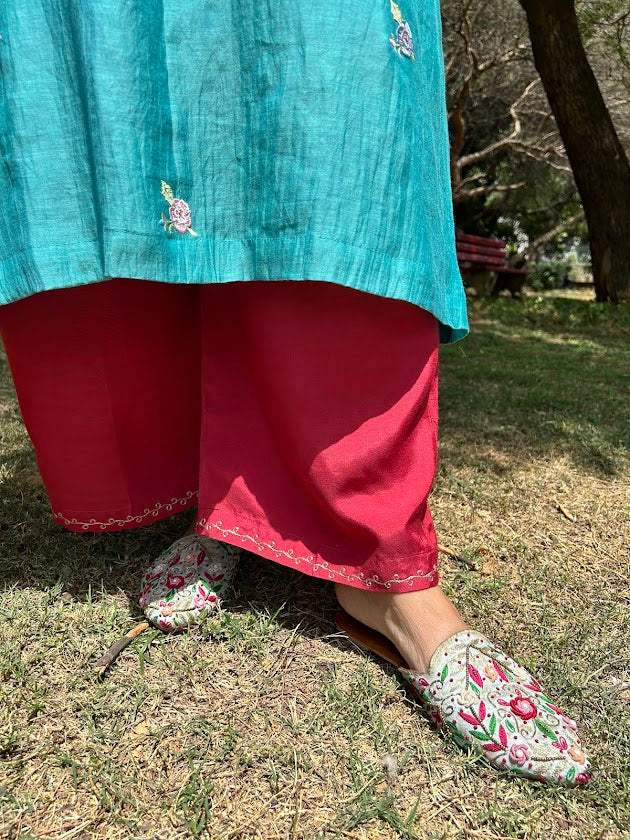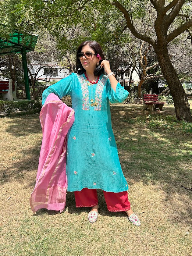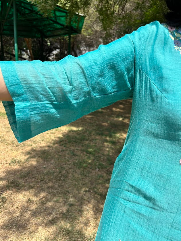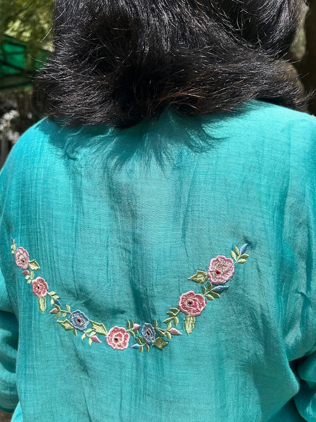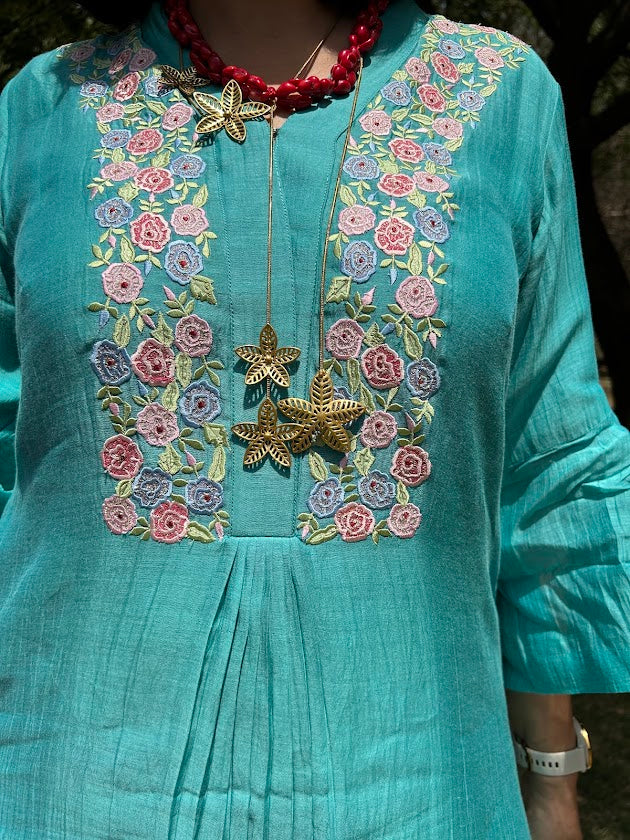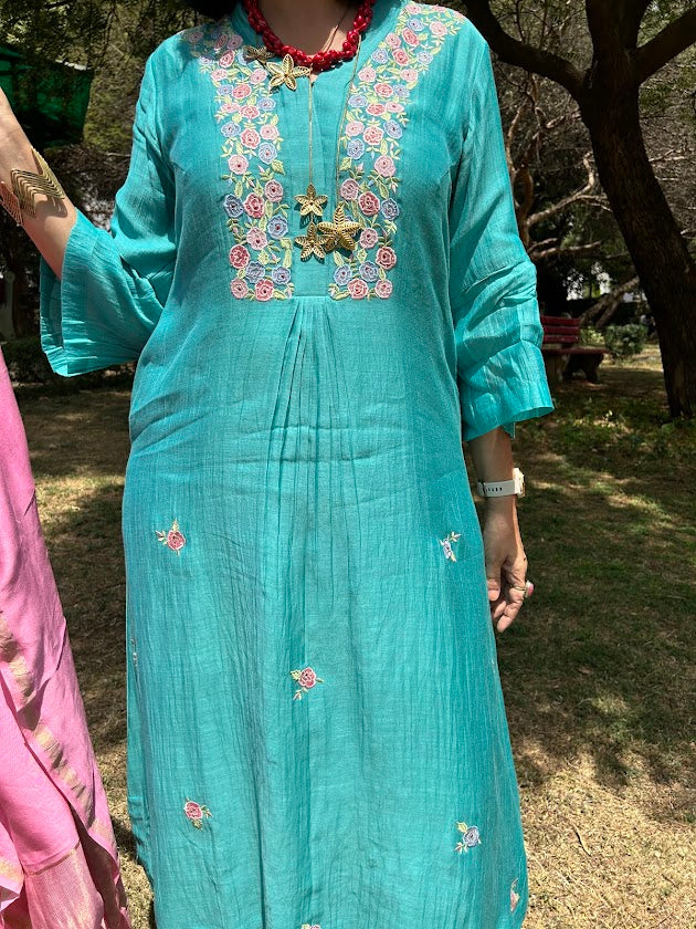 A pure chanderi muslin dress/kurta with multicoloured roses appliqué, pleating and pocket detailing. It can be paired with a bottom and dupatta too. The dress/kurta is a great wear for summer festivity.