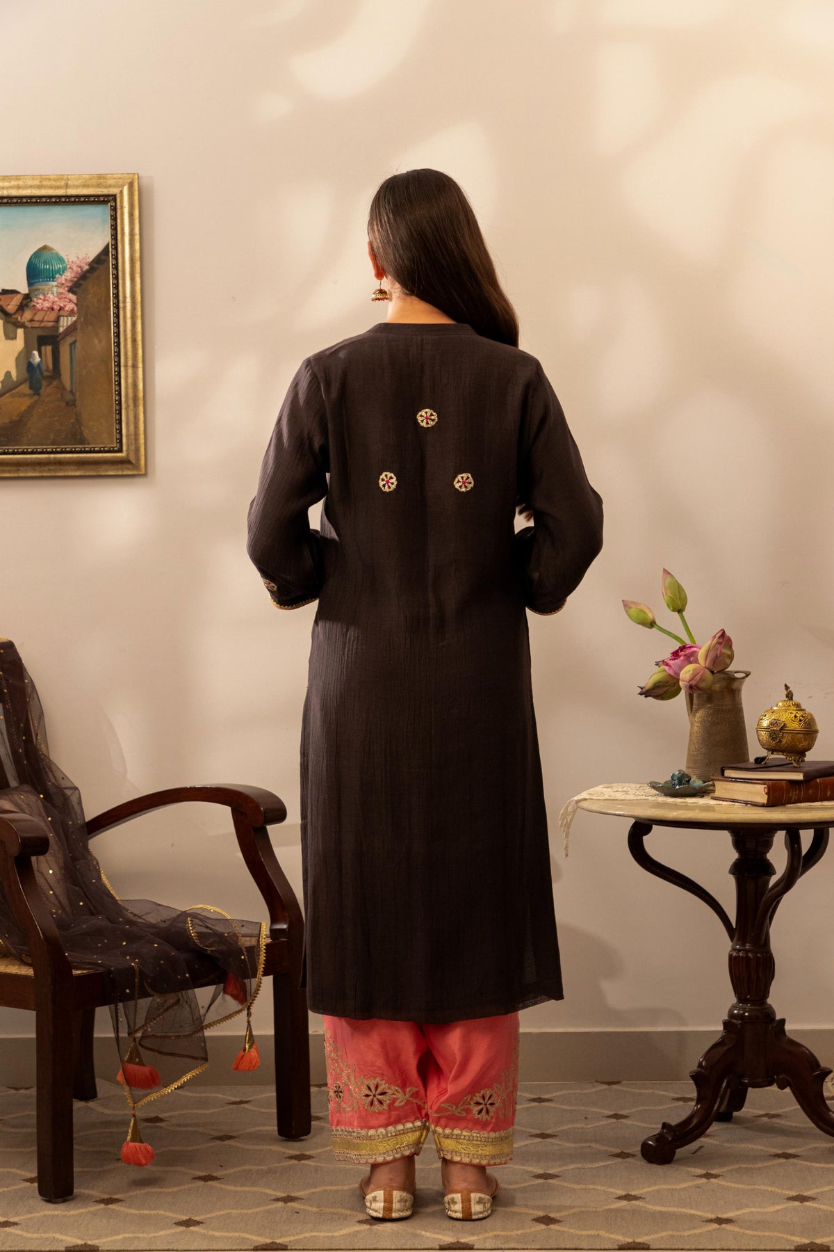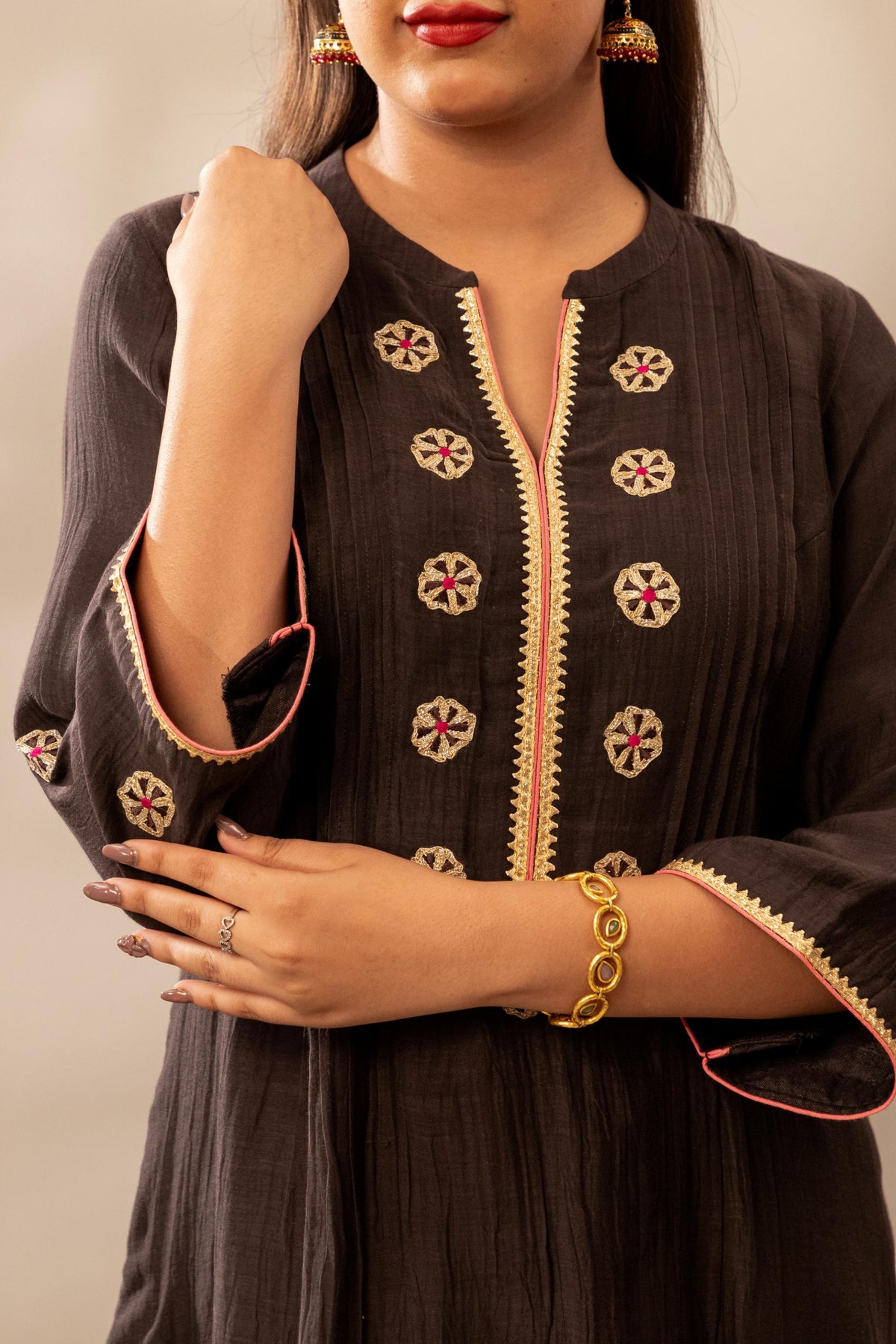 - Kurta Fabric: Chanderi muslin in deep kajal charcoal with intricate golden gota floral embroidery around the neckline and sleeves.