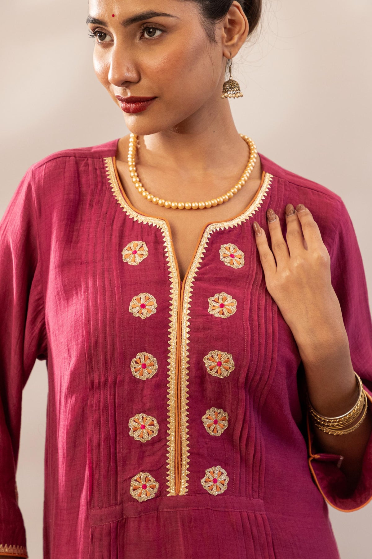 - Kurta Fabric: Chanderi muslin in a deep wine hue with golden gota floral embroidery around the neckline and sleeves.