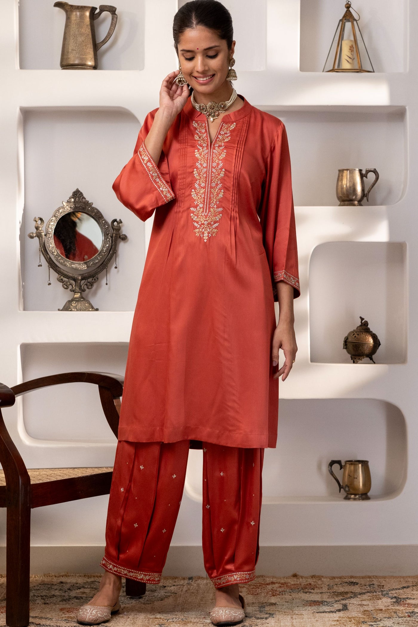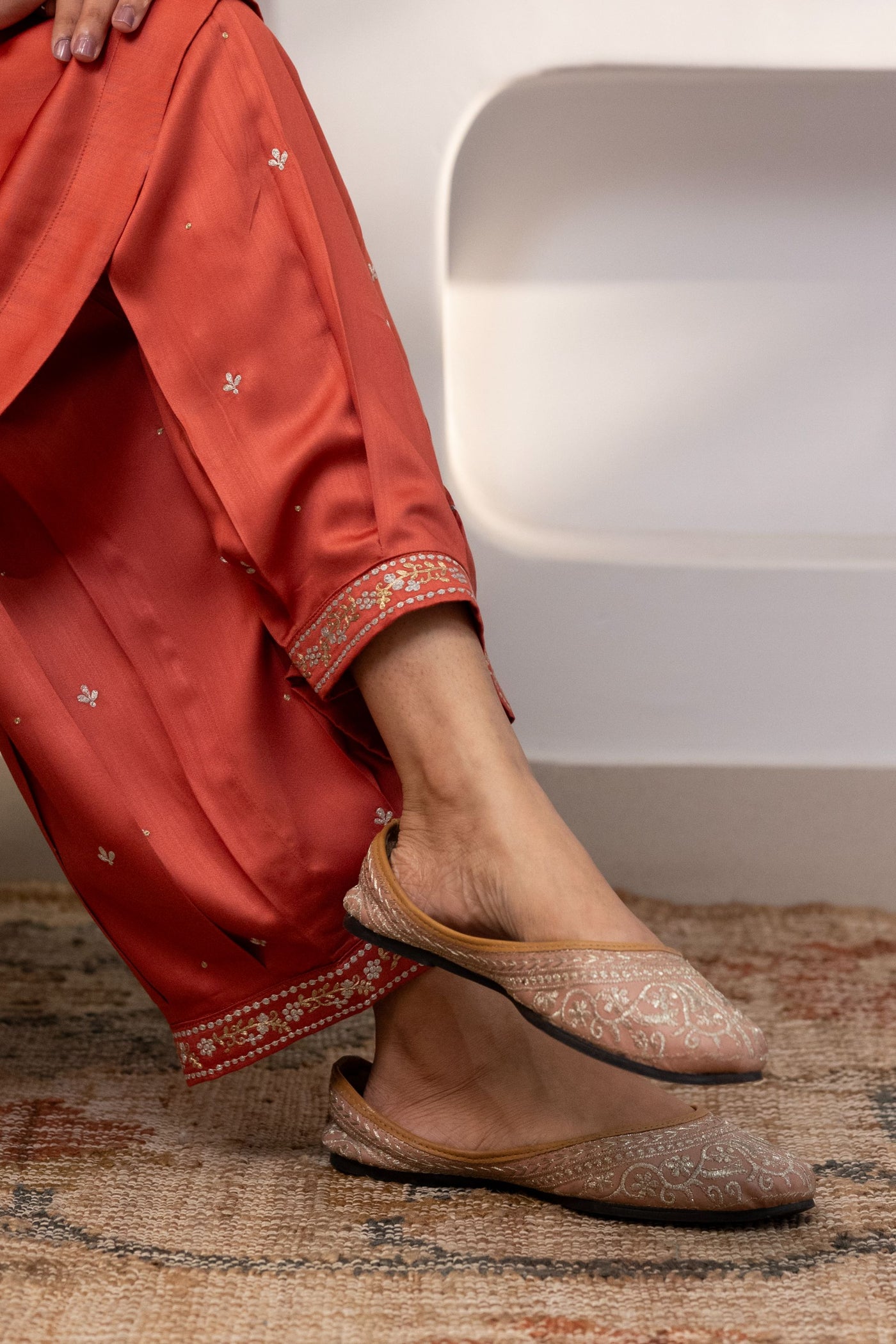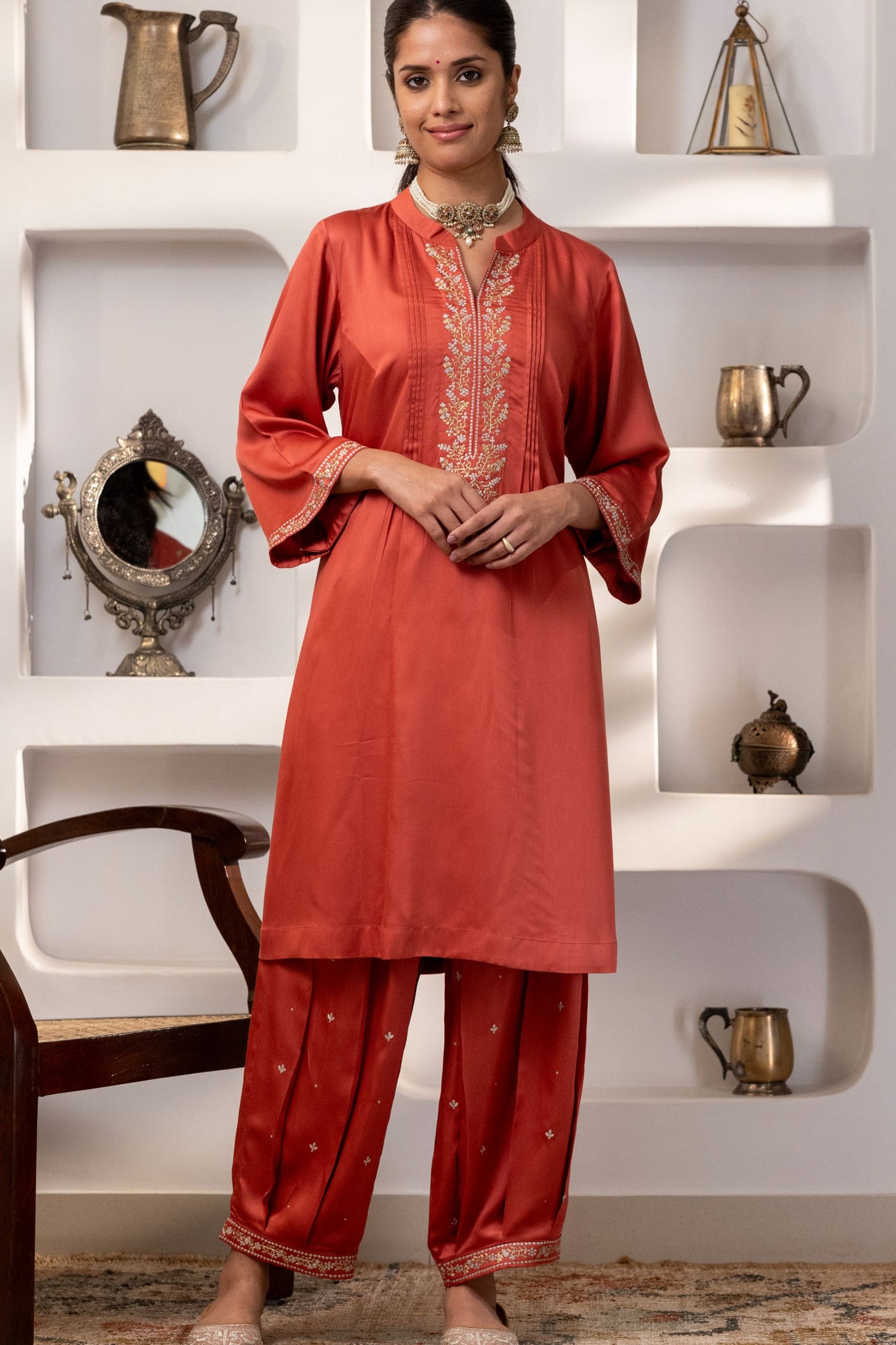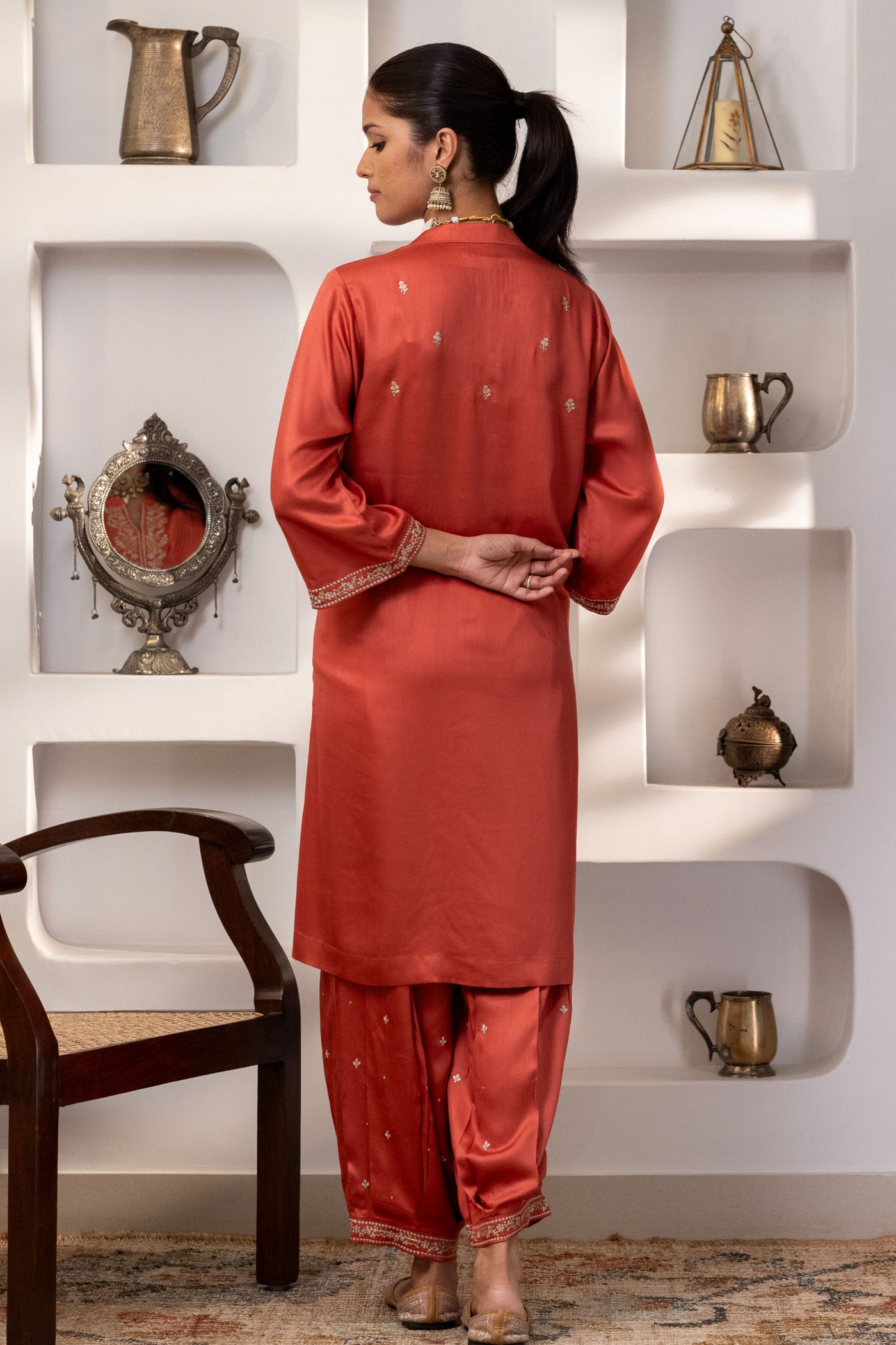 A terracotta-hued kurta set featuring intricate tilla & gota work paired with coordinating pants. Designed for festive warmth and subtle shimmer.