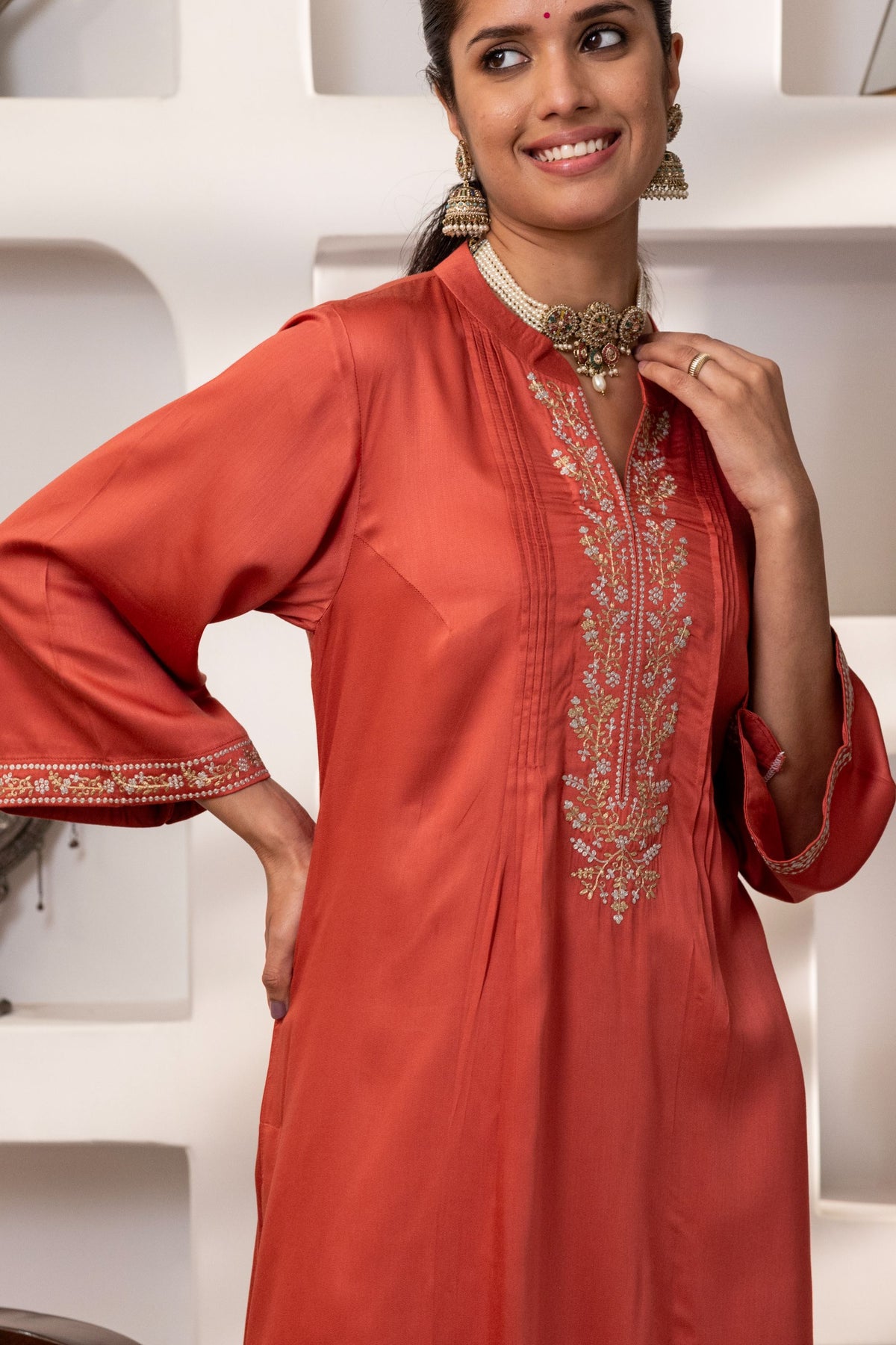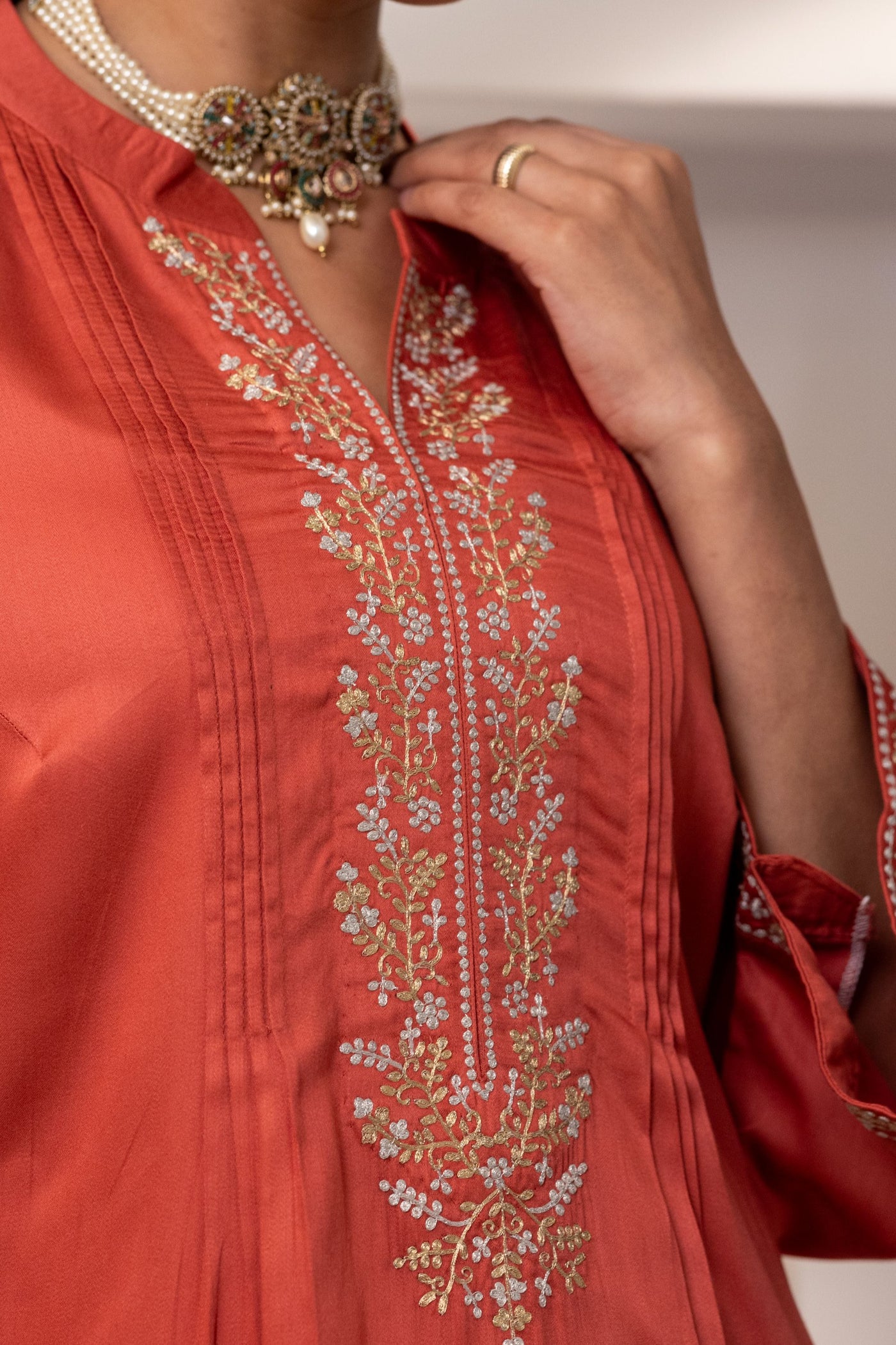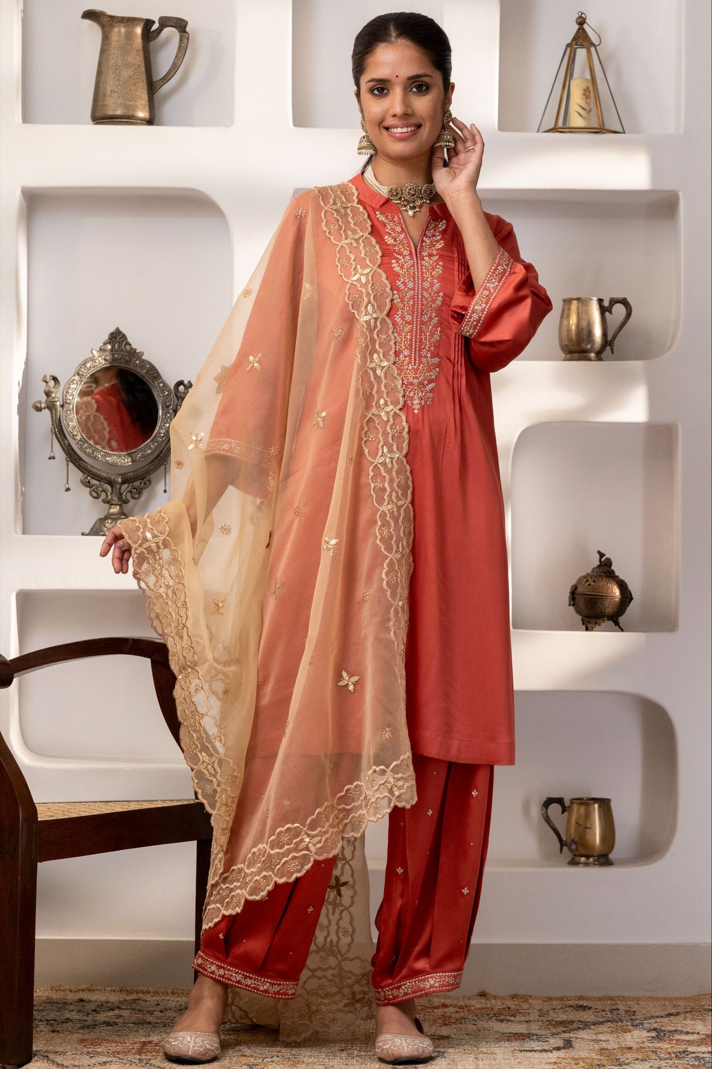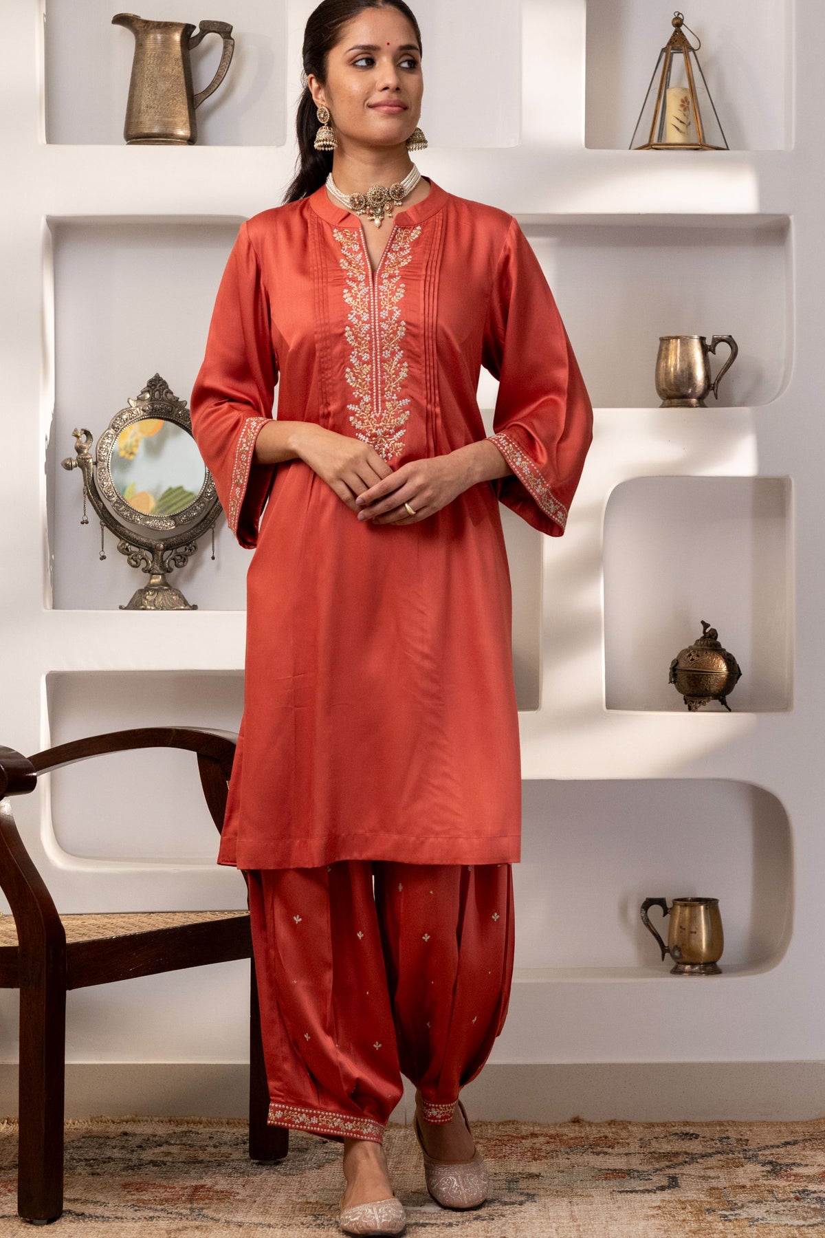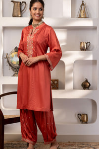 A terracotta-hued kurta set featuring intricate tilla & gota work paired with coordinating pants. Designed for festive warmth and subtle shimmer.