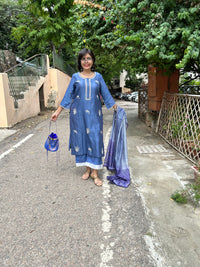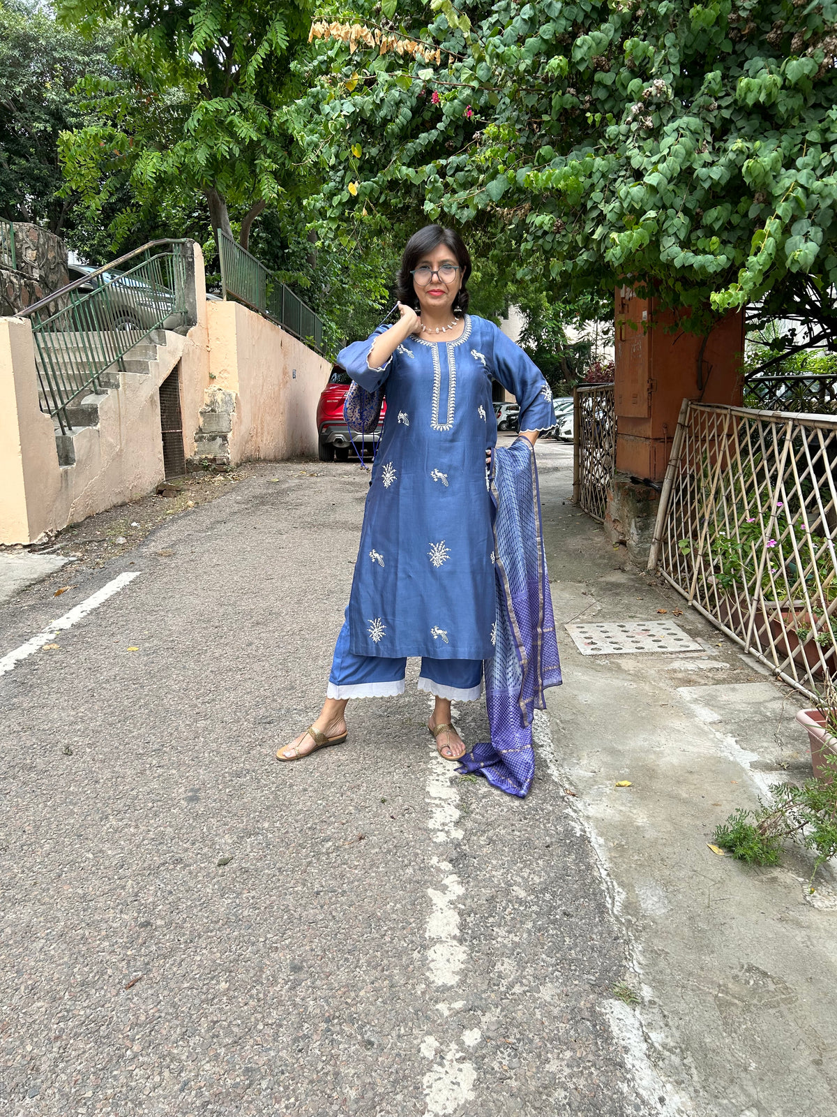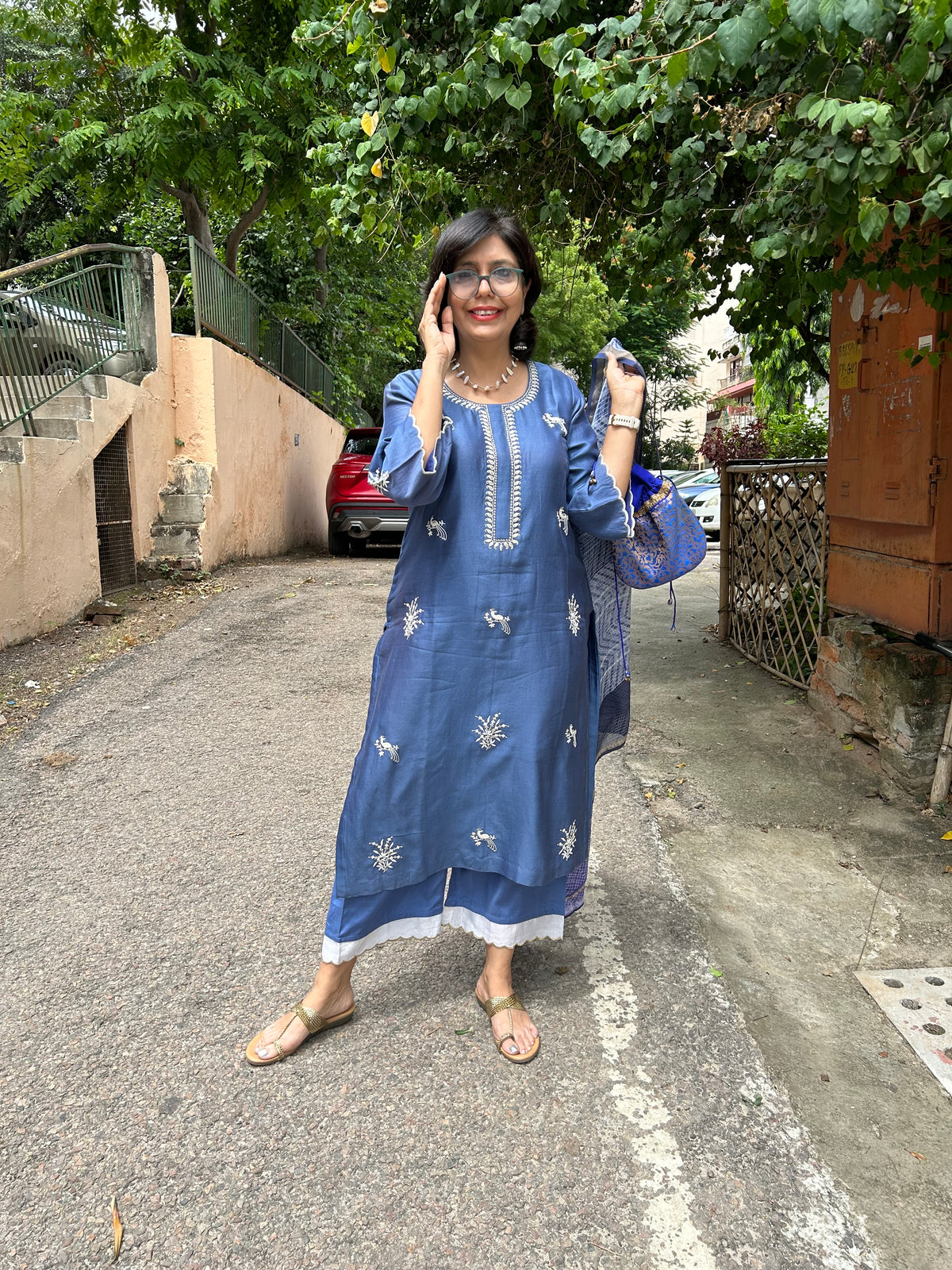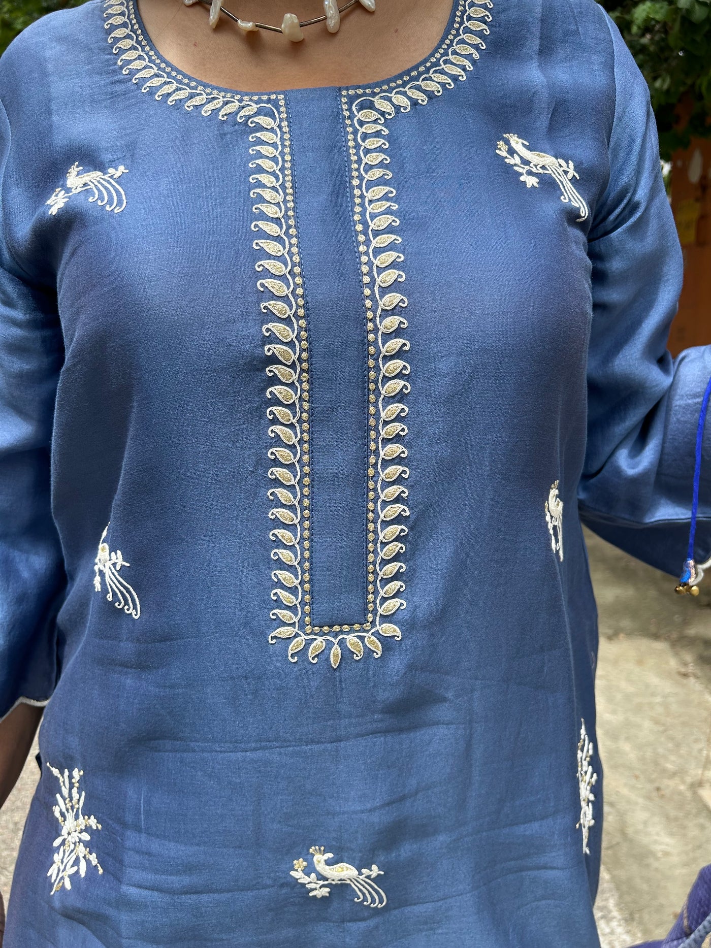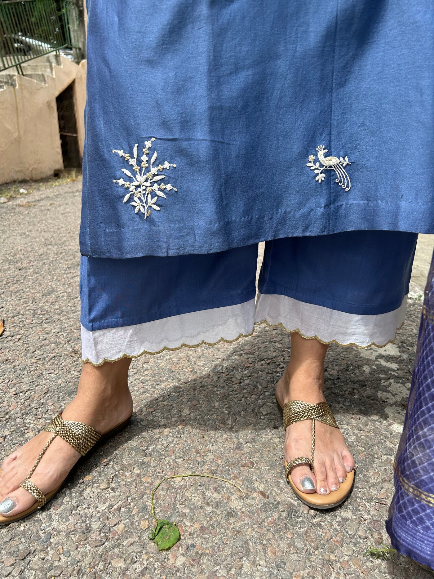 A pure chanderi silk kurta with floral and bird motifs embroidered in dori and tilla is paired with pants with contrast scalloped edgings.