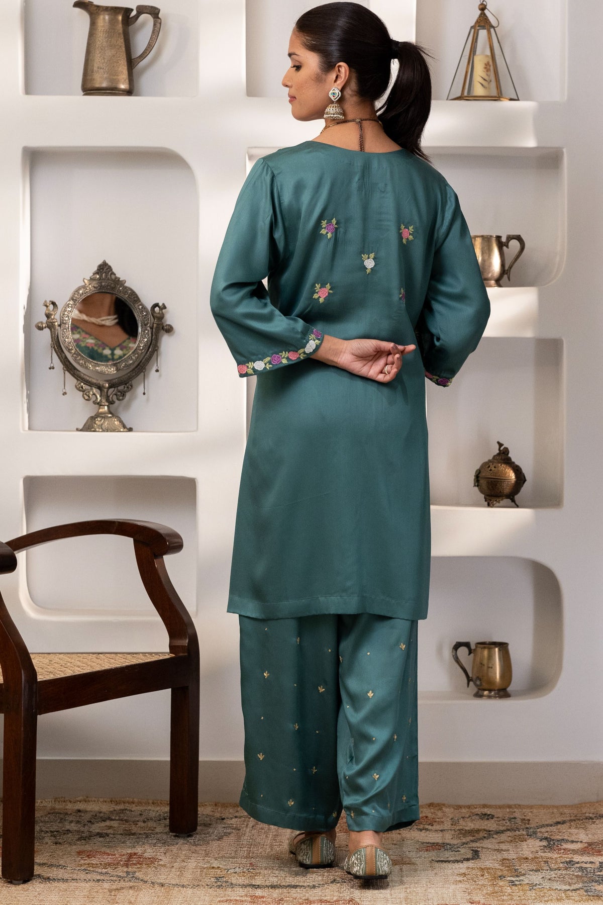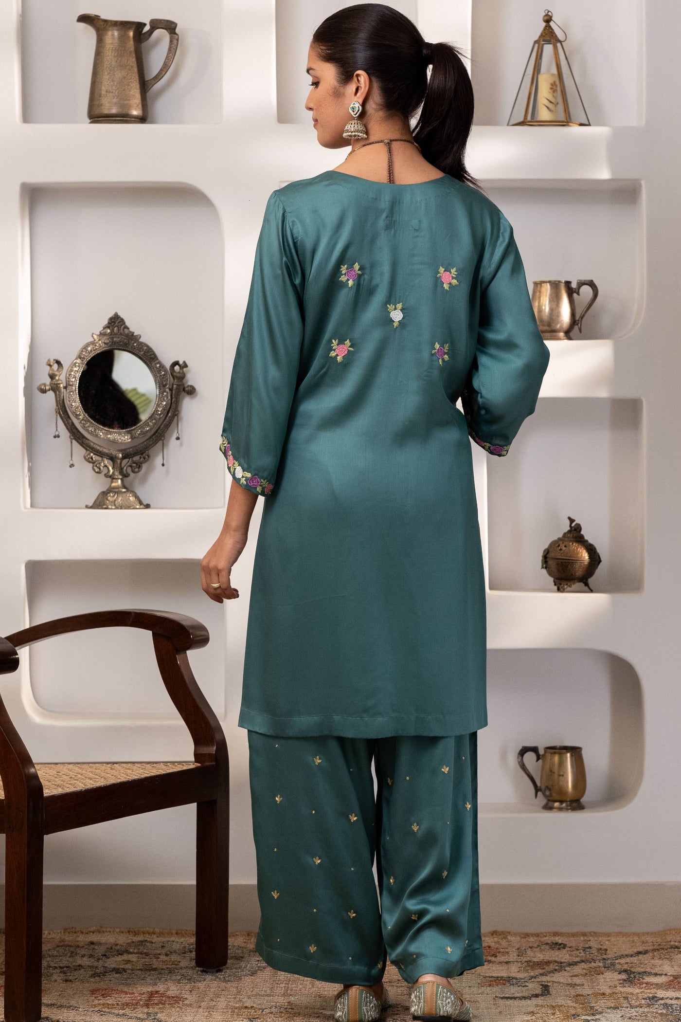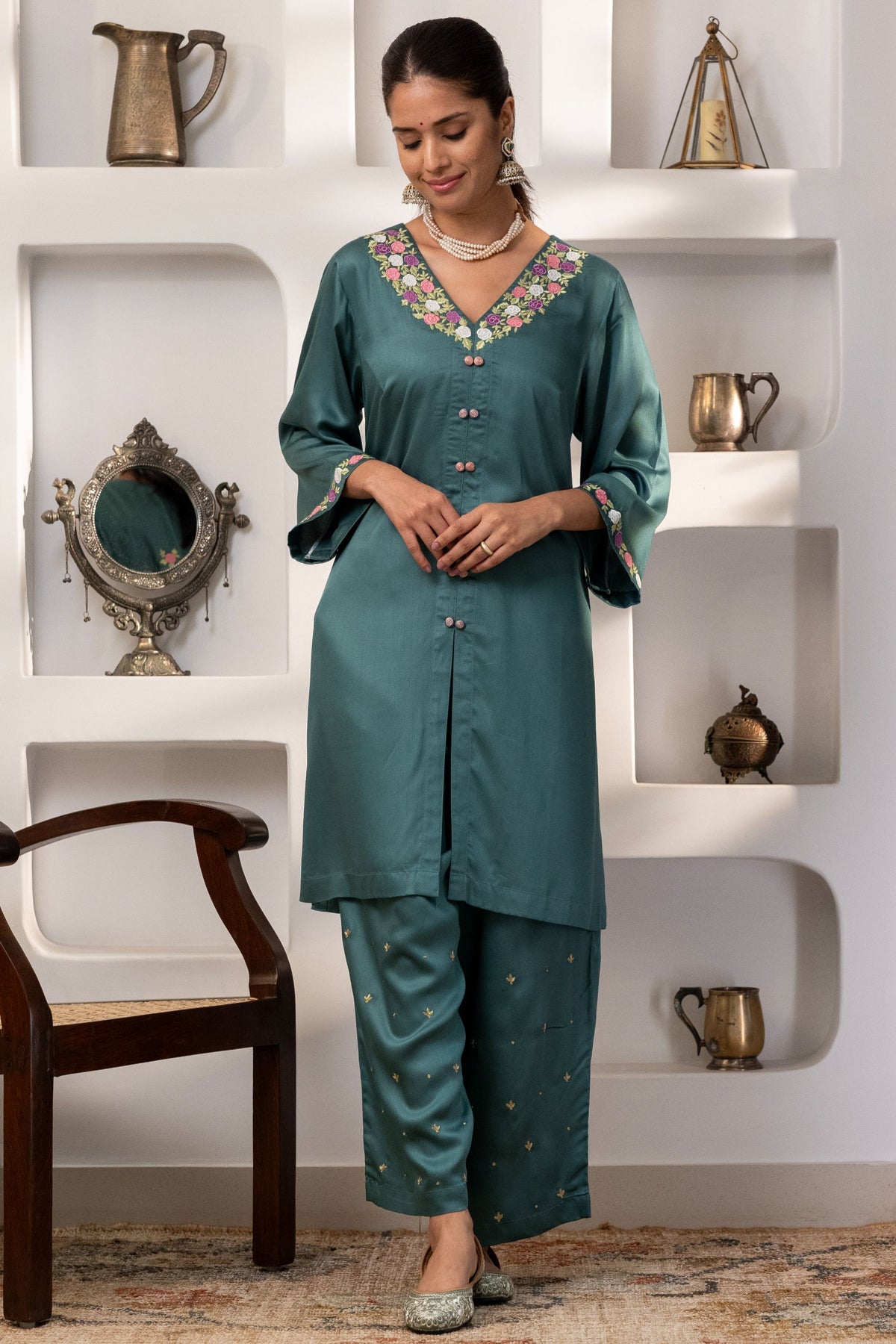 Step into graceful charm with this Victorian rose garden inspired co-ord set crafted in pure modal silk.
