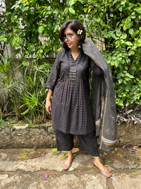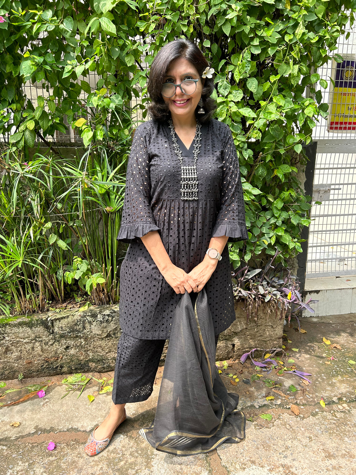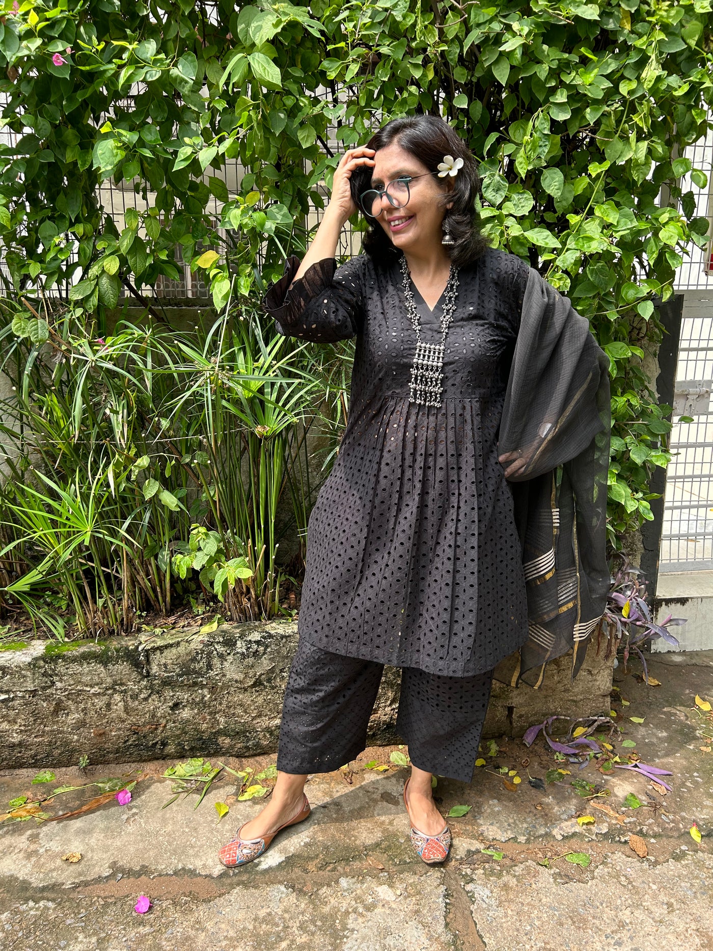 A pure cotton co ord set in schiffli with pleating n frill detailing with pocket in pants.