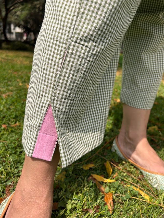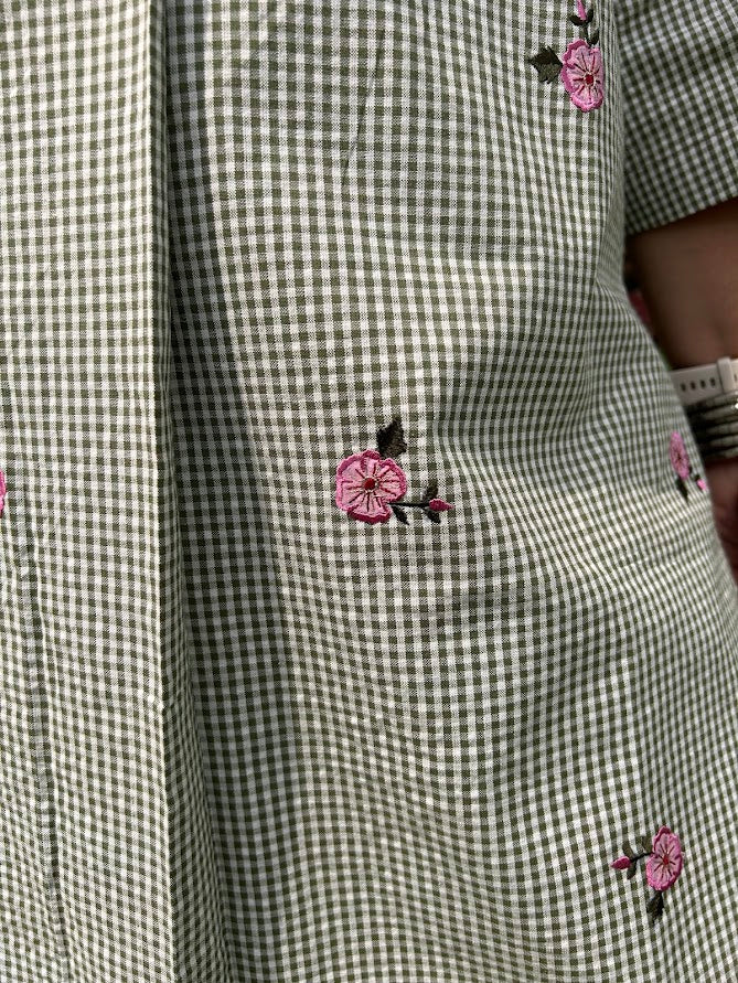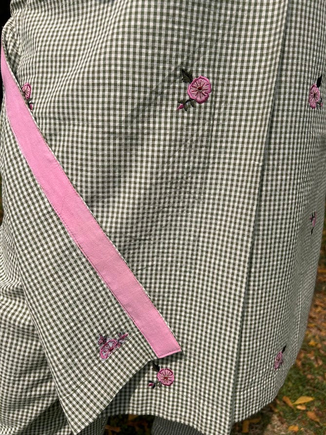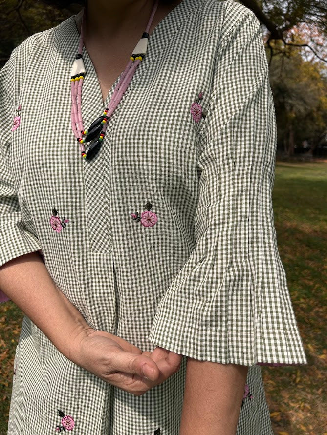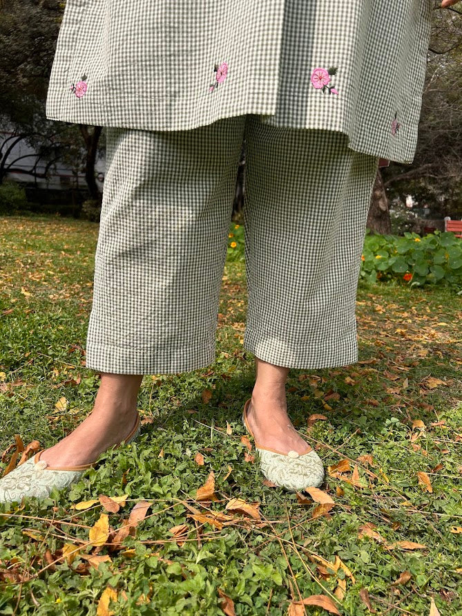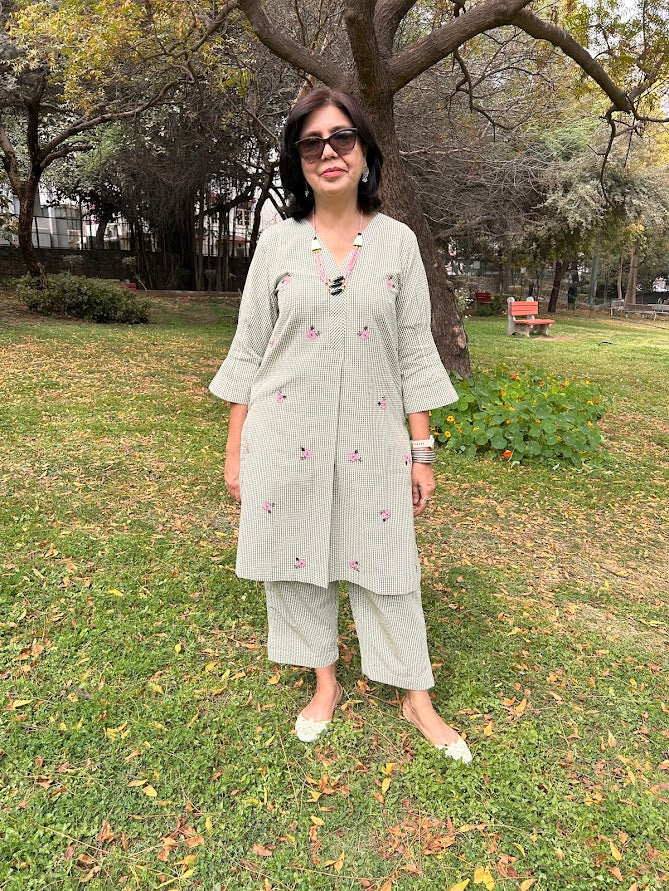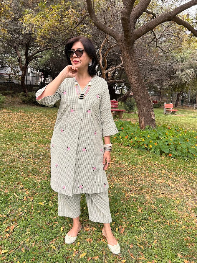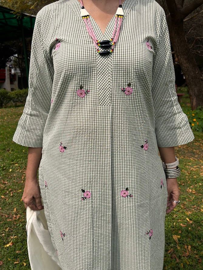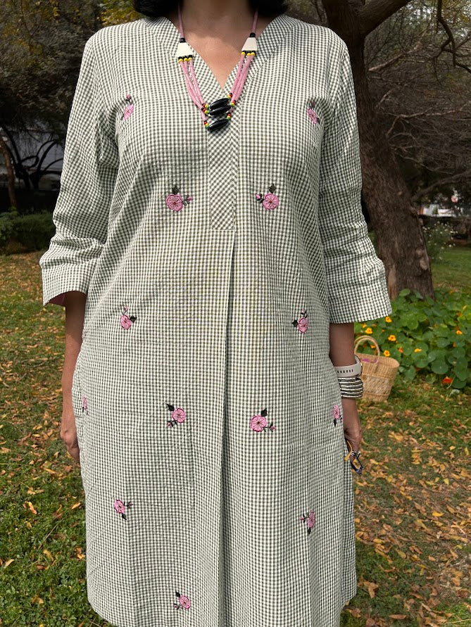A pure cotton micro checks kurta with roses applique embroidery is paired up with pants with pocket is a stylish, easy wear for summer .