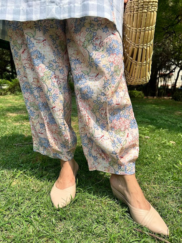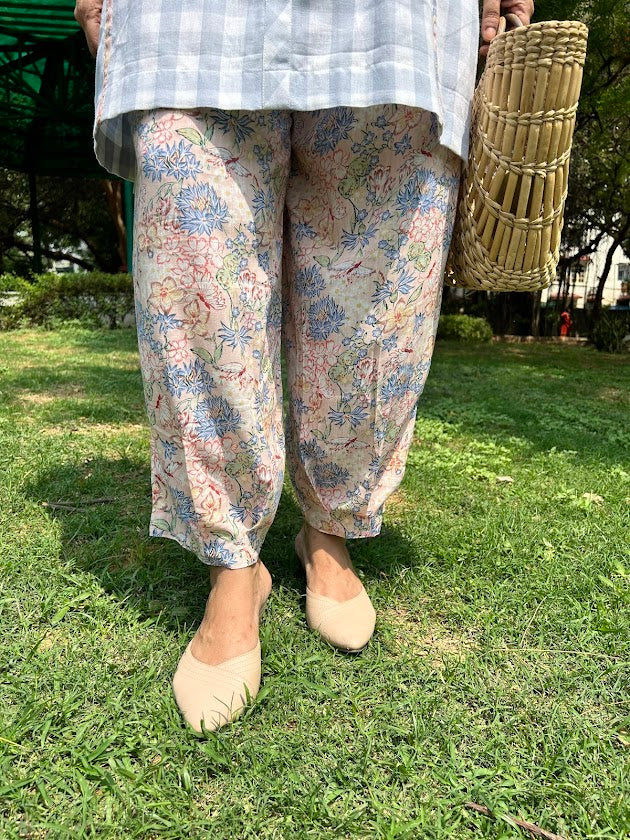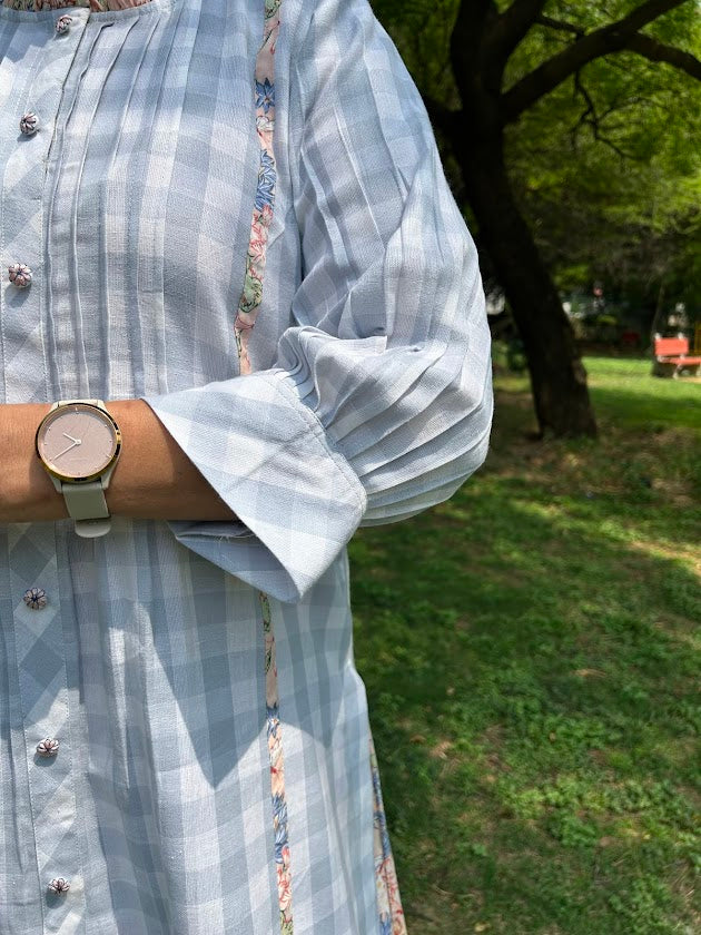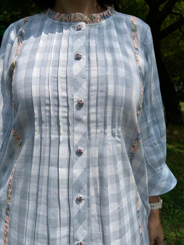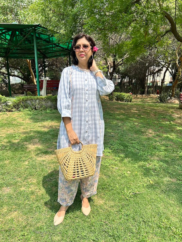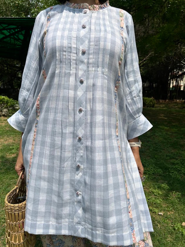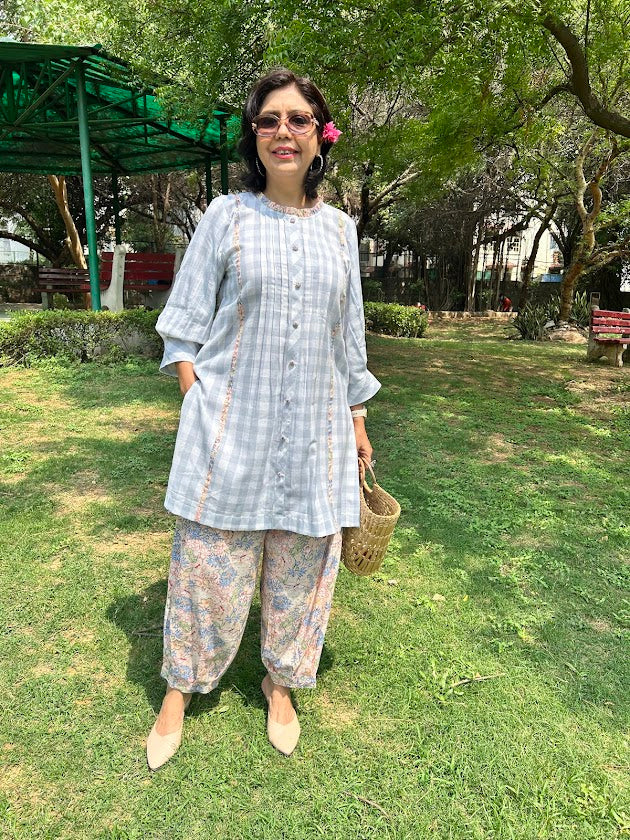checks pale blue cotton kurti with printed edgings is paired with printed linen pleated pants with pocket.