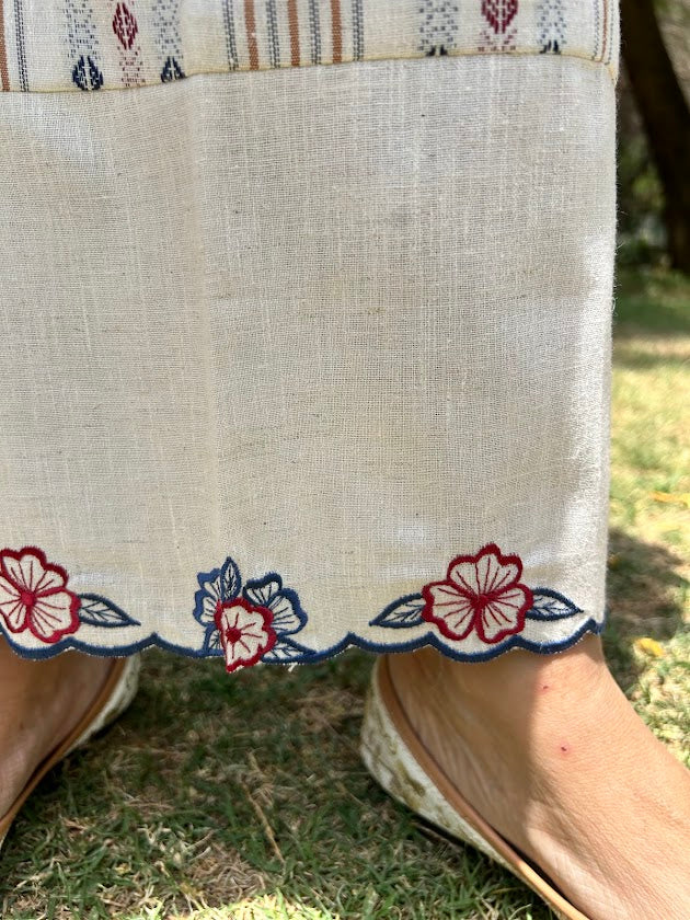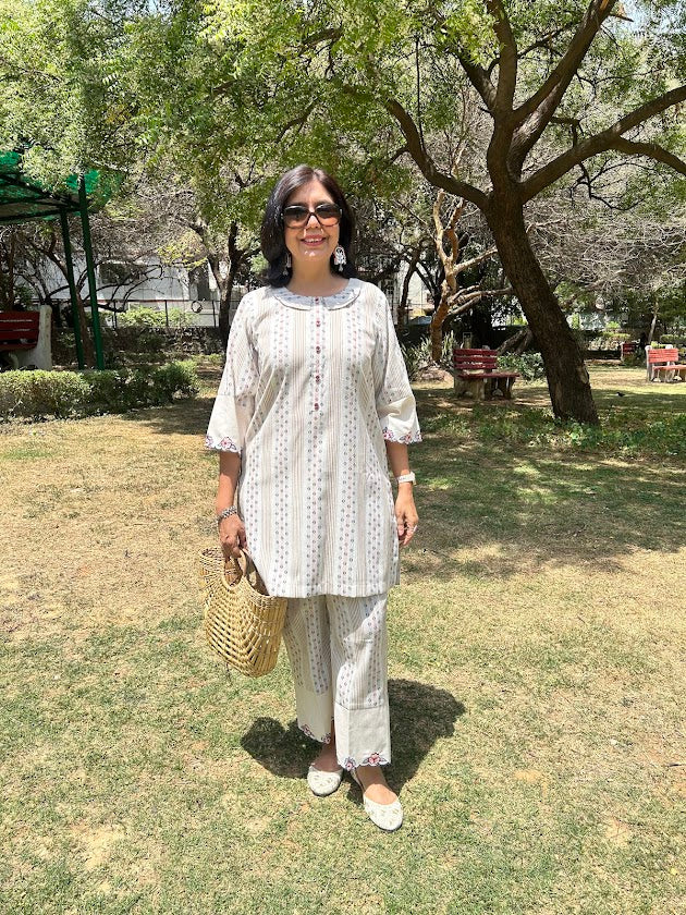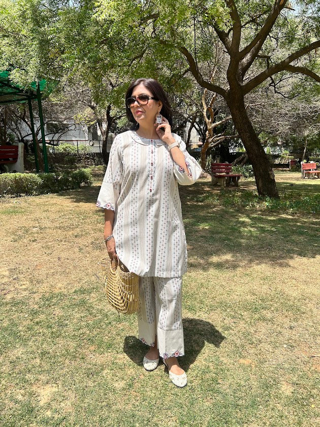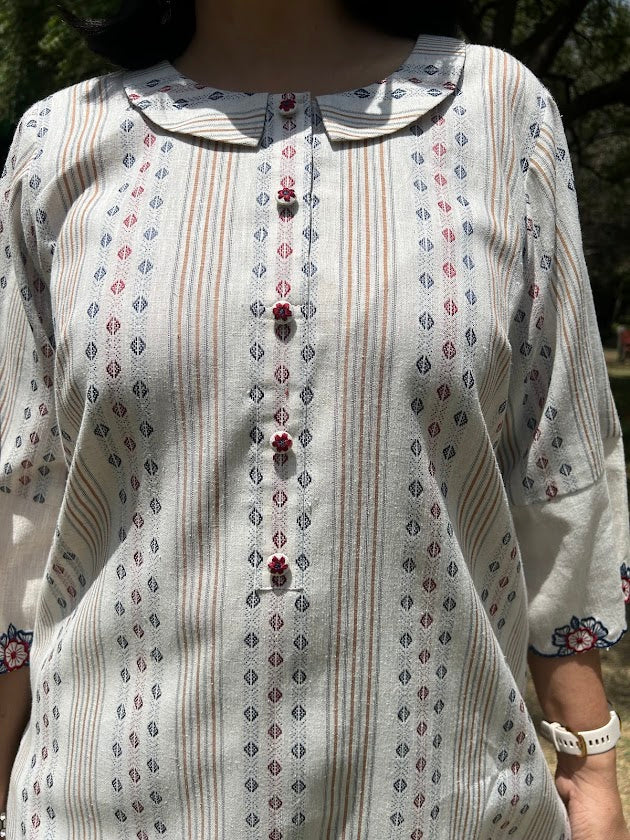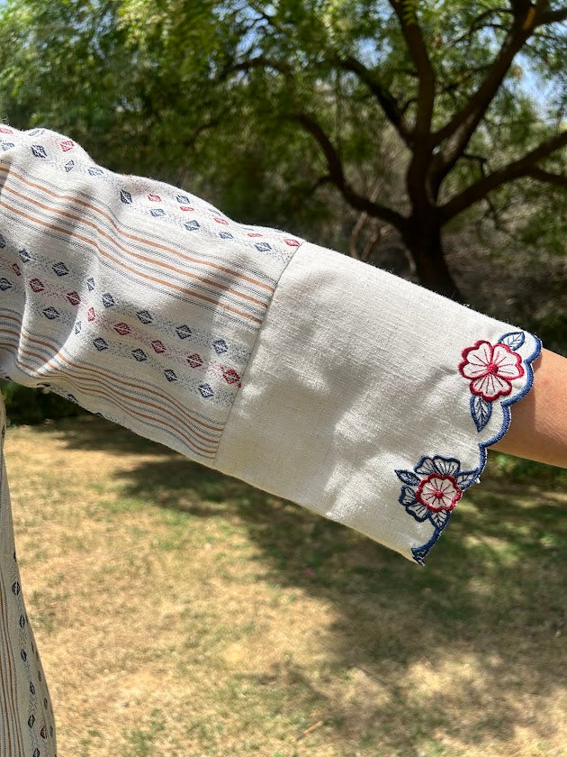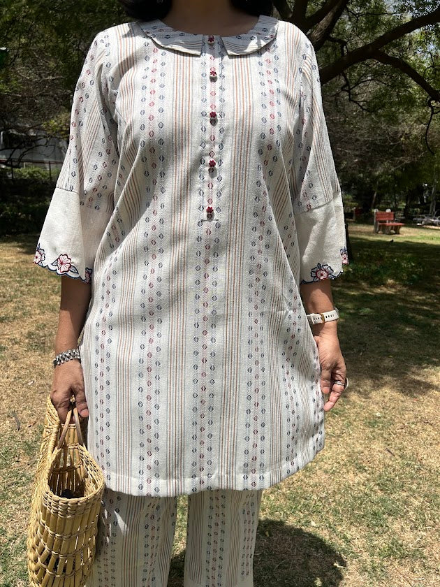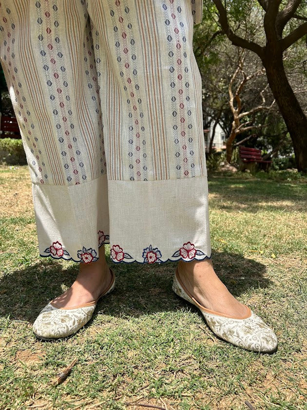 A beautiful Cotton linen striped co ord set with floral thread embroidery on the pants and sleeves with collar.
