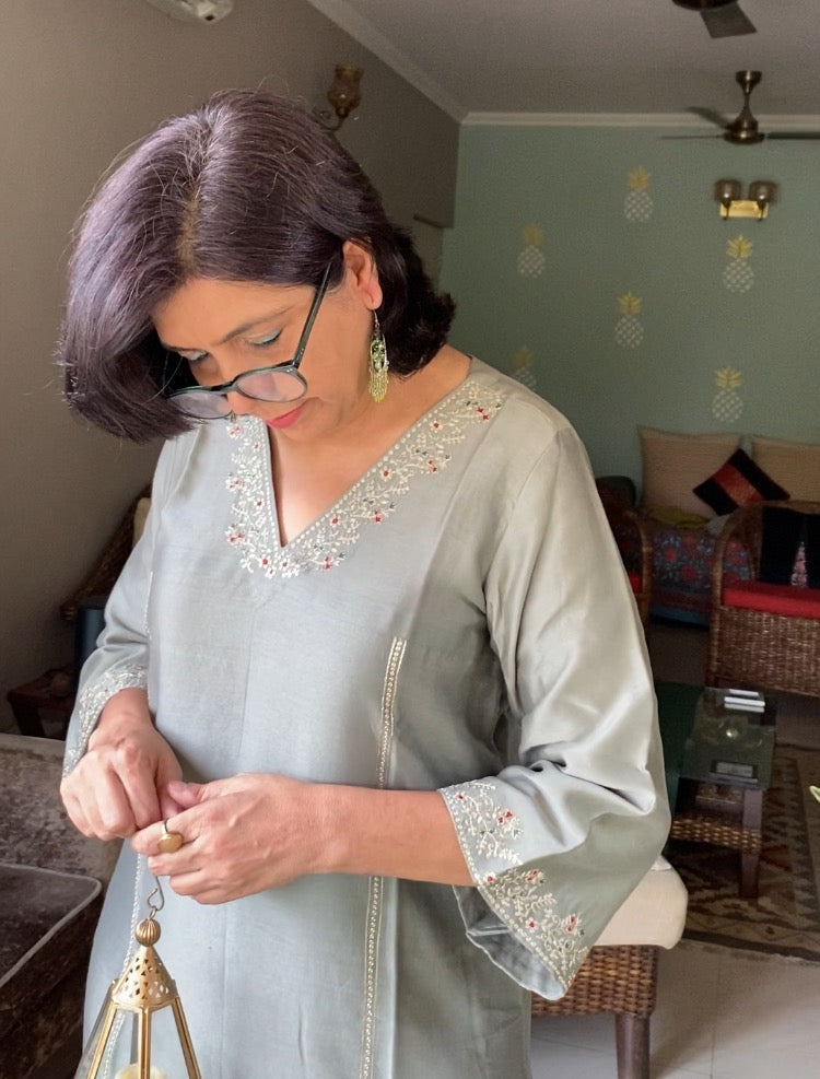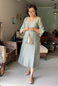 A chanderi silk dress with lining with floral thread and tilla embroidery.