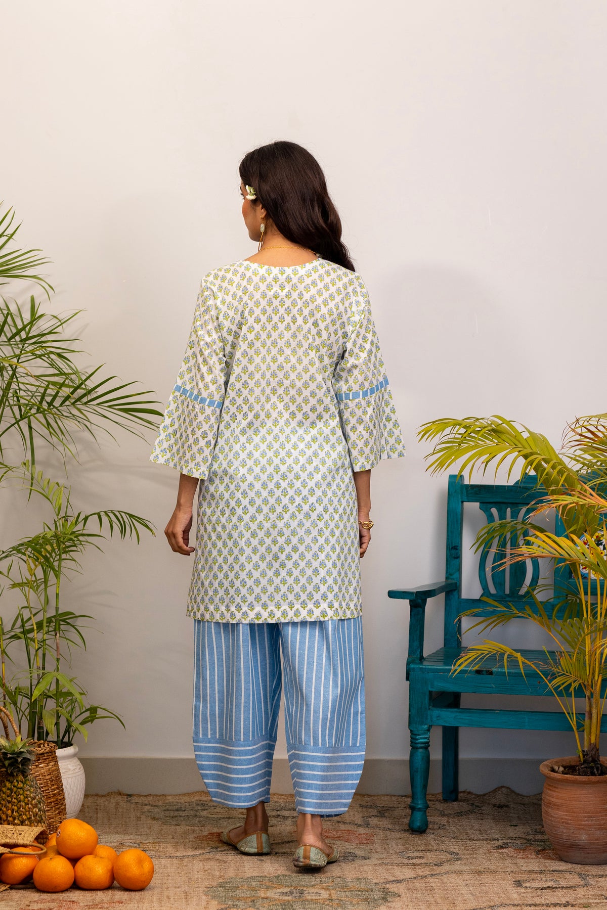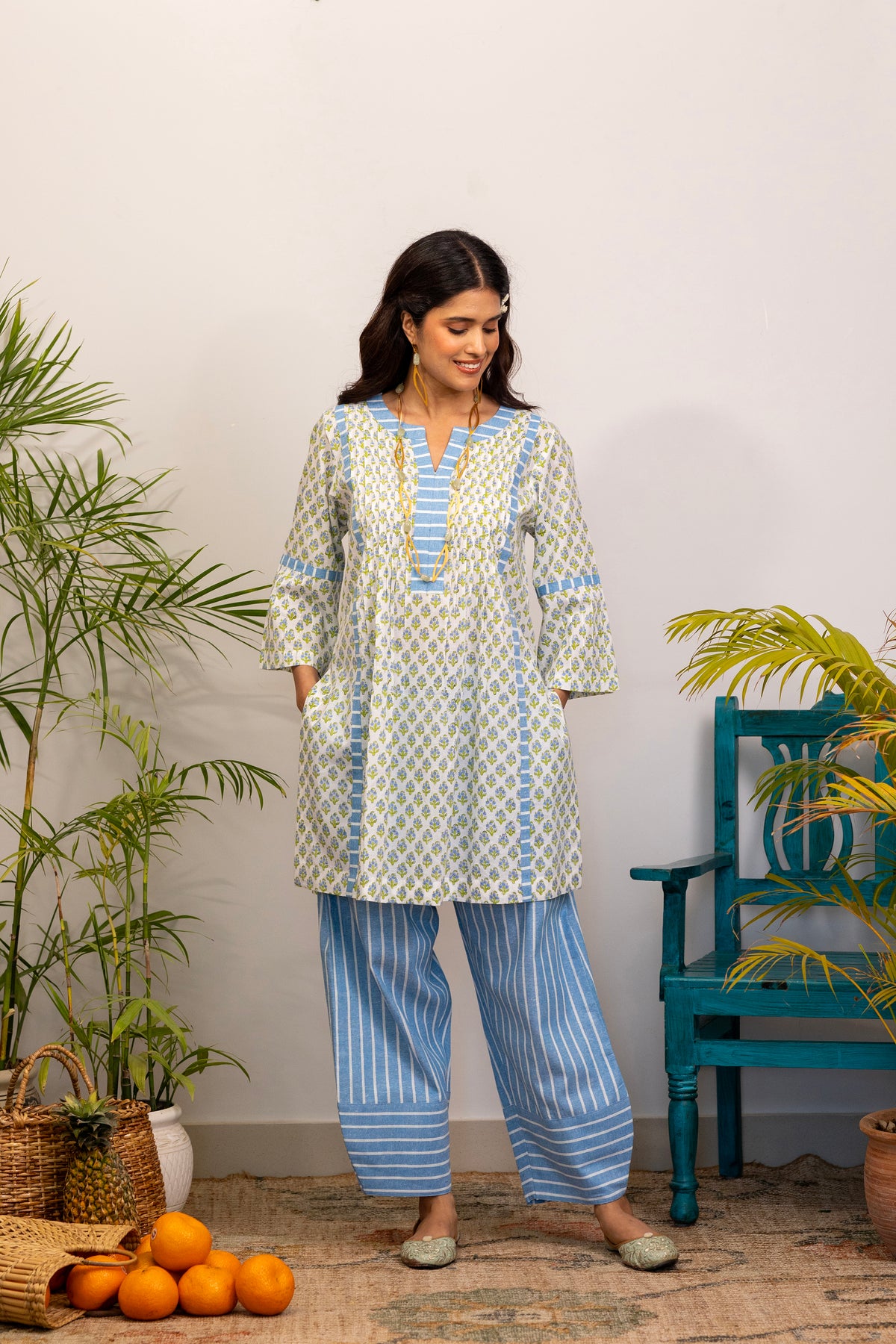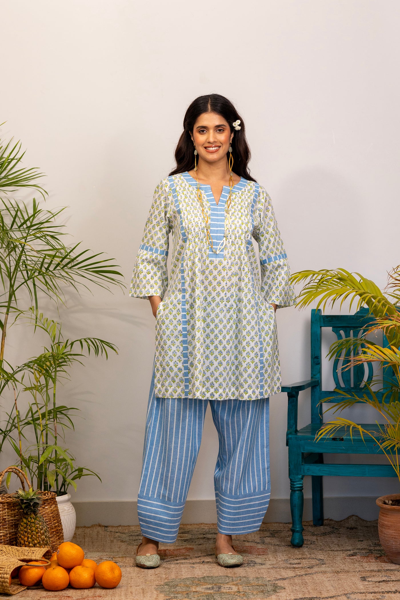 Features a gracefully tailored printed kurta, blending timeless charm with relaxed elegance.