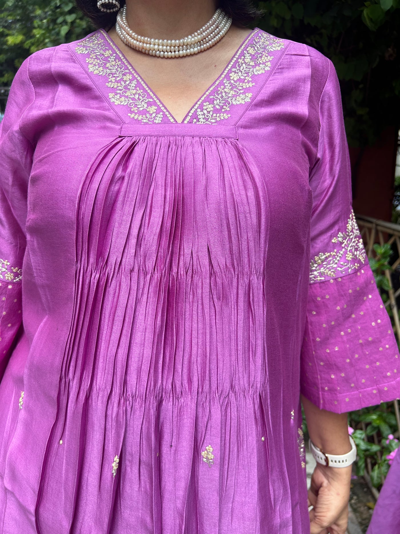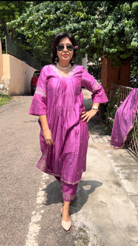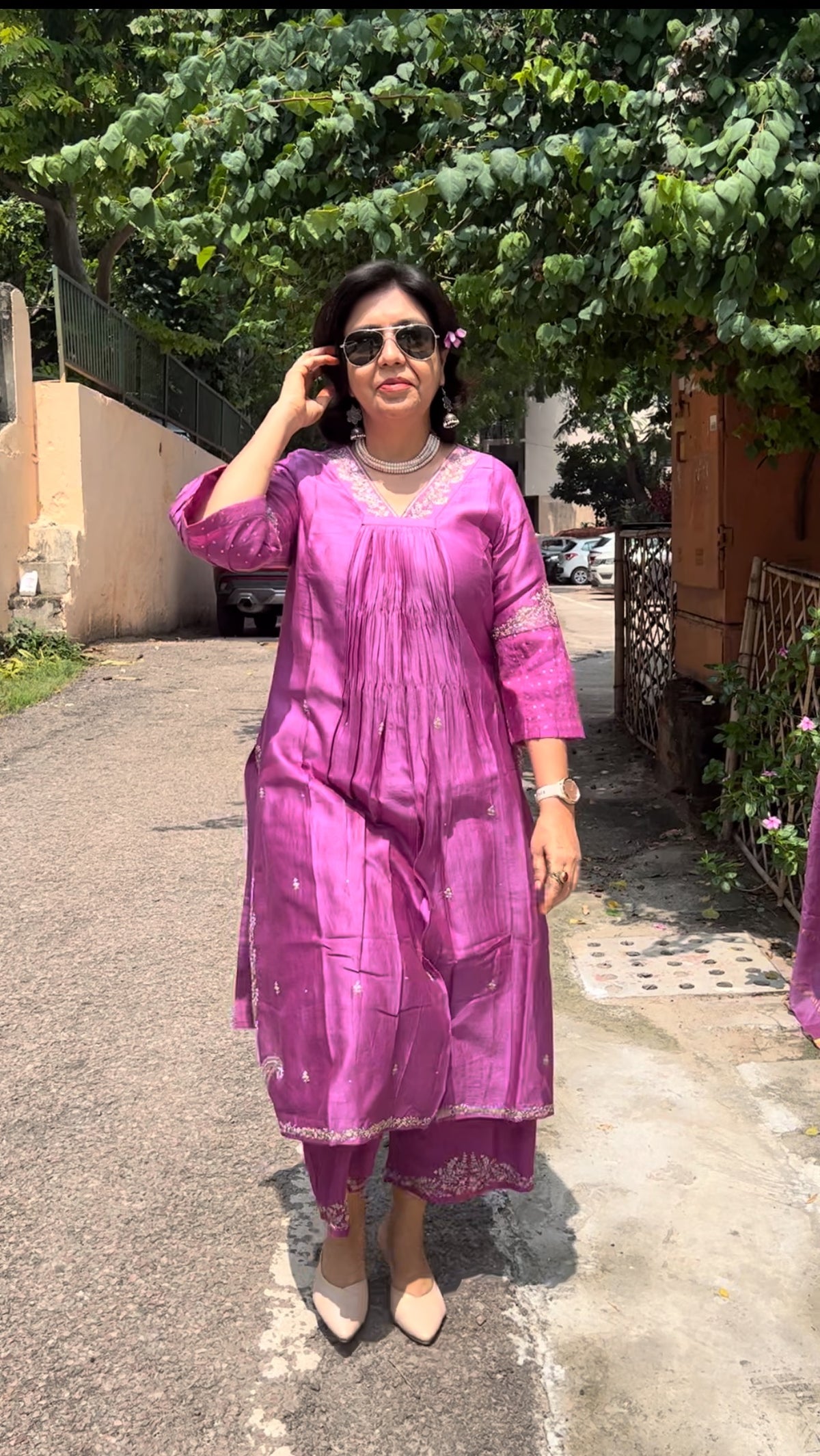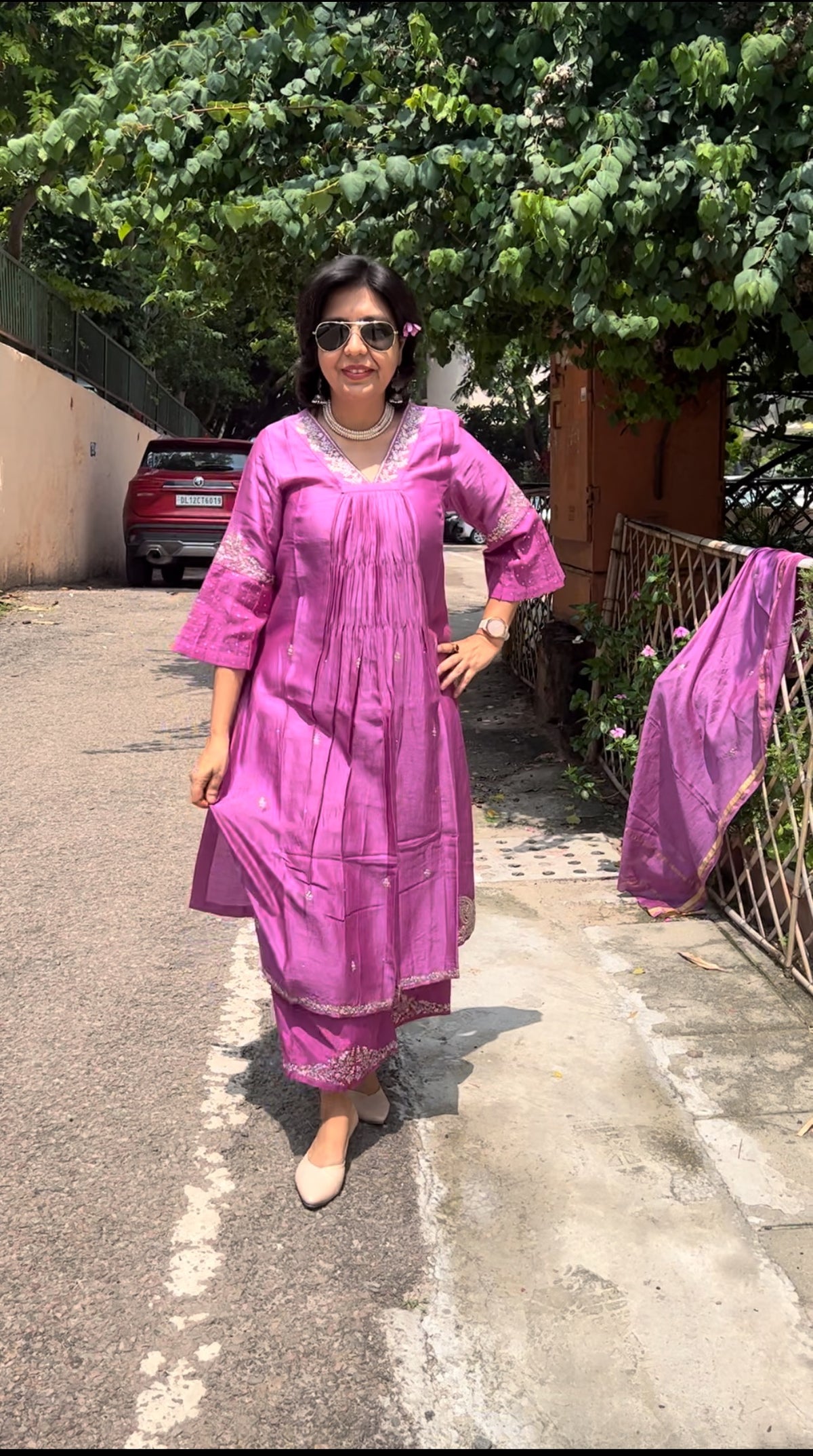 A pure Chanderi silk kurta with intricate floral and paisley tilla embroidery in gold and silver with is paired with a cotton silk bottom with embroidery and a pure Chanderi silk dupatta with bootis.