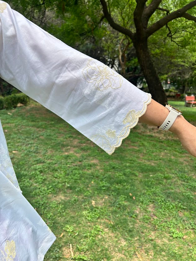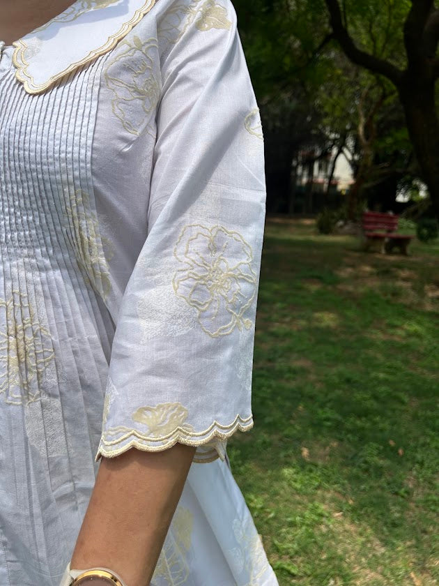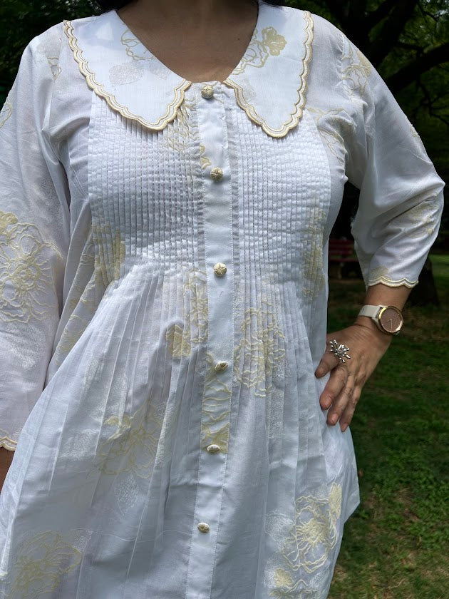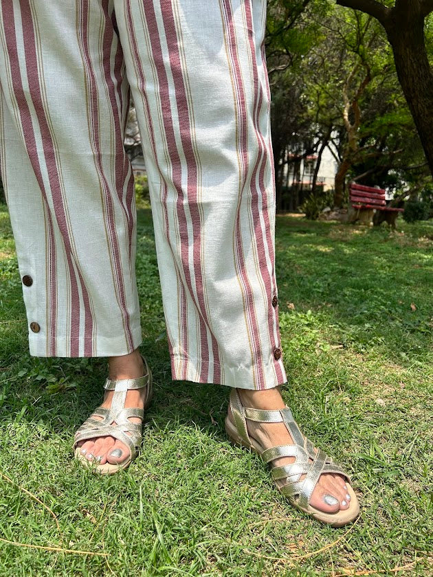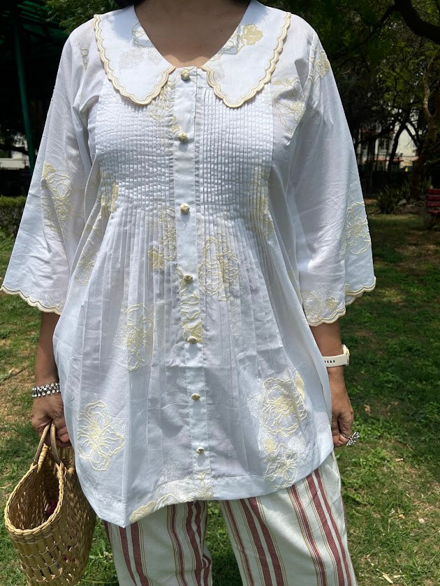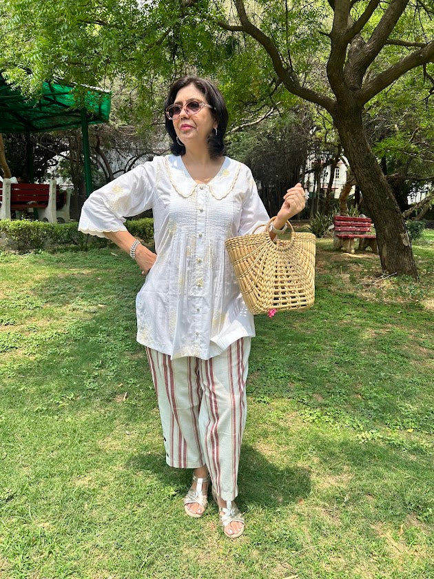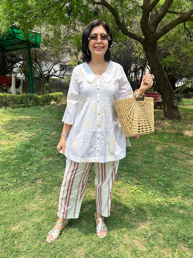 A pure cotton top with collar and scalloped edges and intricate pleating paired with striped cotton pants with pocket.