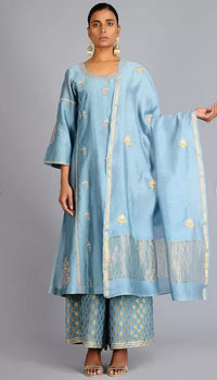 This is a Chanderi silk kurta with intricate Gota applique , tilla and multiple resham embroidery on the front , back and sleeves. It has a dupatta in Chanderi silk with Gota embroidery and banarasi georgette palazzos with gota edging.