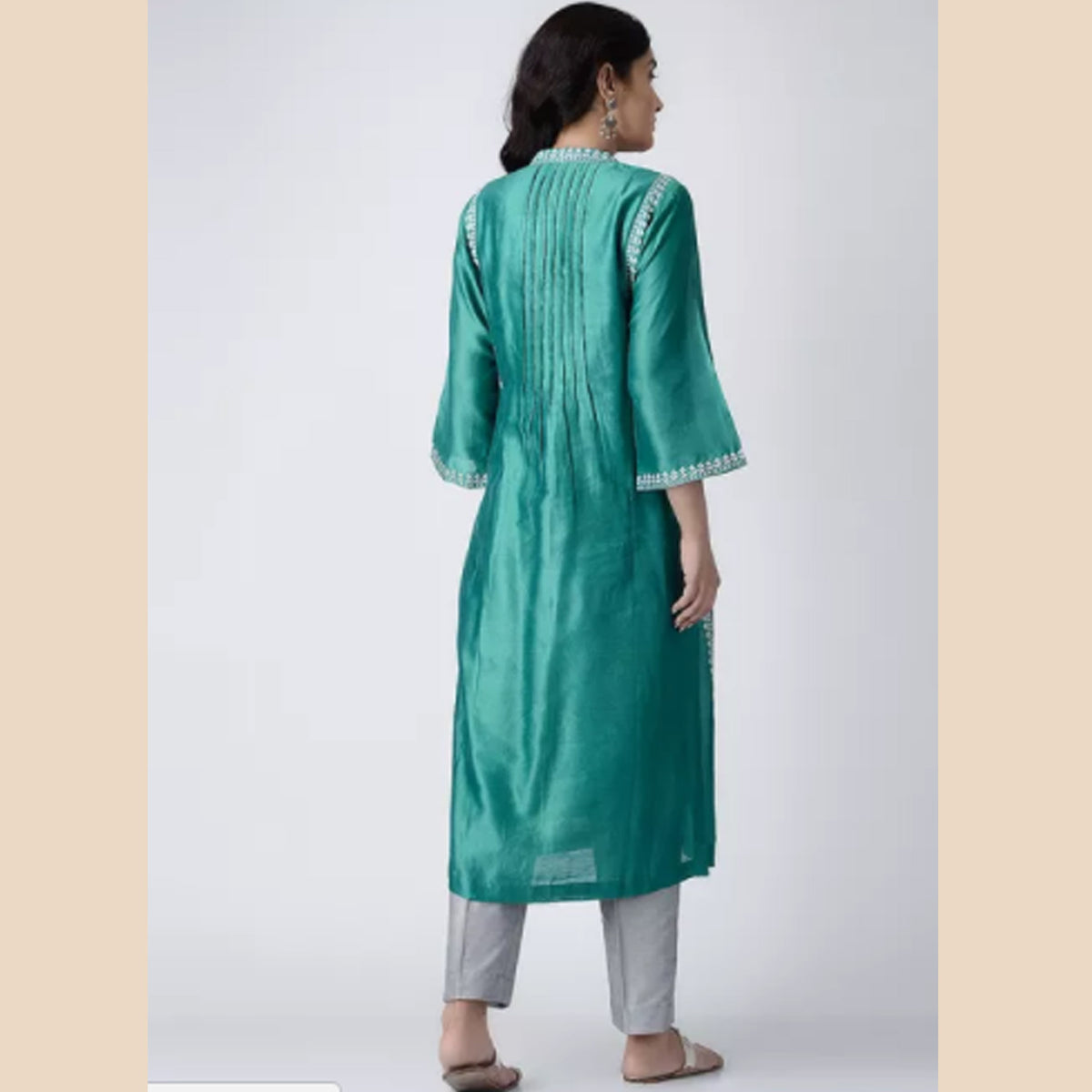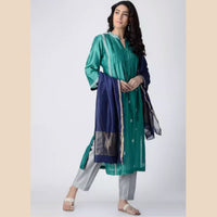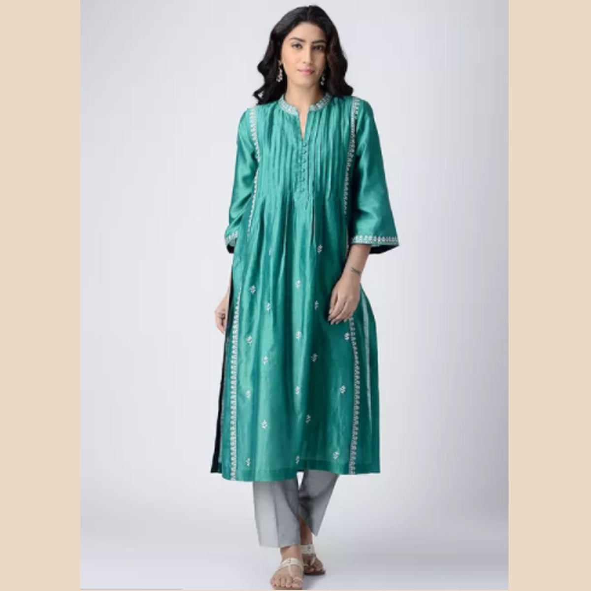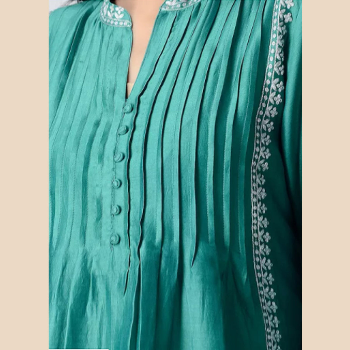 A pure chanderi silk kurta with tilla embroidery n pleating is paired with a cotton silk bottom n chanderi silk dupatta.