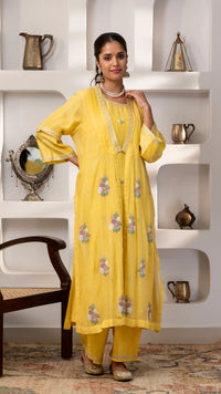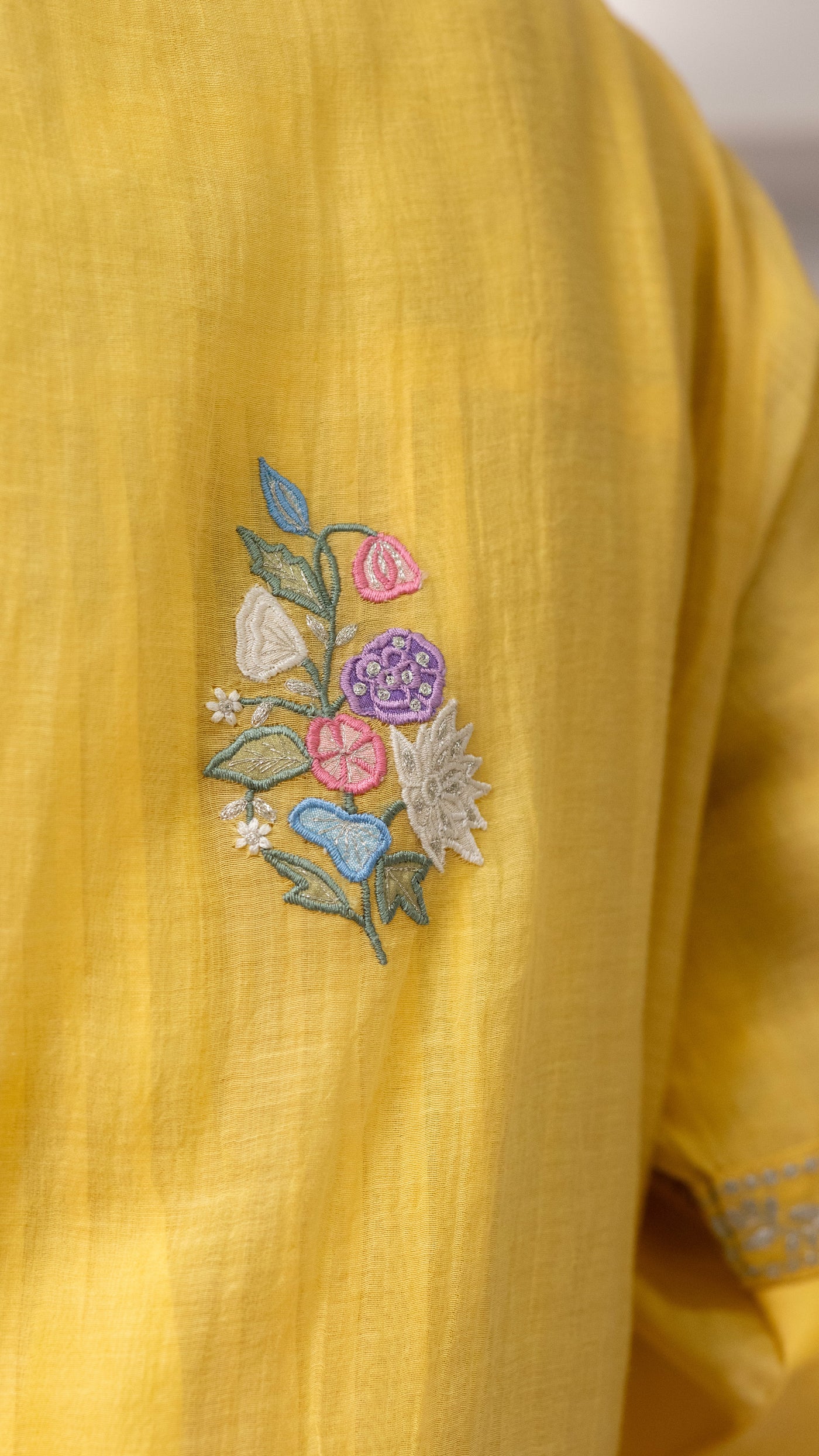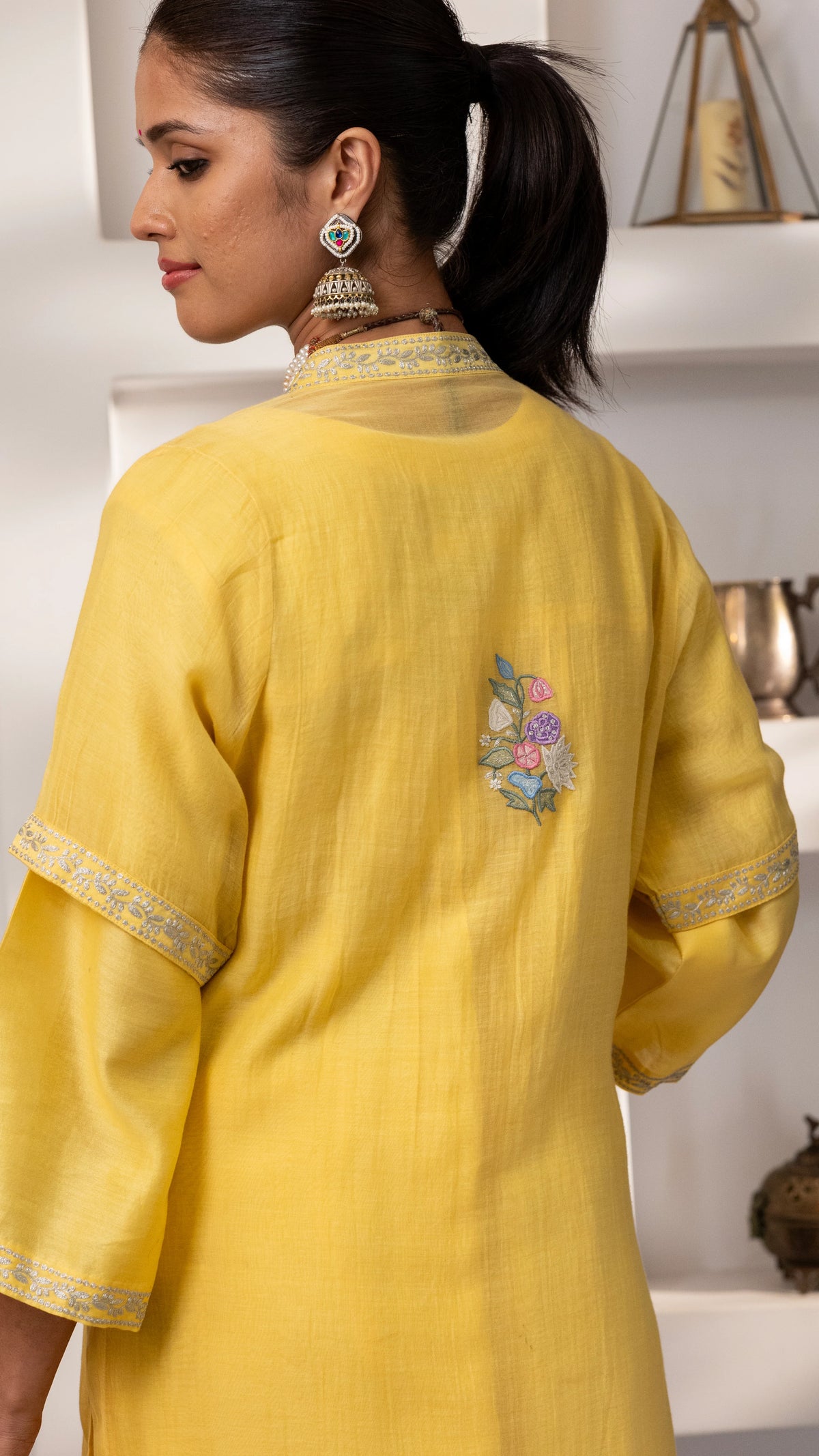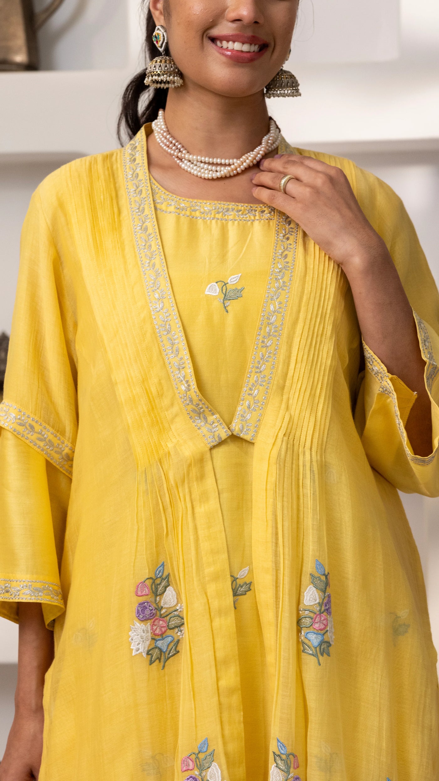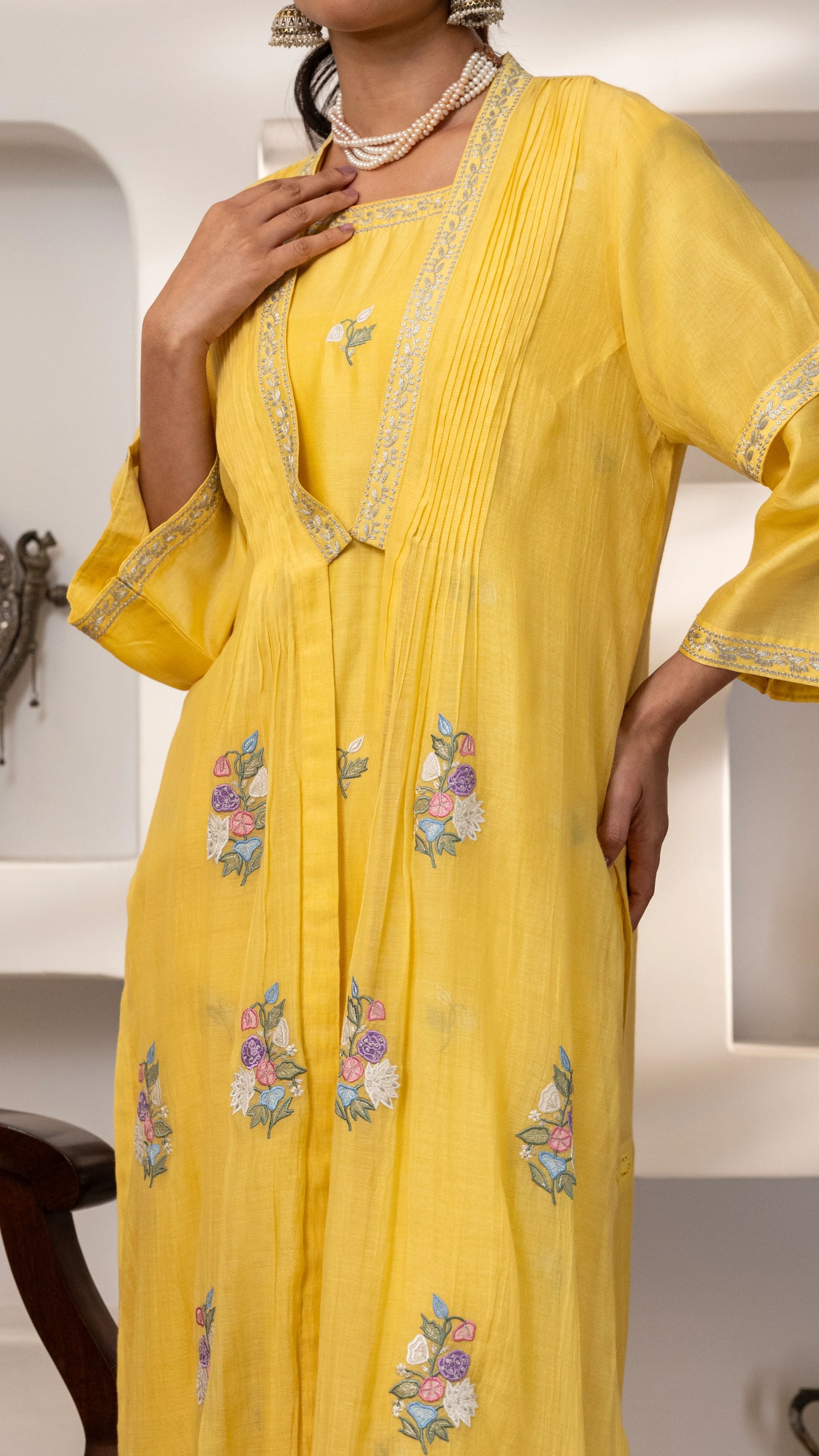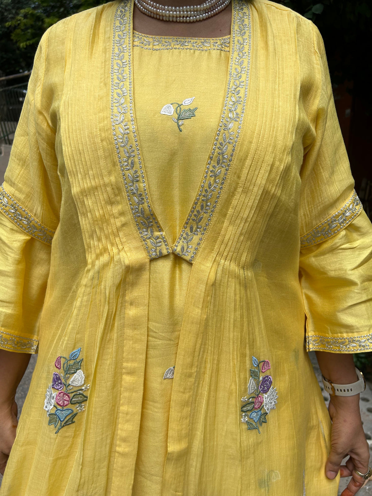 A pure Chanderi silk overlay with pleating detailing and floral appliqué and tilla embroidery.
