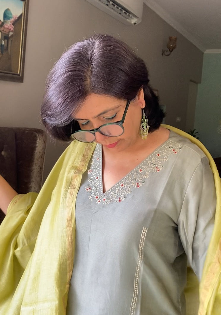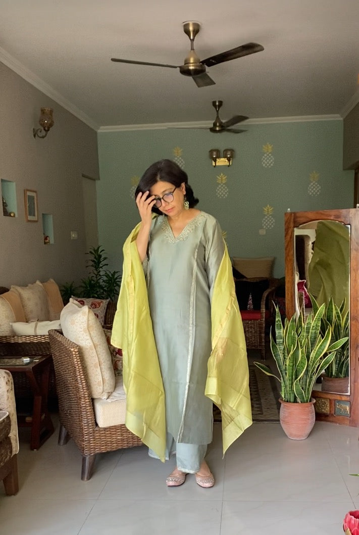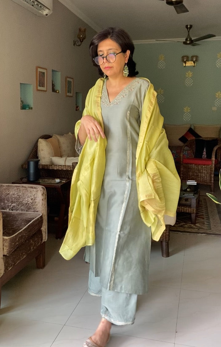 A Kurta in chanderi silk with lining with tilla and thread embroidery is paired with a cotton silk palazzos with embroidery. Dupatta in contrast colour in chanderi silk.