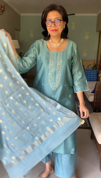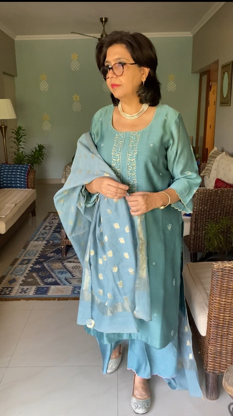 This is a pure chanderi silk kurta with intricate dori and gold tilla embroidery paired with a cotton silk bottom with scalloped edges is paired with a Banarasi dupatta.